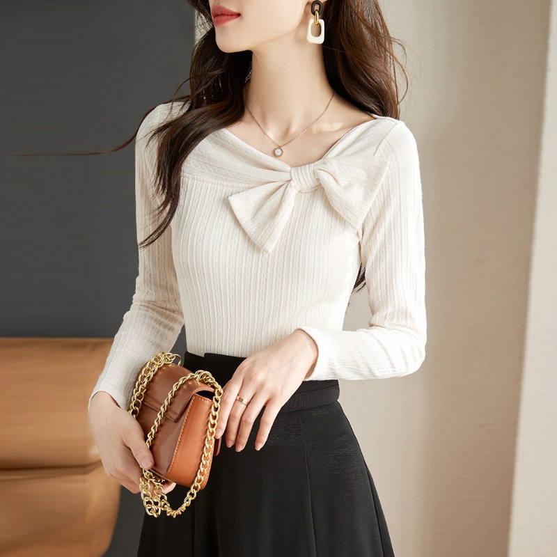 Трикотажный лонгслив с бантиком, осенний дизайнерский приталенный базовый свитер, французский стиль, коллекция 2023, тренд сезона