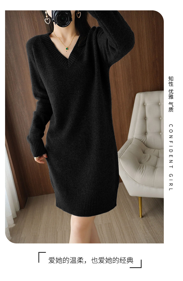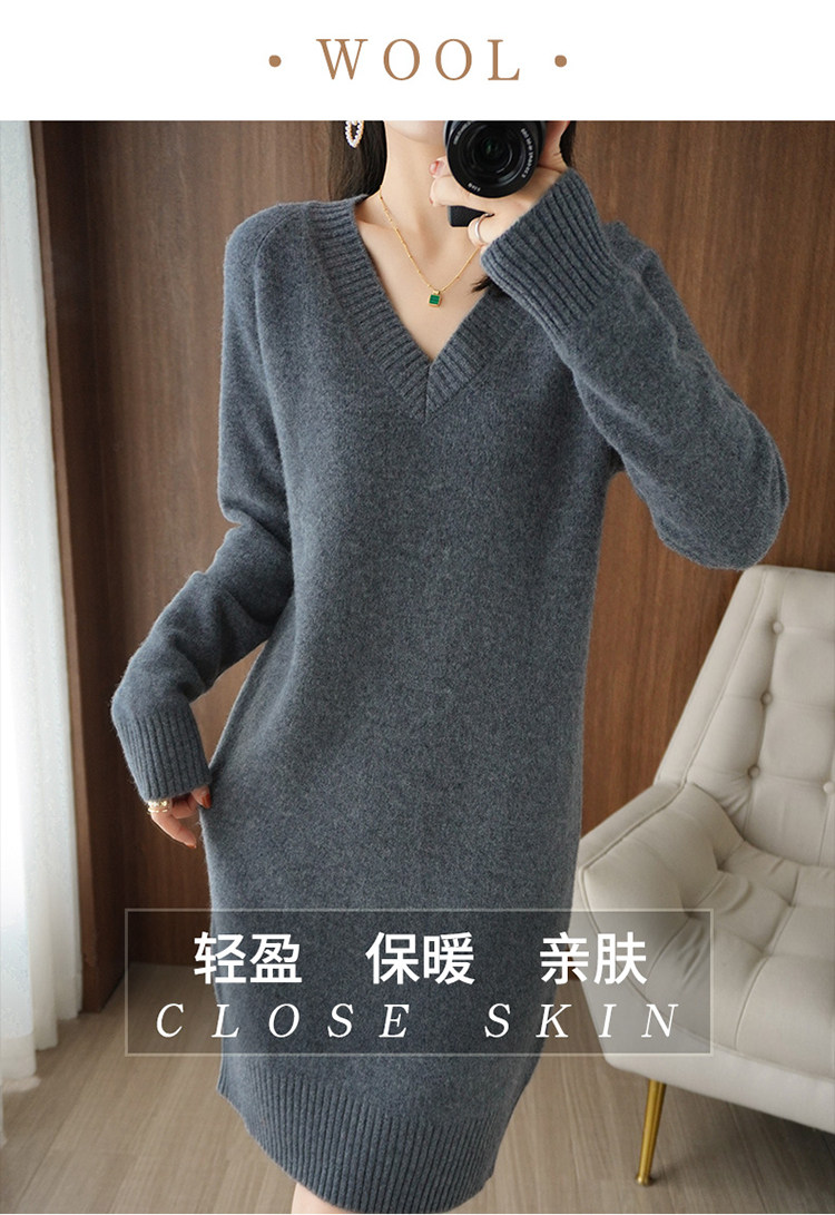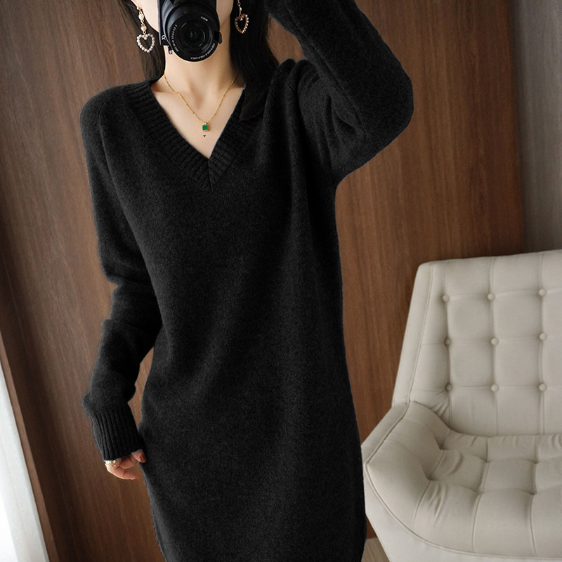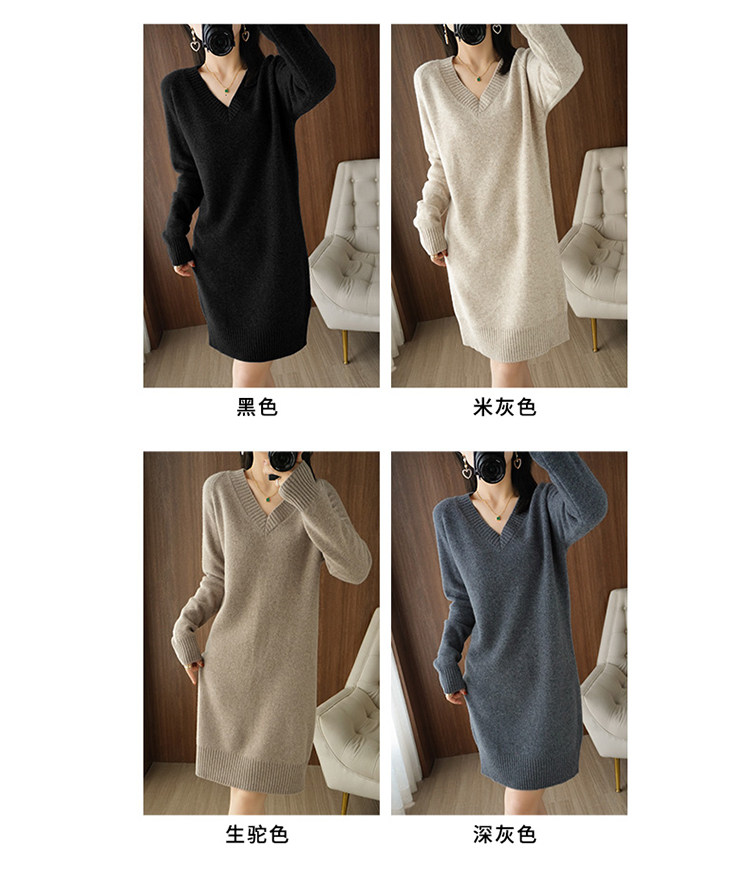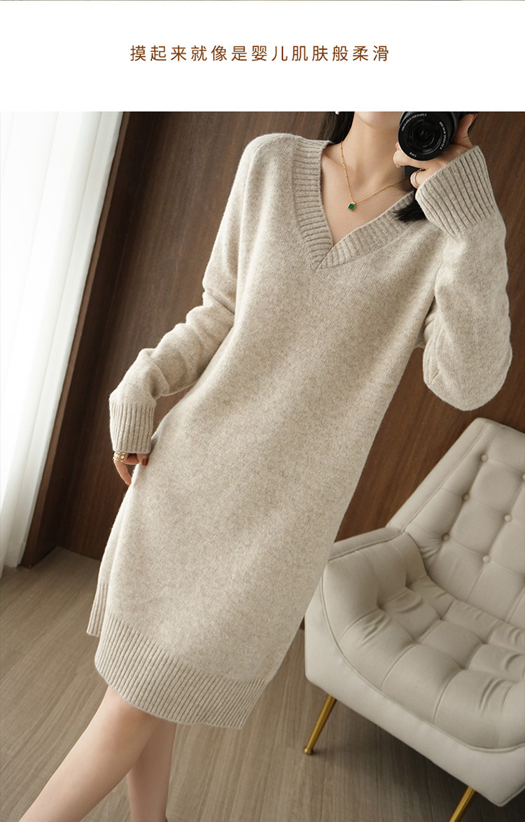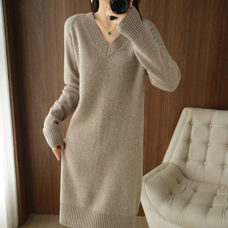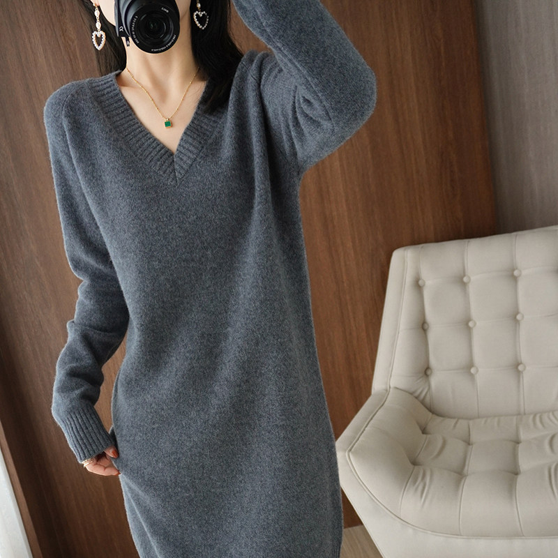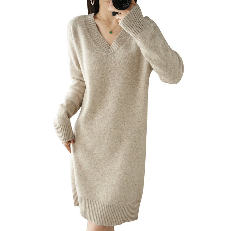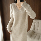 Кашемировое демисезонное длинное шерстяное платье, свитер, шерстяное базовое приятное телу трикотажное платье, V-образный вырез, средней длины, оверсайз, свободный крой