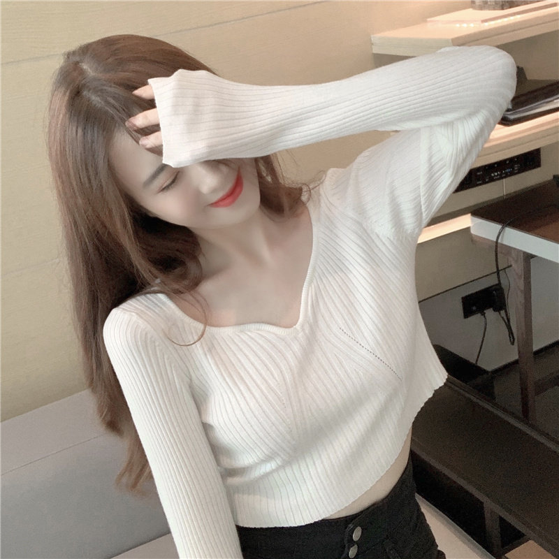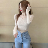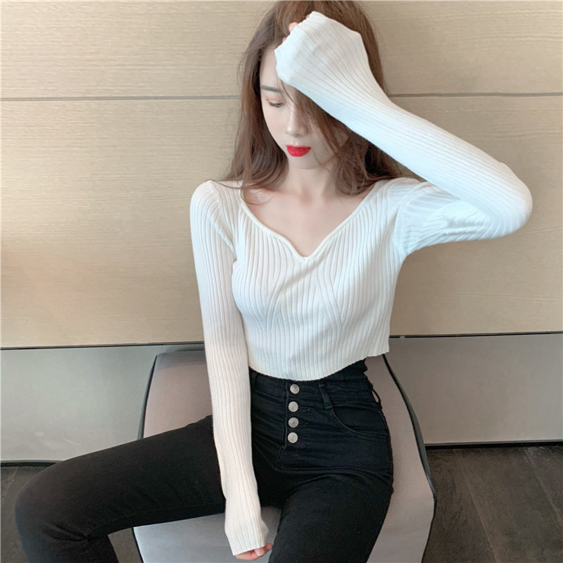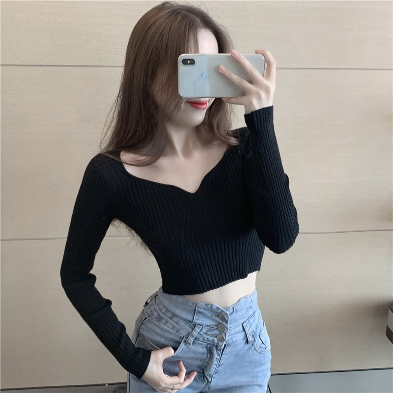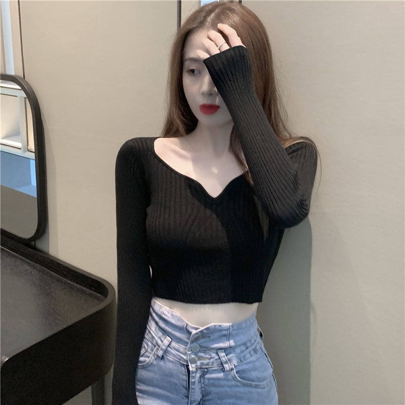 Трикотажный модный короткий свитер, в западном стиле, V-образный вырез, высокая талия
