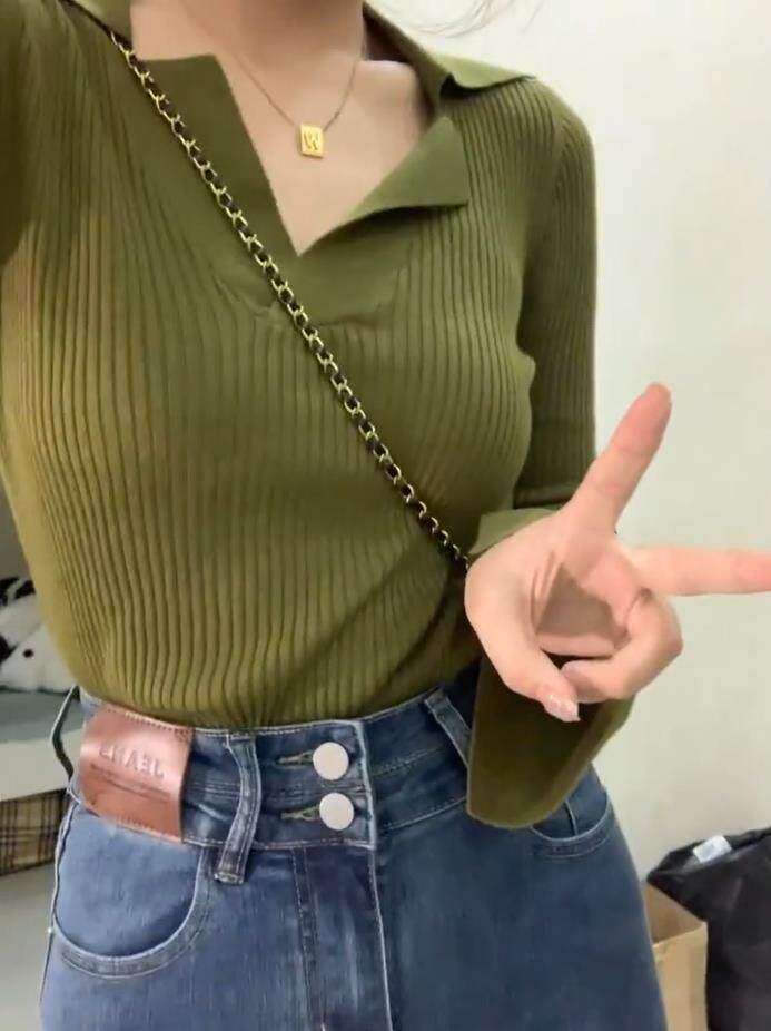 Зеленый трикотажный демисезонный небольшой дизайнерский свитер, базовый приятный телу лонгслив, V-образный вырез, тренд сезона