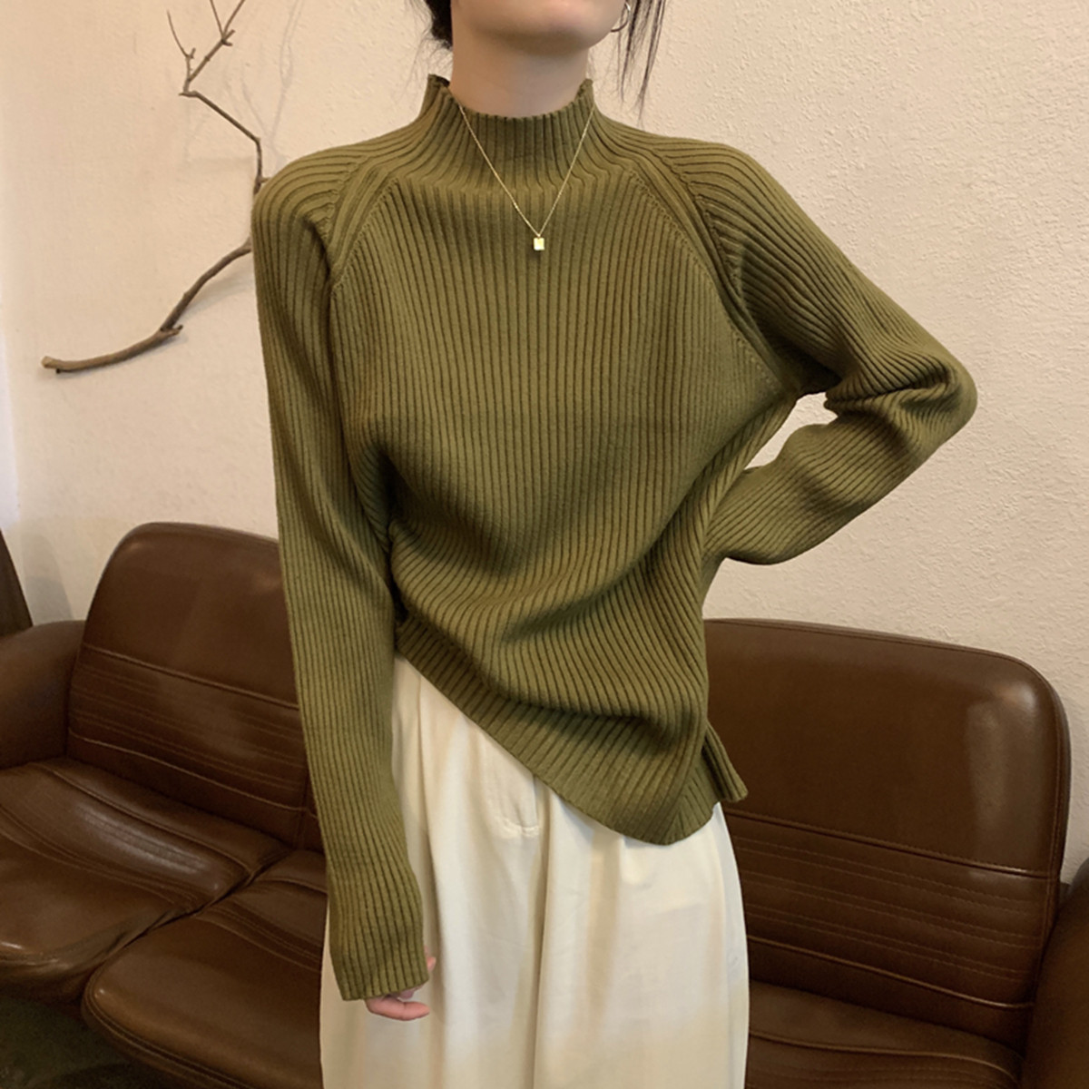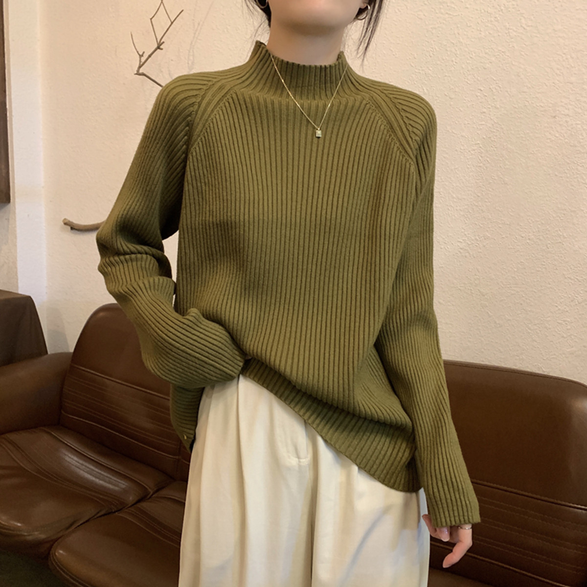 Зеленый цветной базовый весенний свитер, длинное пальто, лонгслив, высокий воротник, увеличенная толщина, средней длины