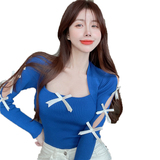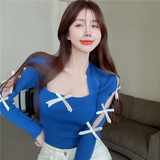 Осенняя дизайнерская футболка, трикотажный лонгслив с бантиком, свитер, коллекция 2022, тренд сезона, квадратный вырез