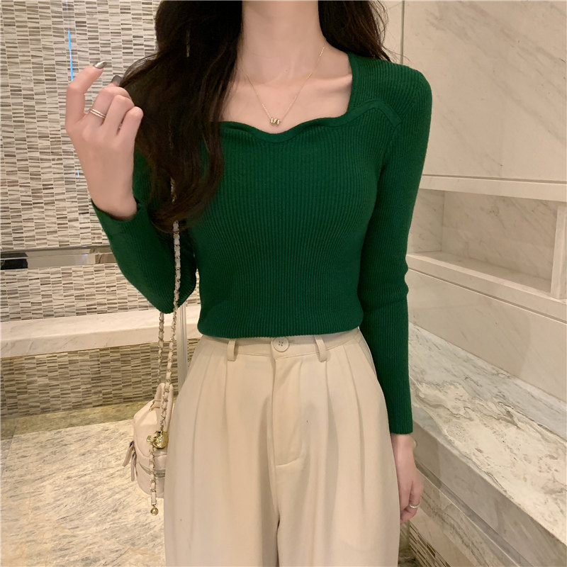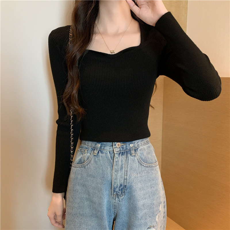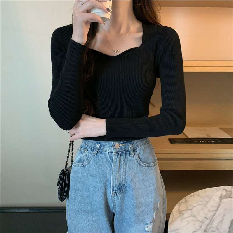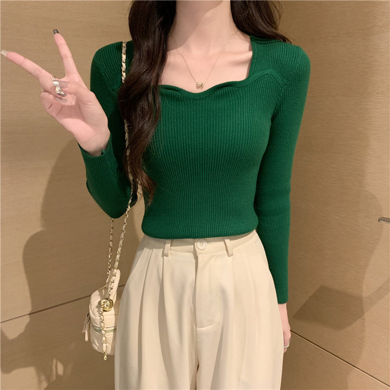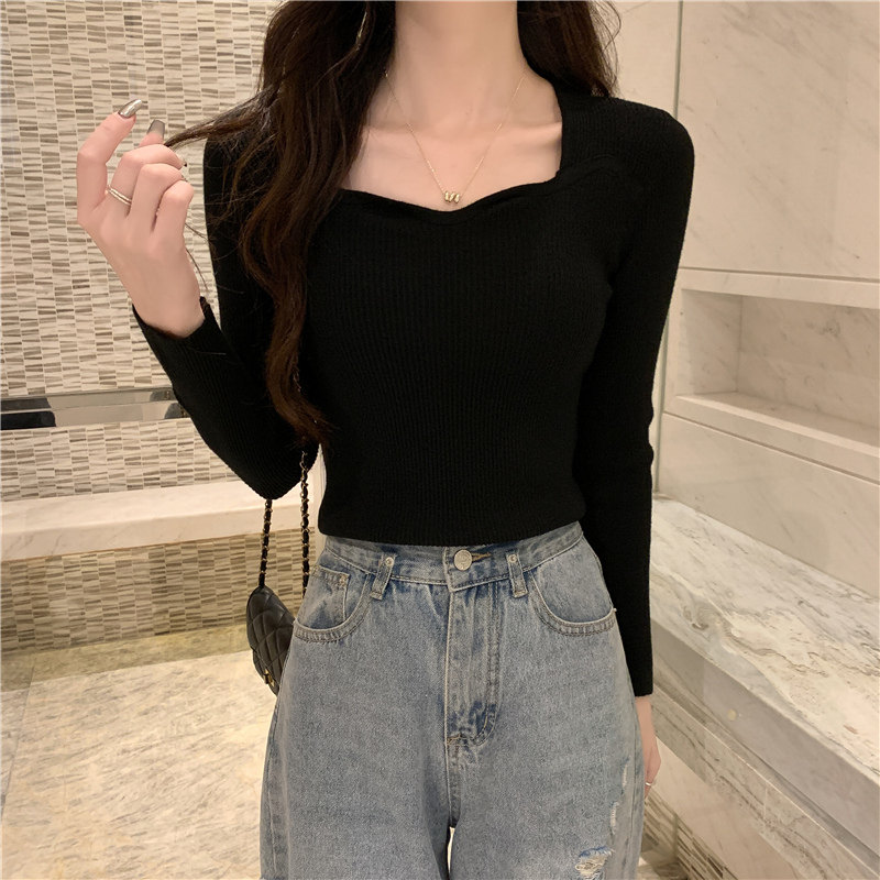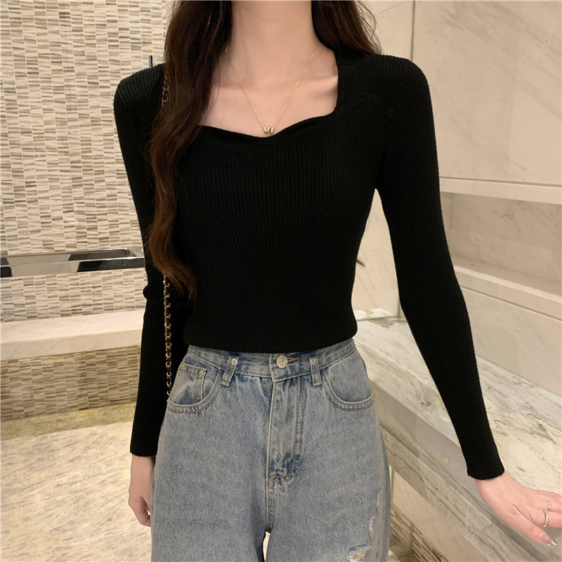 Демисезонный свитер, модный приталенный трикотажный лонгслив, французский стиль, квадратный вырез, в западном стиле