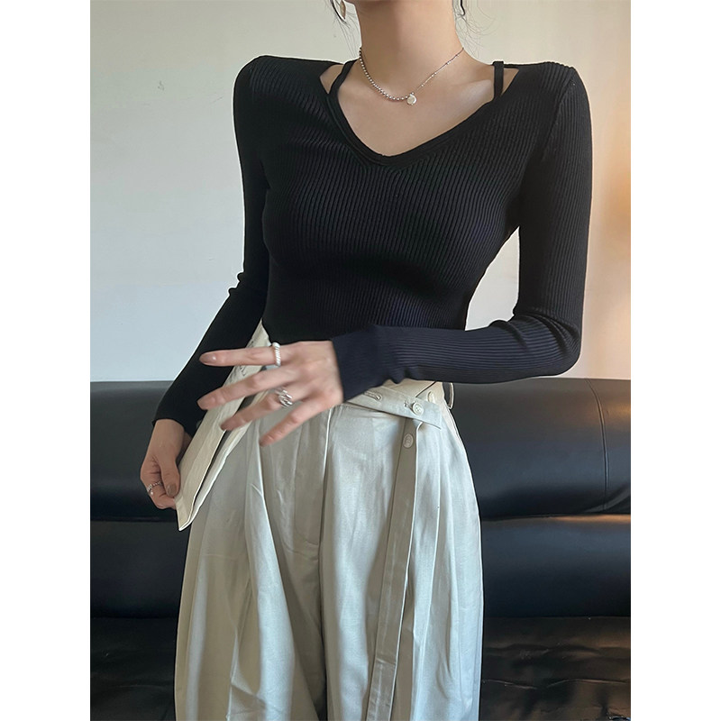 Комплект, трикотажный осенний приталенный базовый приятный телу свитер, V-образный вырез