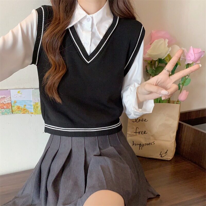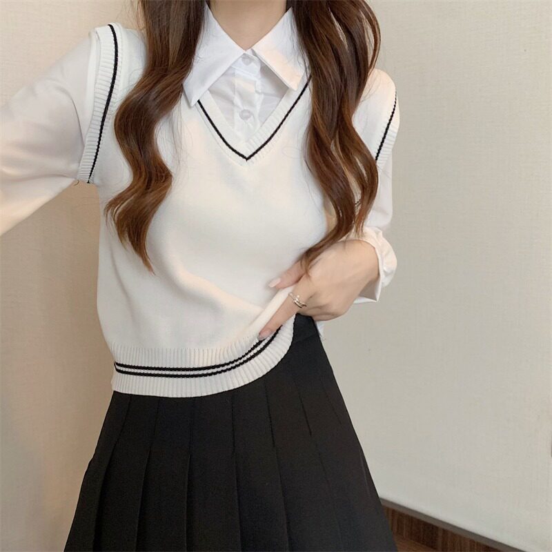 Осенний комплект, трикотажный жилет, лонгслив, дизайнерский свитер, короткая рубашка, воротник поло, тренд сезона