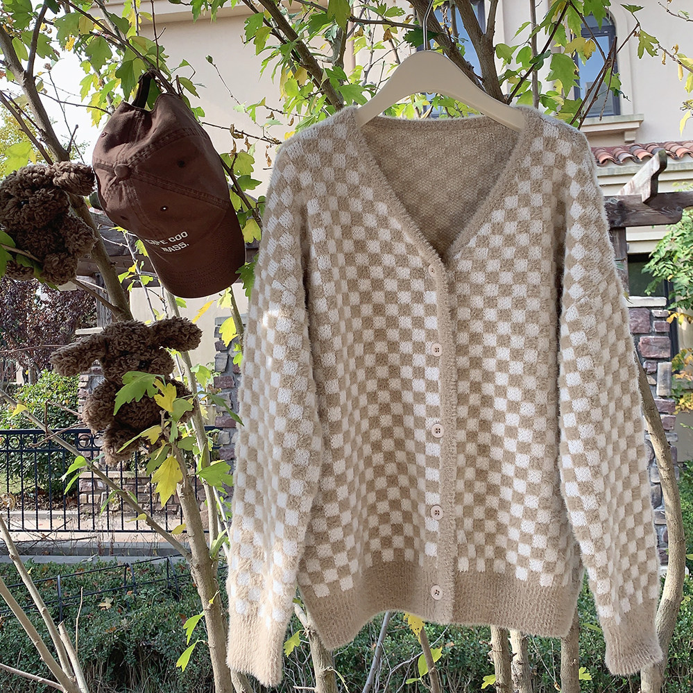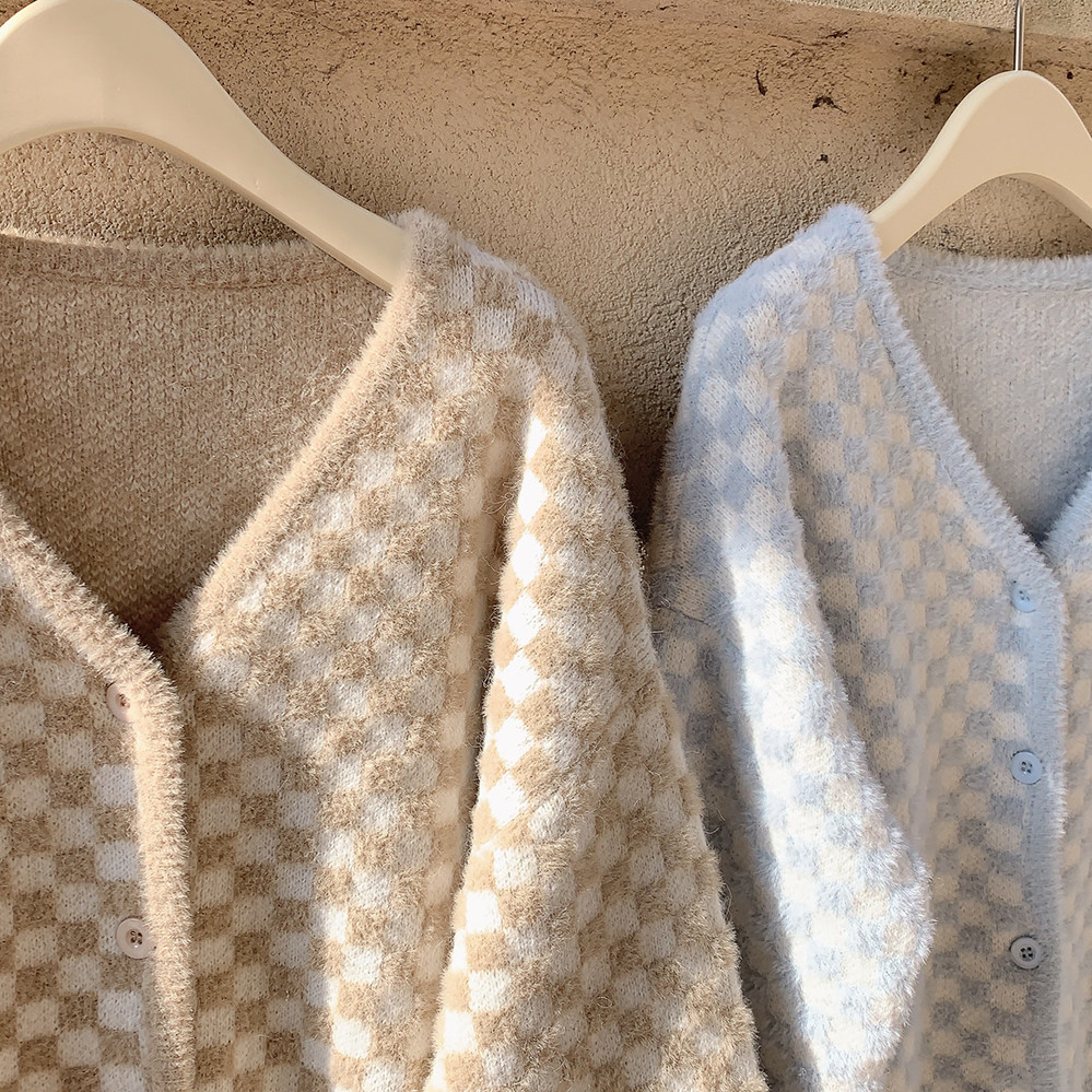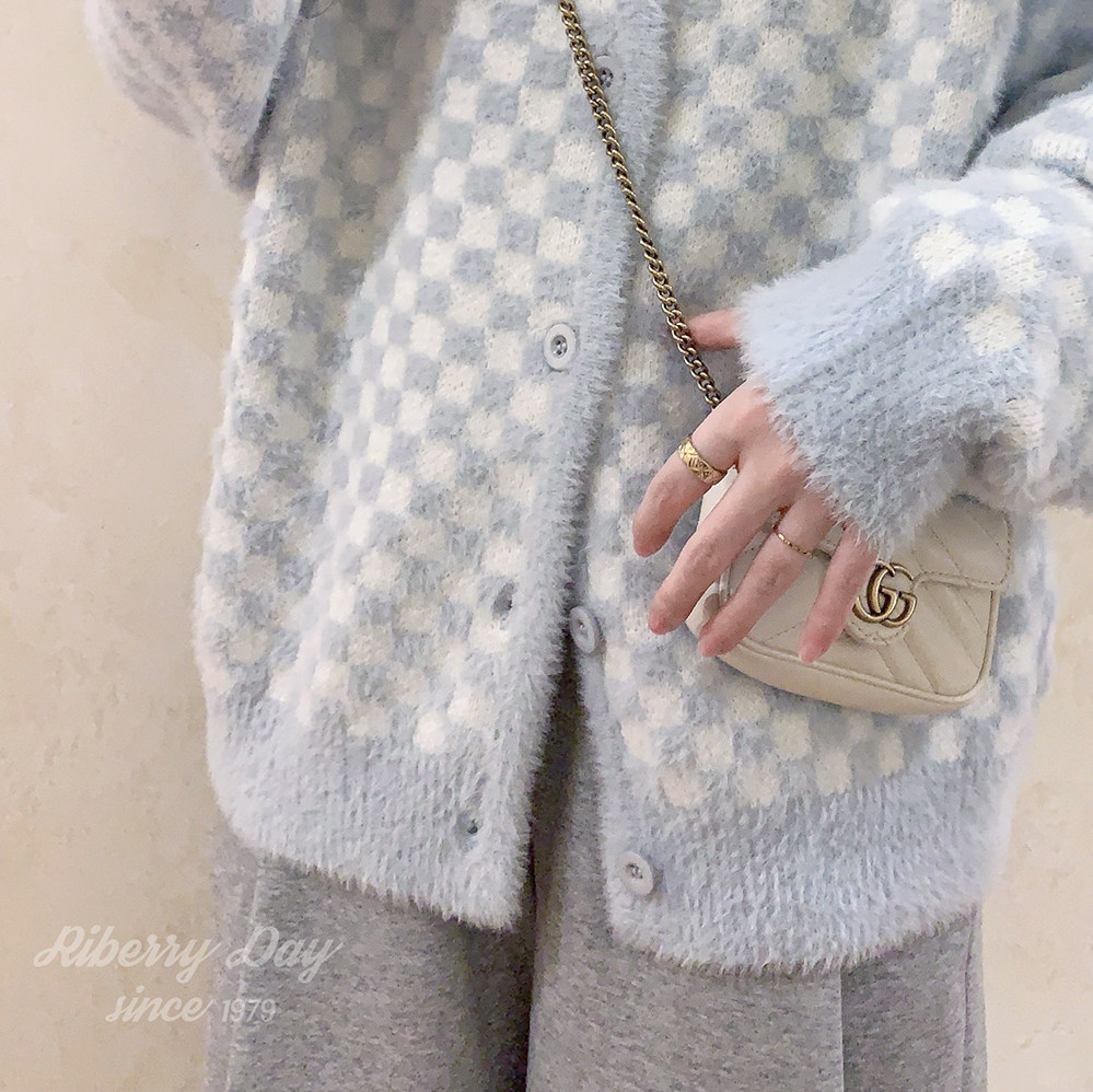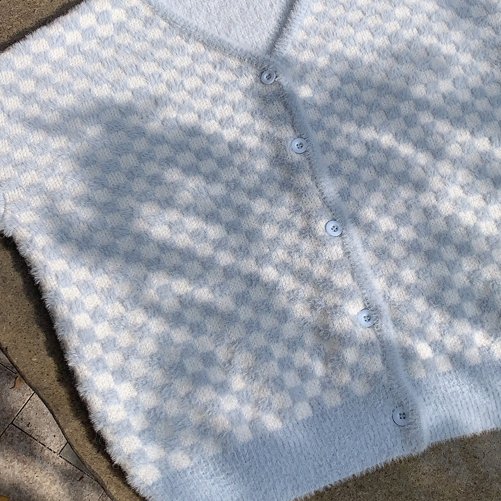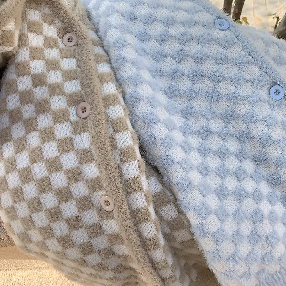 Бархатные синие белые шахматы, цветной трикотажный кардиган, свитер, искусственный мех, свободный крой
