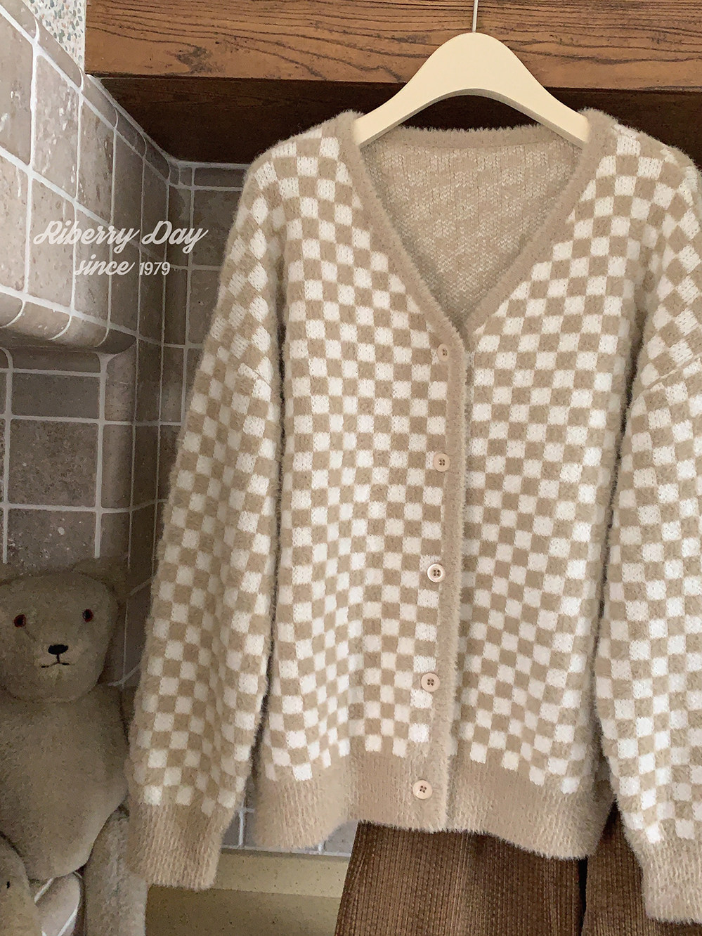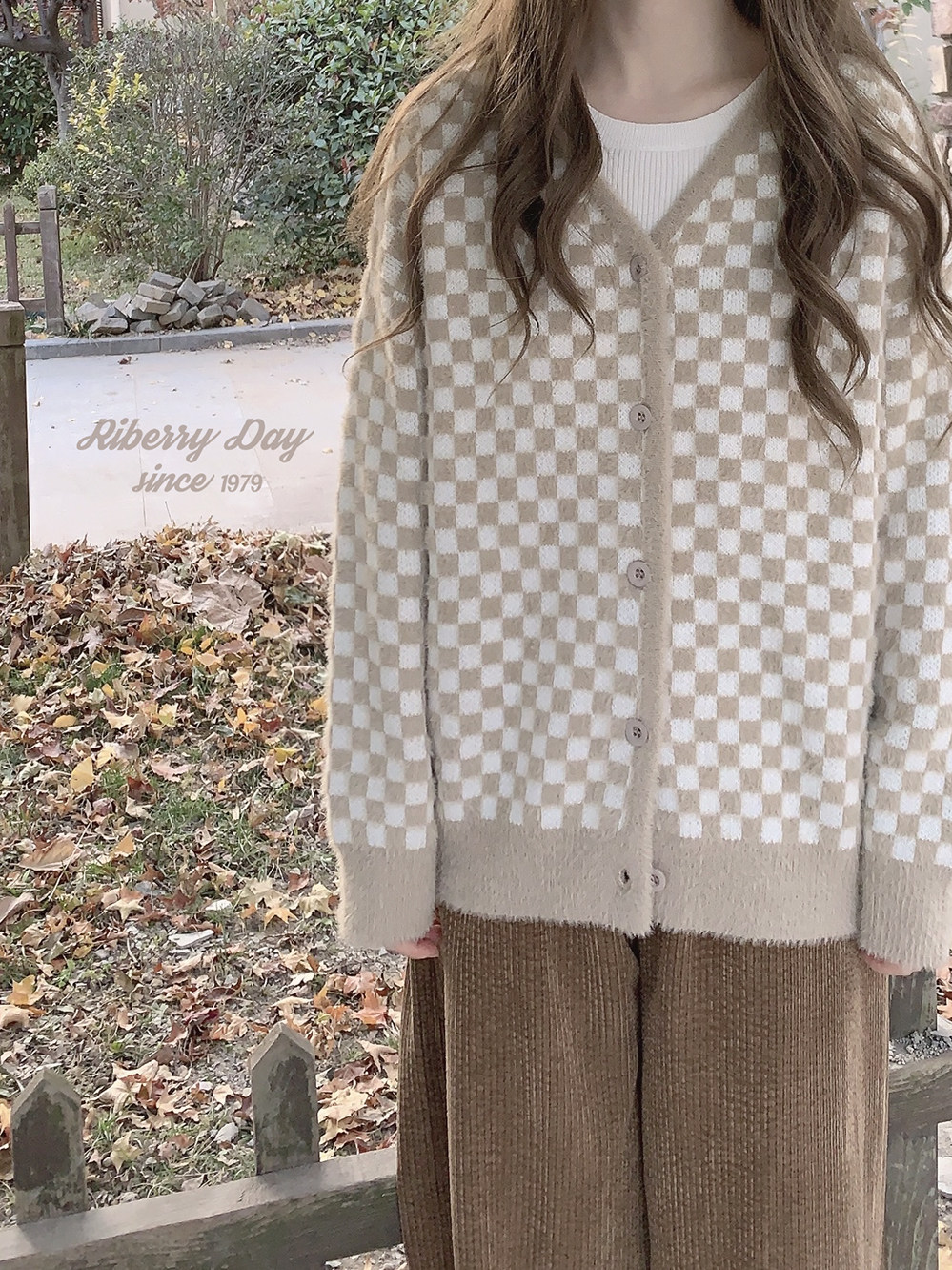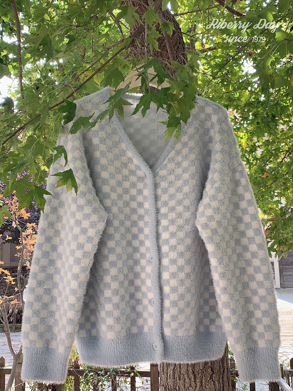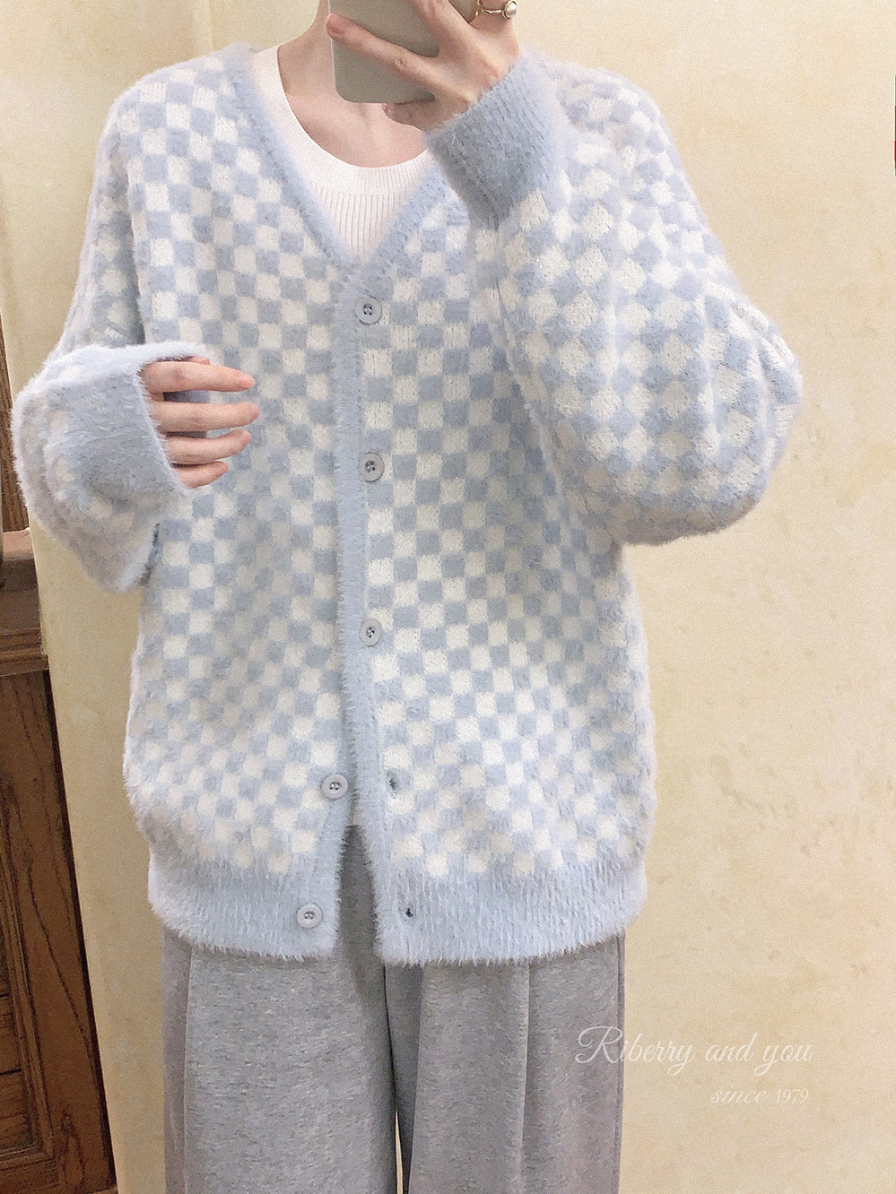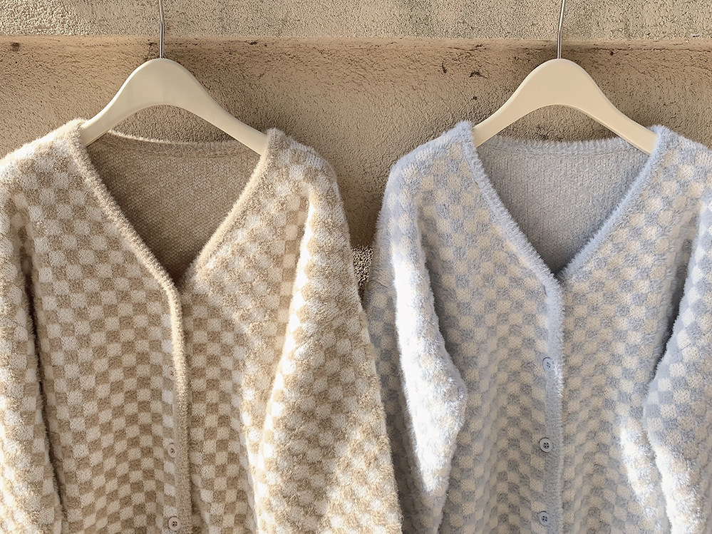 Бархатные синие белые шахматы, цветной трикотажный кардиган, свитер, искусственный мех, свободный крой