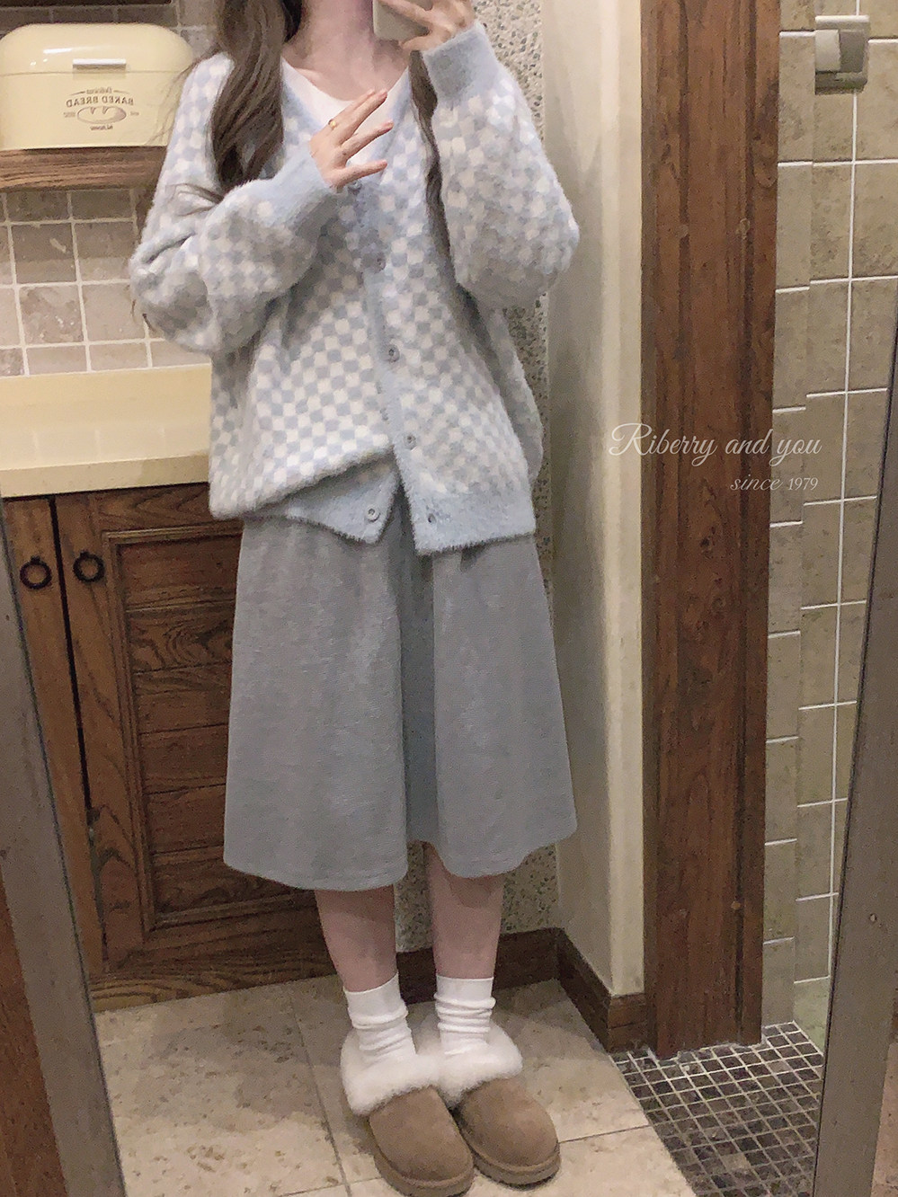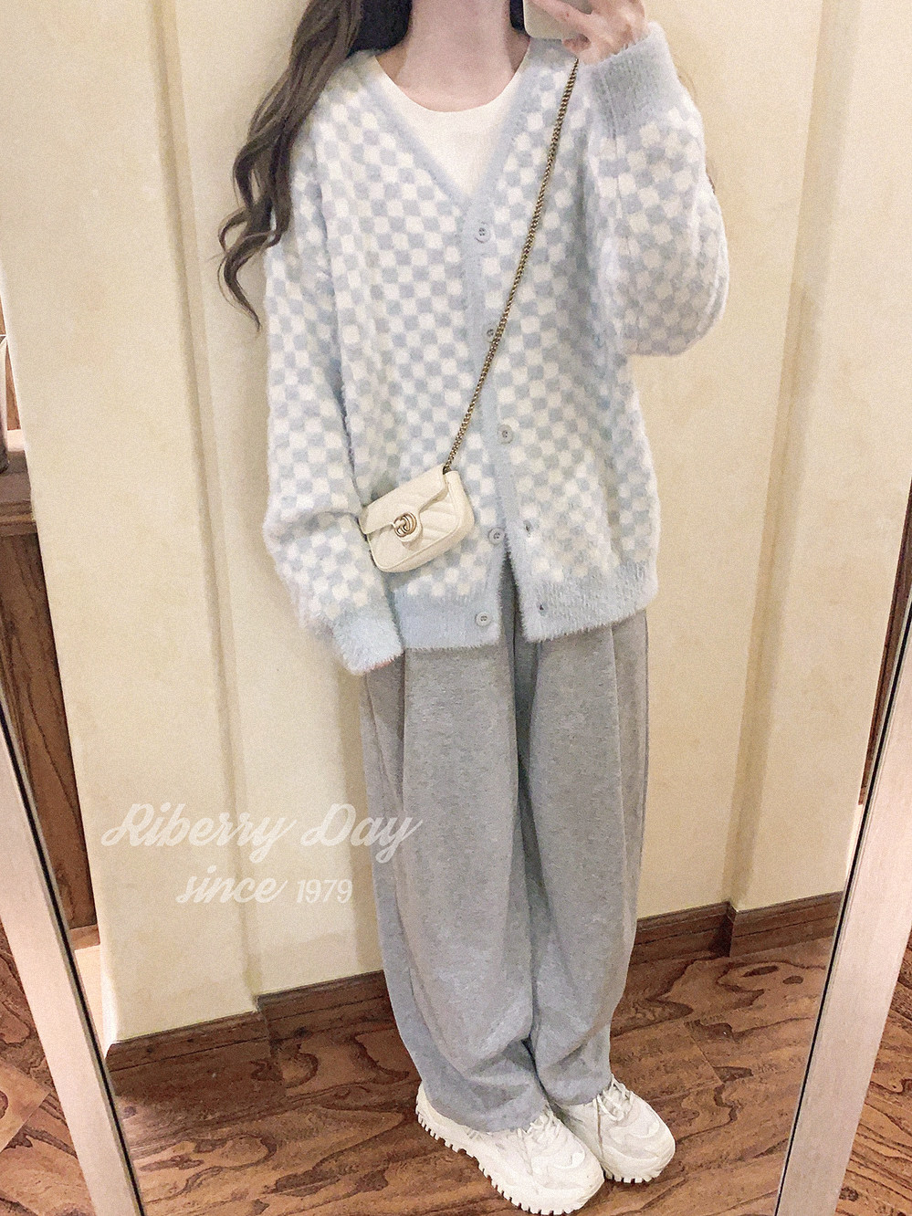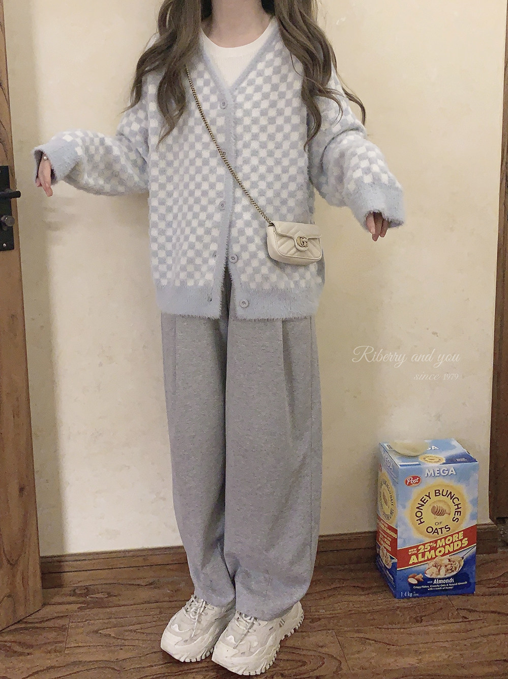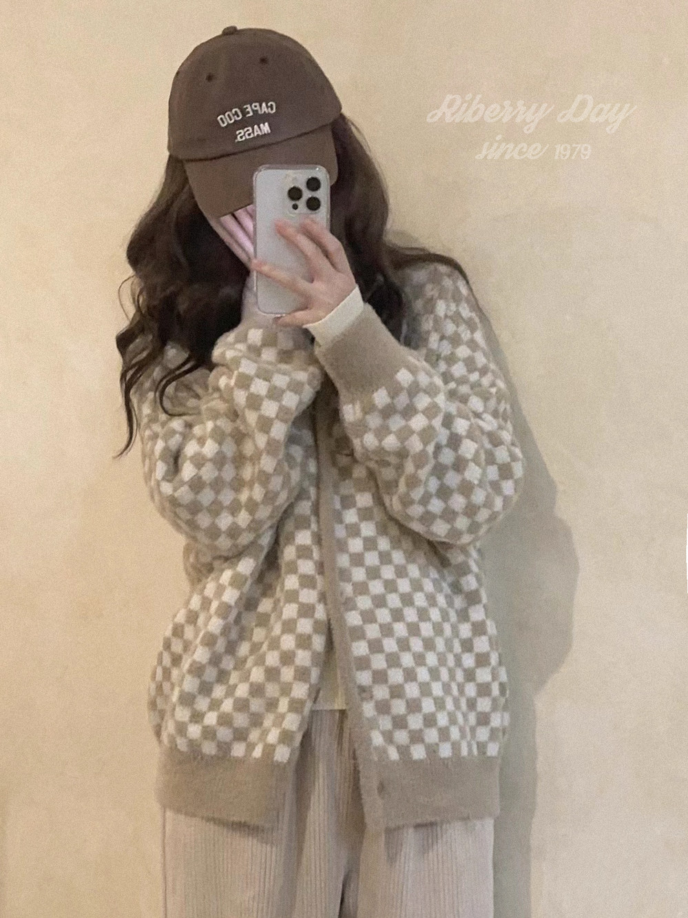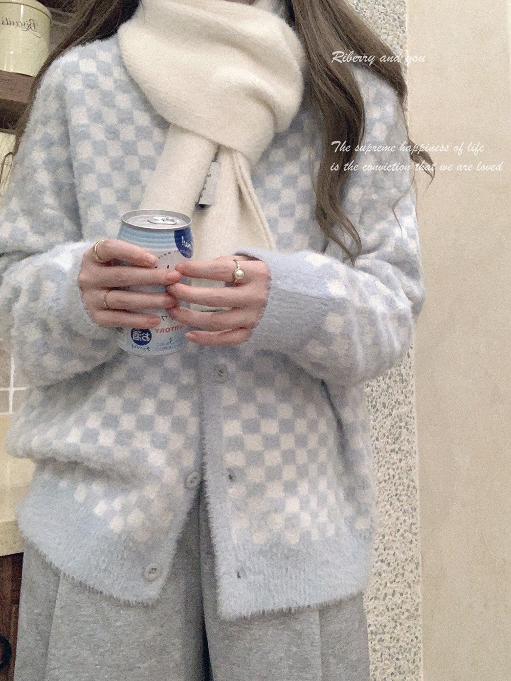 Бархатные синие белые шахматы, цветной трикотажный кардиган, свитер, искусственный мех, свободный крой