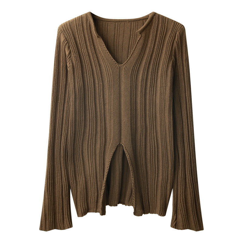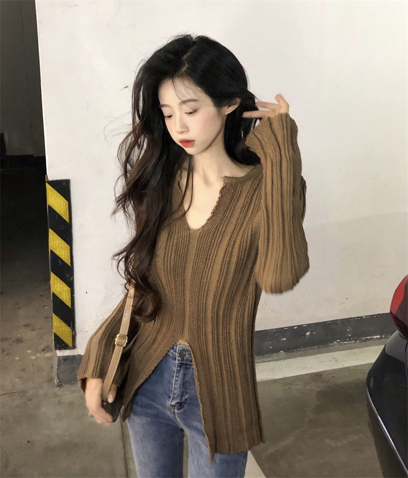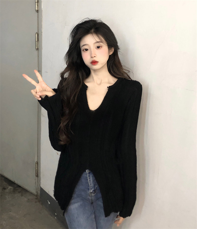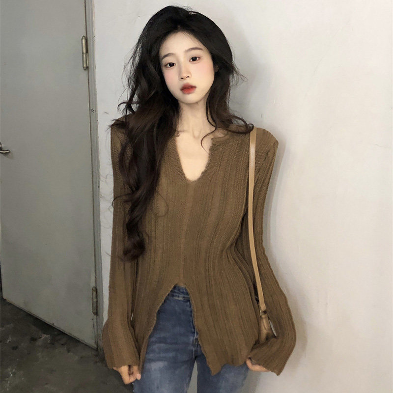 Трикотажный лонгслив, осенний приталенный базовый свитер, большой размер, подходит для полных девушек, в корейском стиле, V-образный вырез