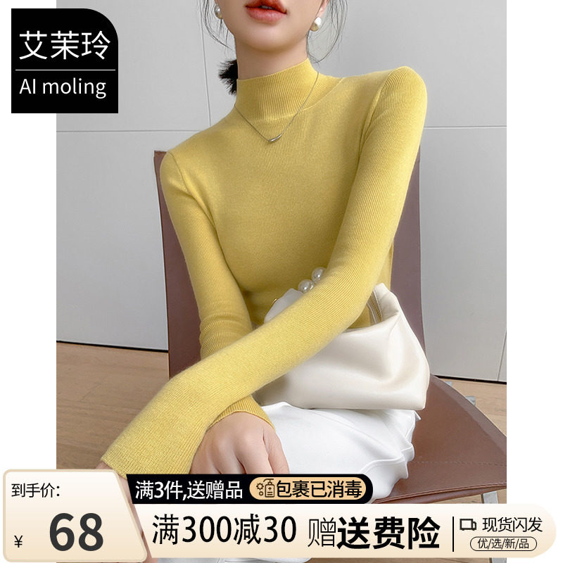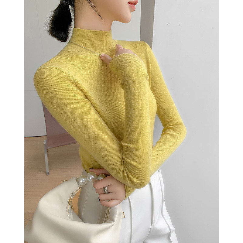 Демисезонный желтый шерстяной базовый свитер, французский стиль, высокий воротник, изысканный стиль, в обтяжку, в западном стиле