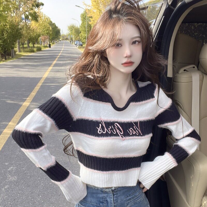 Полосатая вязаная базовая рубашка для женщин с модным осенним и зимним стилем, уникальным и чистым сладким горячим лучшим топом