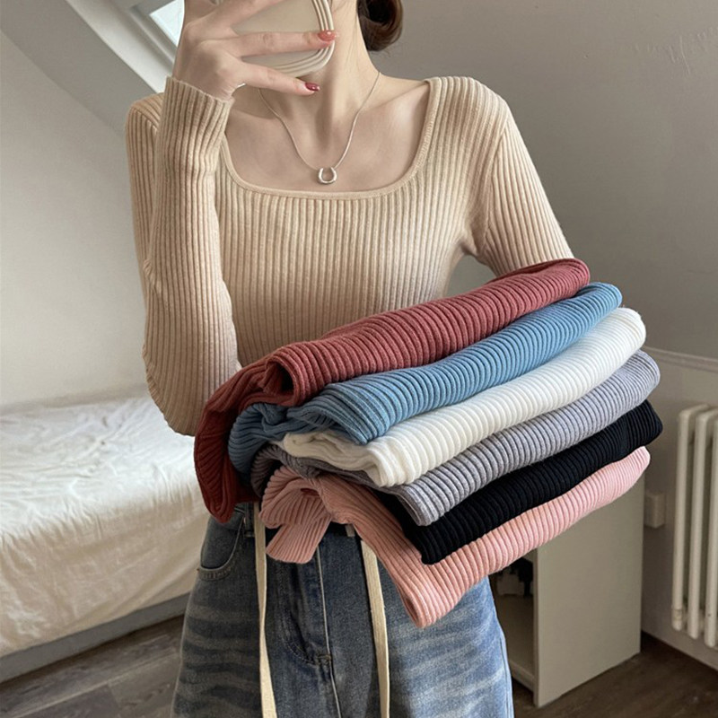 Трикотажный дизайнерский свитер, французский стиль, квадратный вырез, изысканный стиль, в обтяжку, по фигуре, тренд сезона