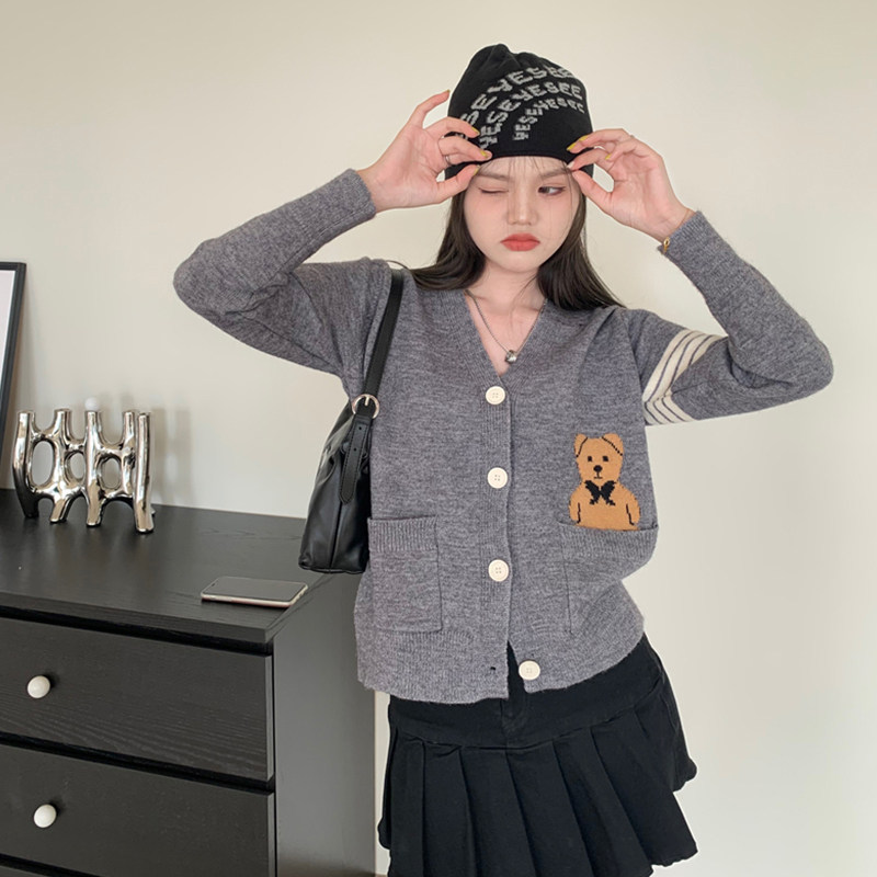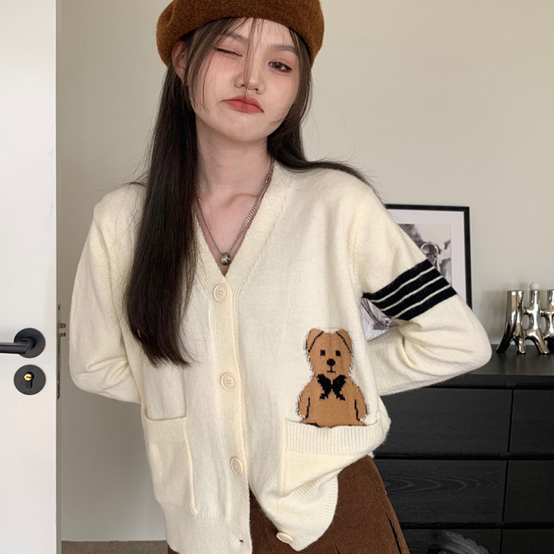 Трикотажный ретро свитер, мультяшный кардиган, короткая куртка, с медвежатами, V-образный вырез, свободный крой