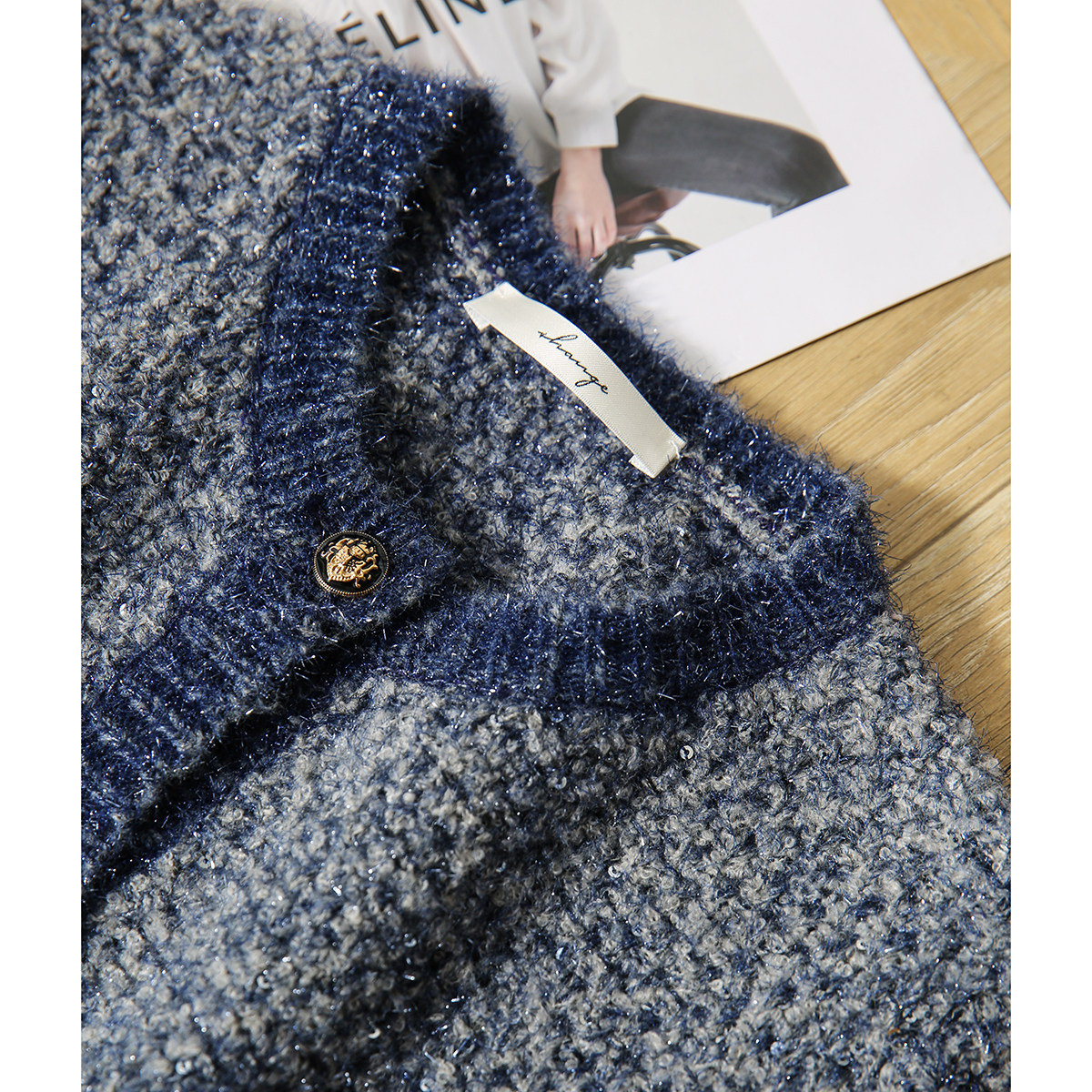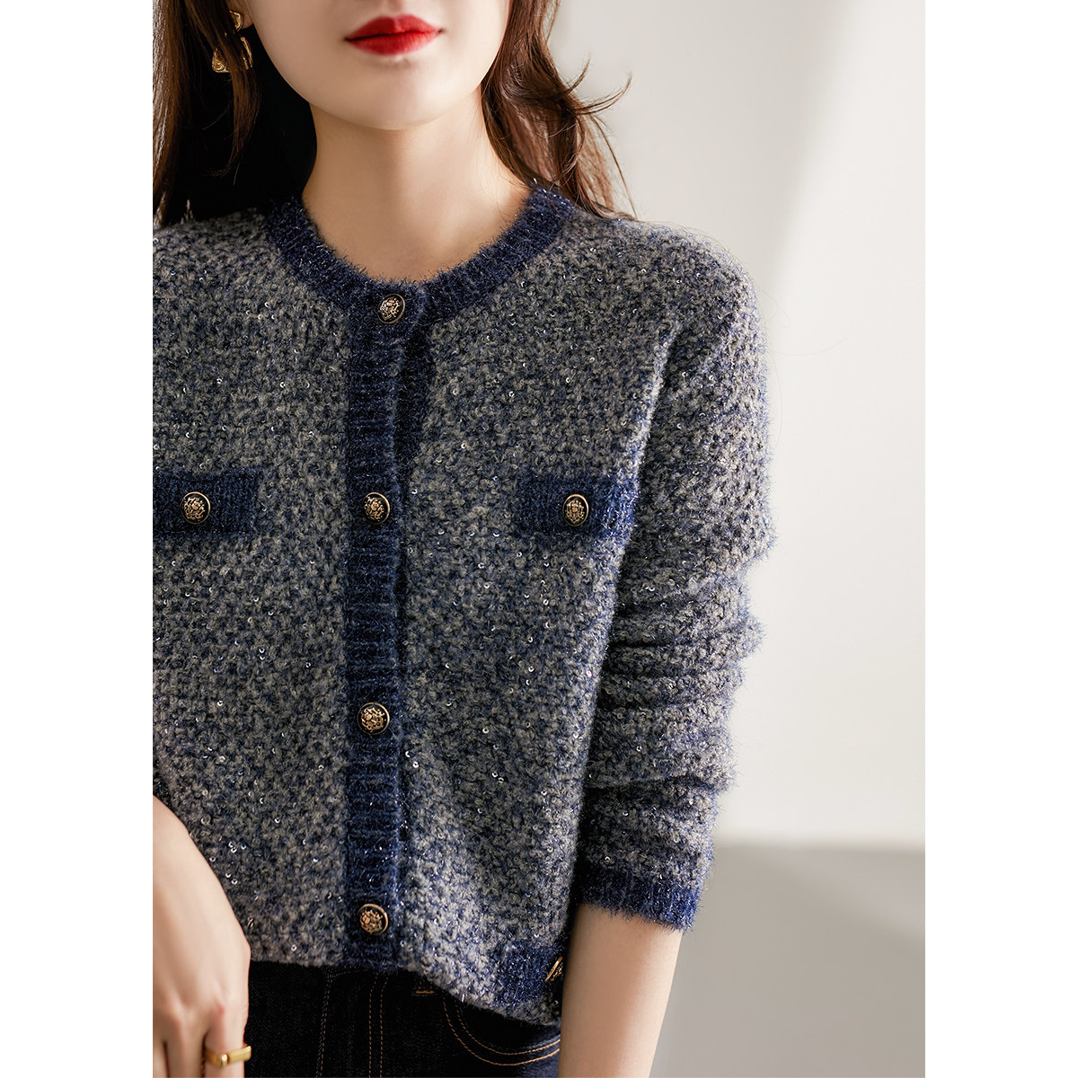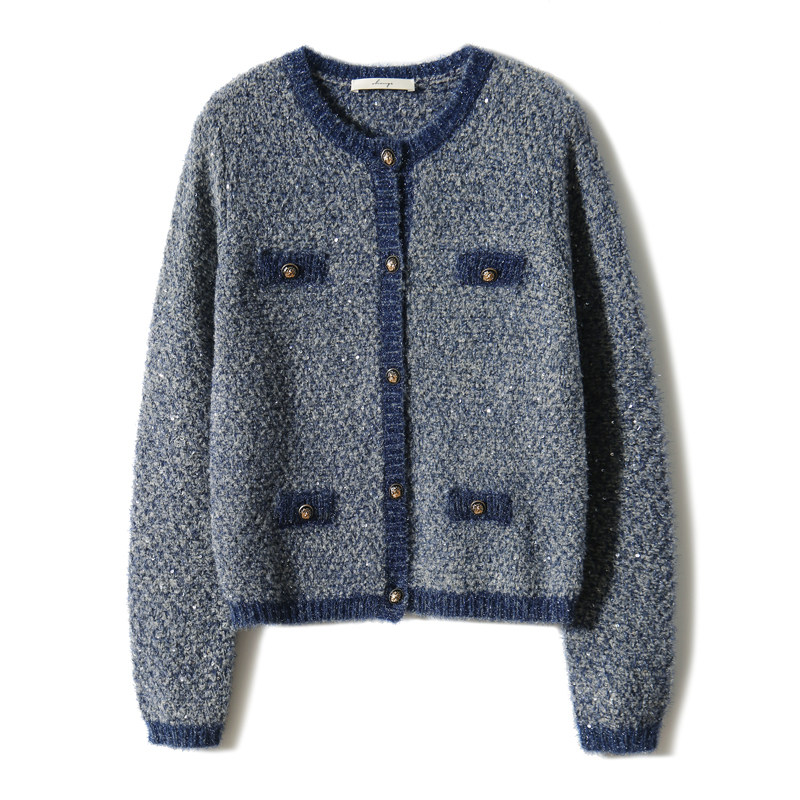 の [ZY258977AG Young Denim Blue Mall Bounge, элегантный, элегантный шикарный шелковый вязаный кардиган