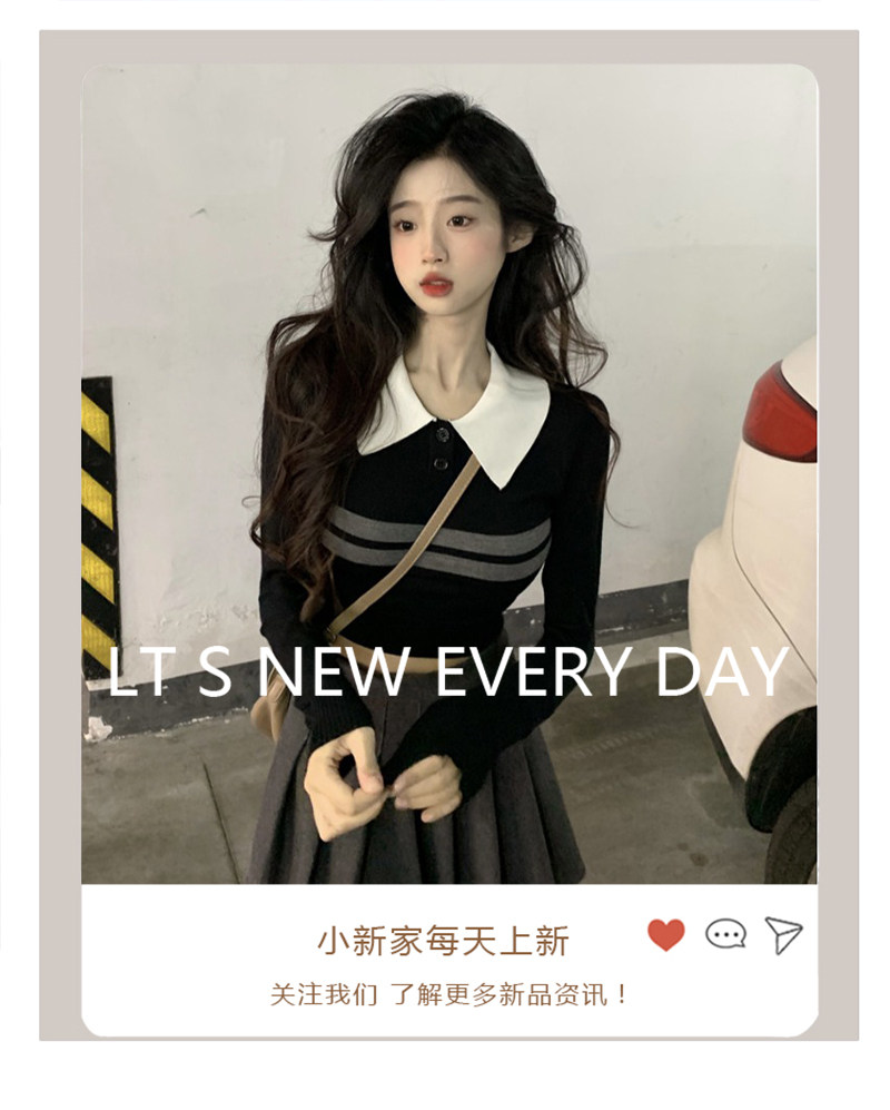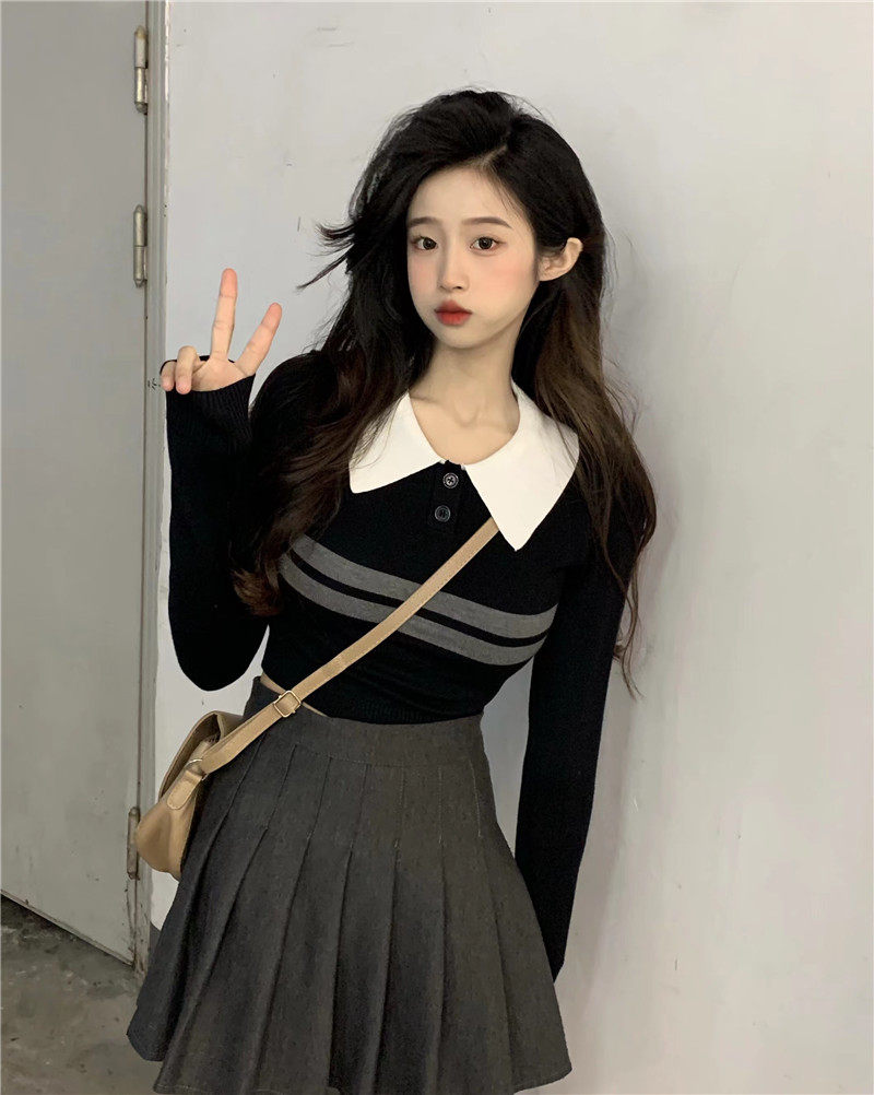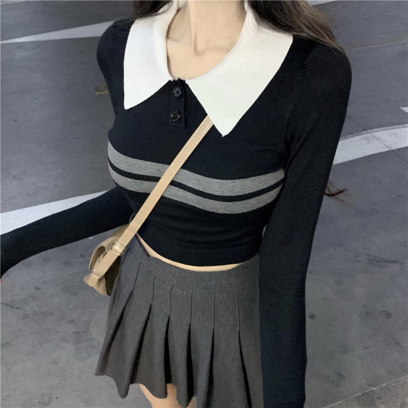 Трикотажный приятный телу весенний ростомер, короткий свитер, воротник поло, облегающий крой, высокая талия