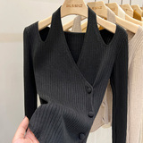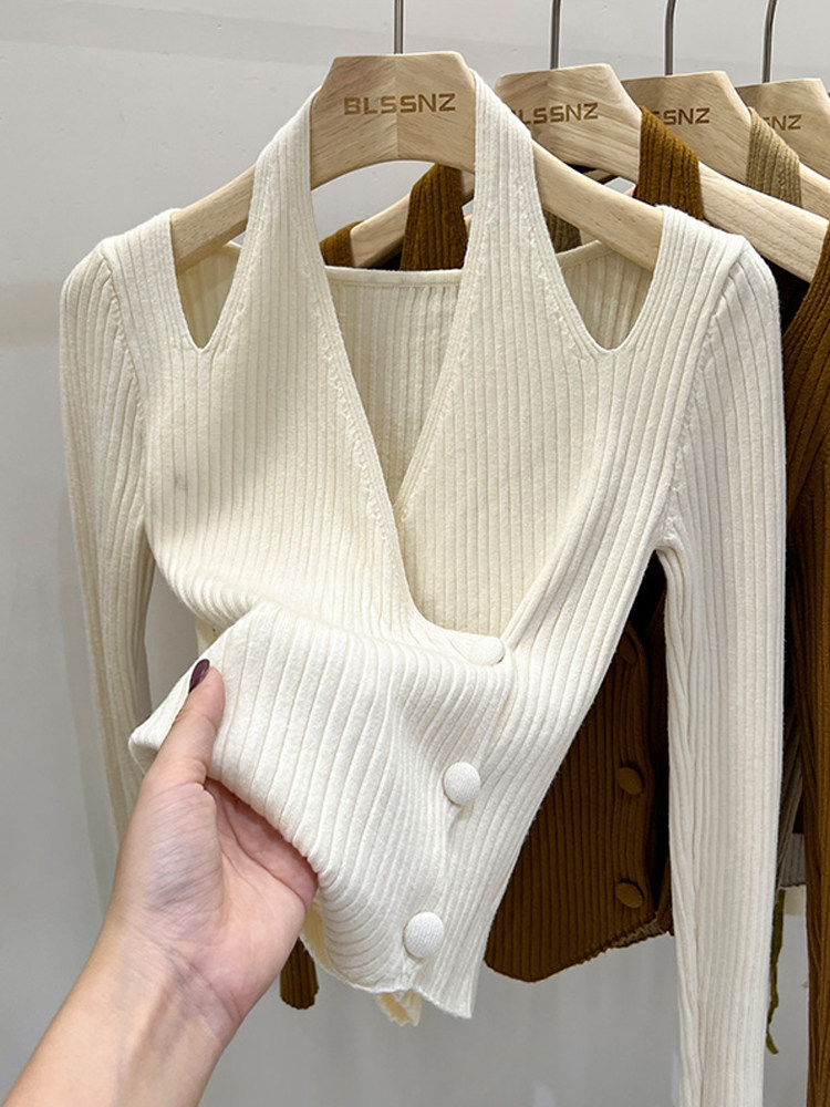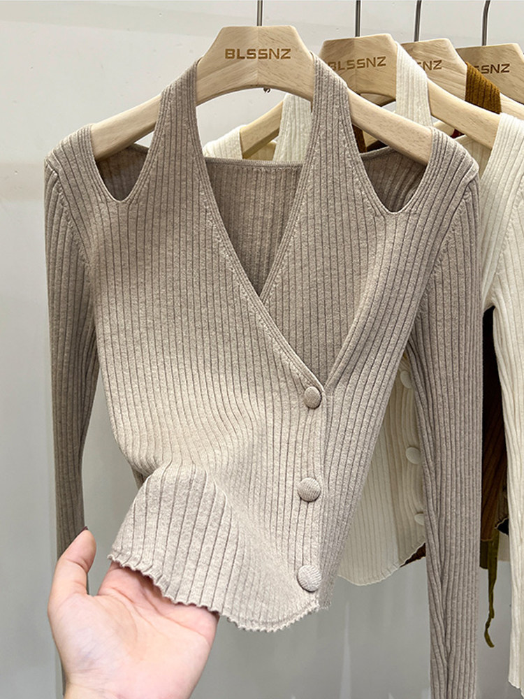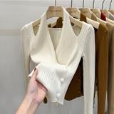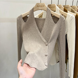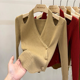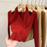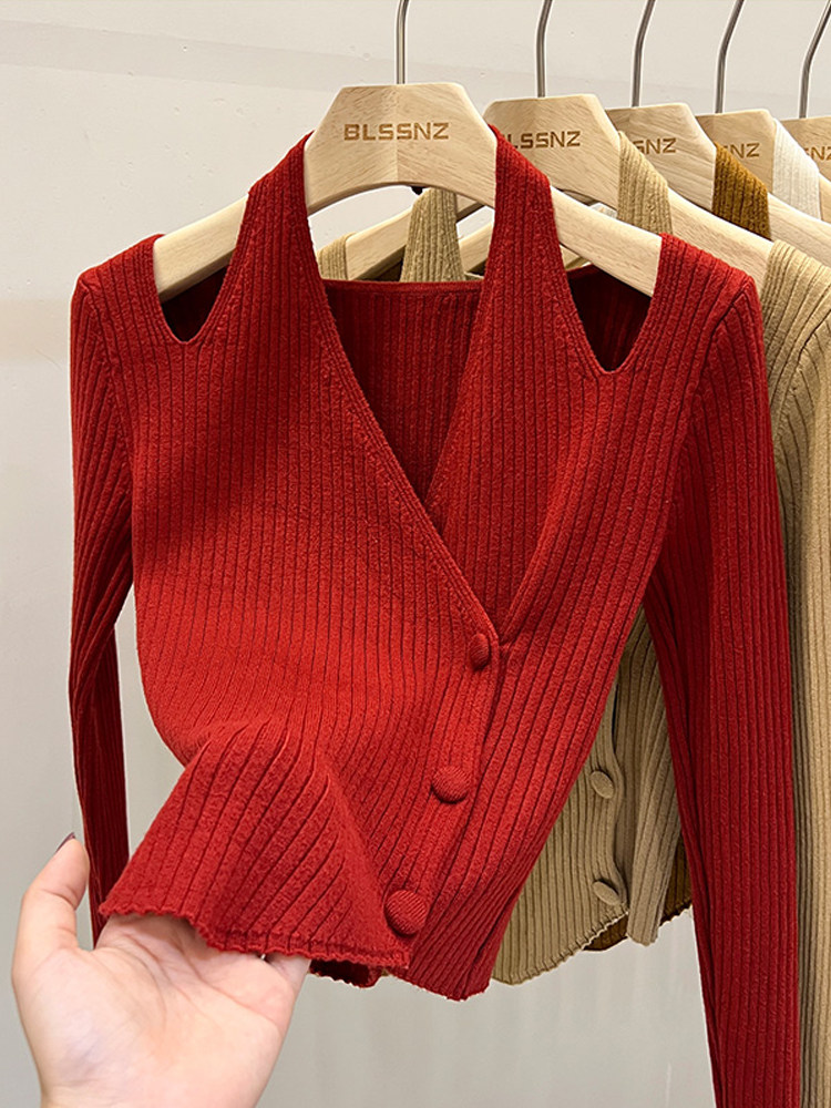Красный демисезонный трикотажный короткий свитер, французский стиль, V-образный вырез