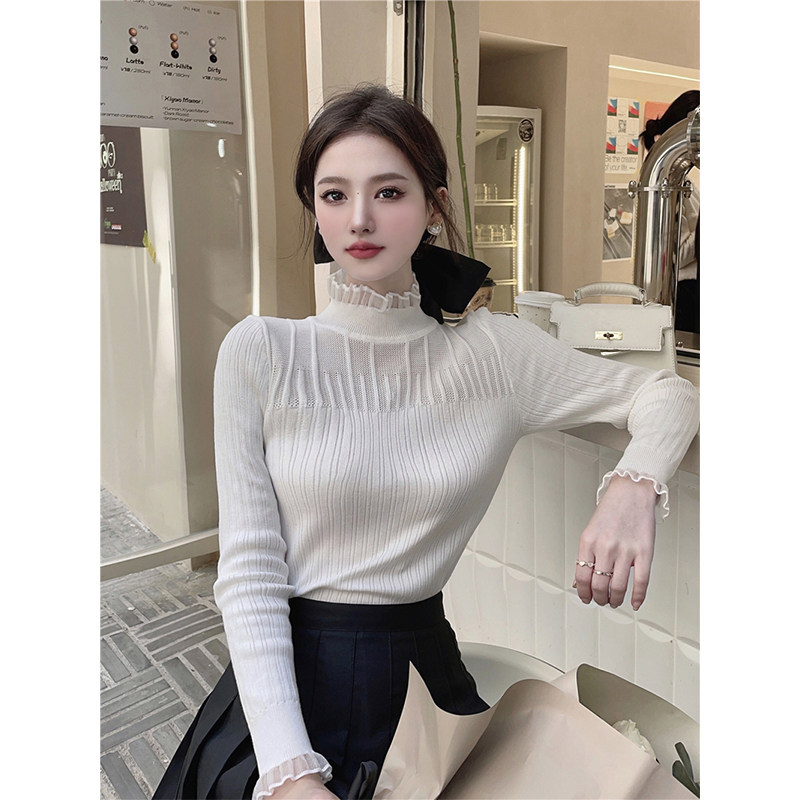 Кружевной трикотажный осенний демисезонный свитер, приталенный лонгслив, высокий воротник, коллекция 2022