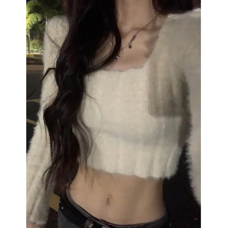 Трикотажный демисезонный дизайнерский короткий свитер, квадратный вырез, тренд сезона