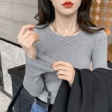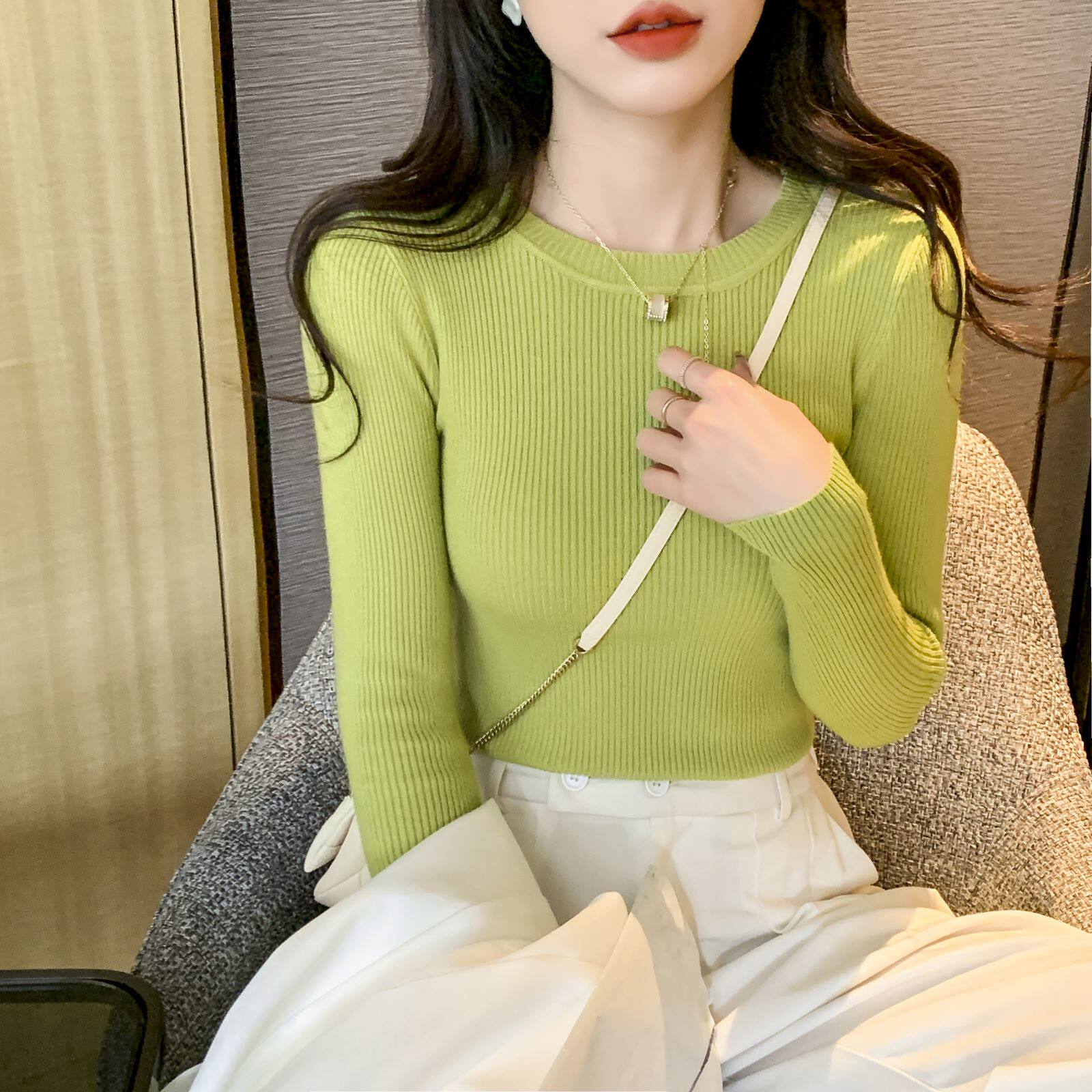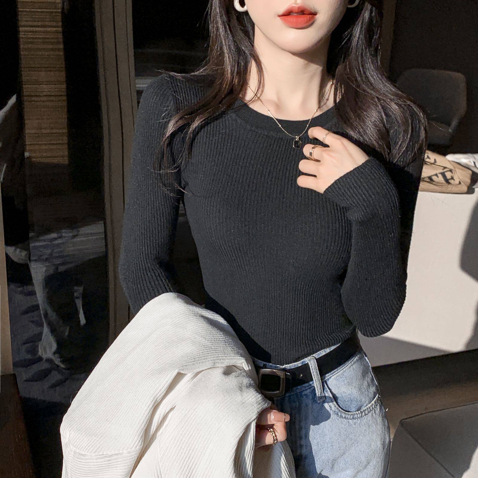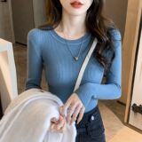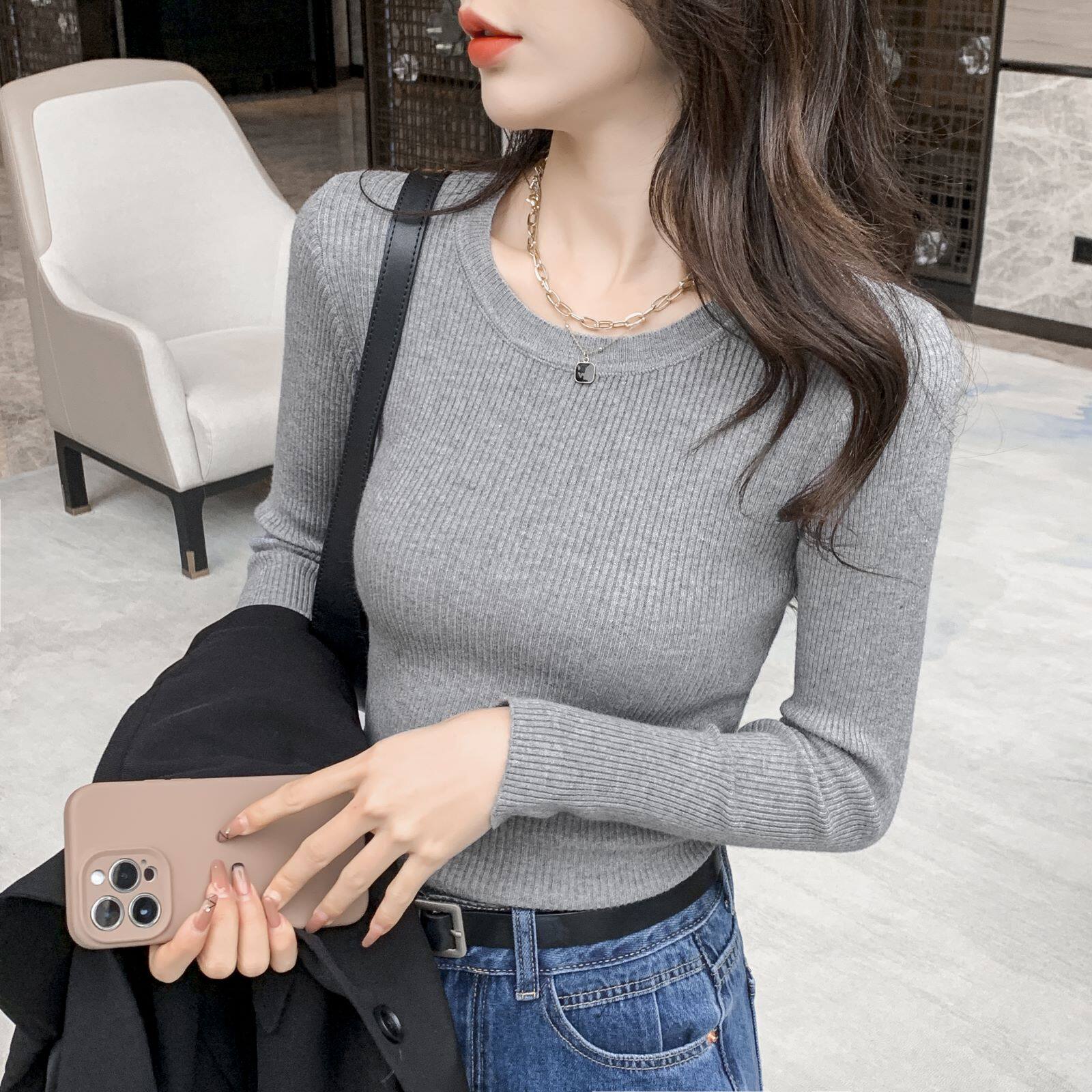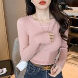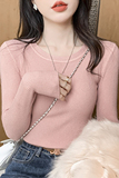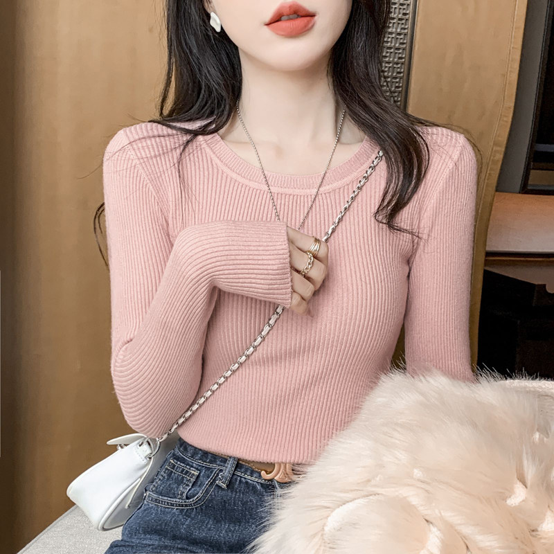 Трикотажный приятный телу осенний демисезонный розовый свитер, лонгслив с круглым воротником, изысканный стиль, в западном стиле, облегающий крой