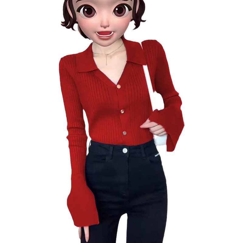 Ретро красный трикотажный осенний базовый приятный телу кардиган, французский стиль, воротник поло