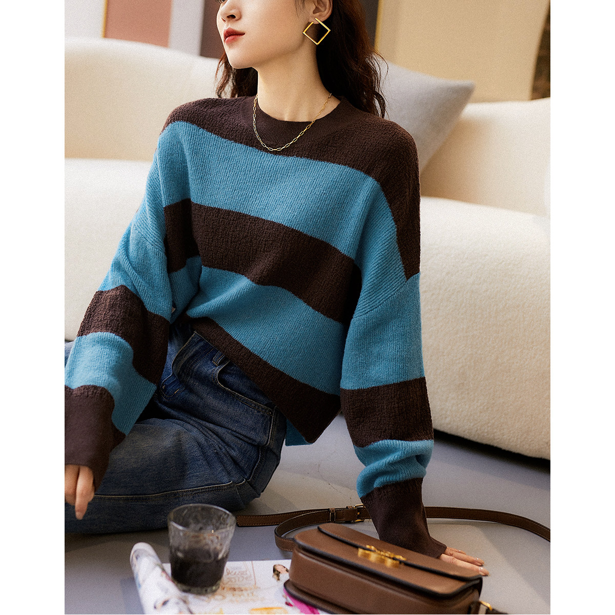 Тяжелые полосы+свободный падающий плечо круглый свитер.