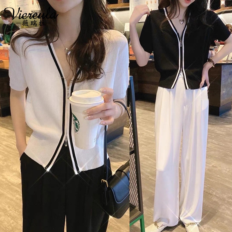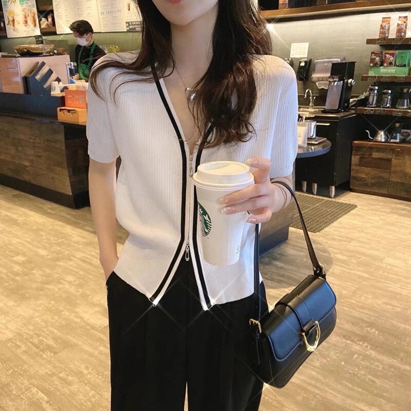 Летний кардиган, летняя трикотажная футболка с коротким рукавом, коллекция 2023, в корейском стиле, V-образный вырез, в западном стиле