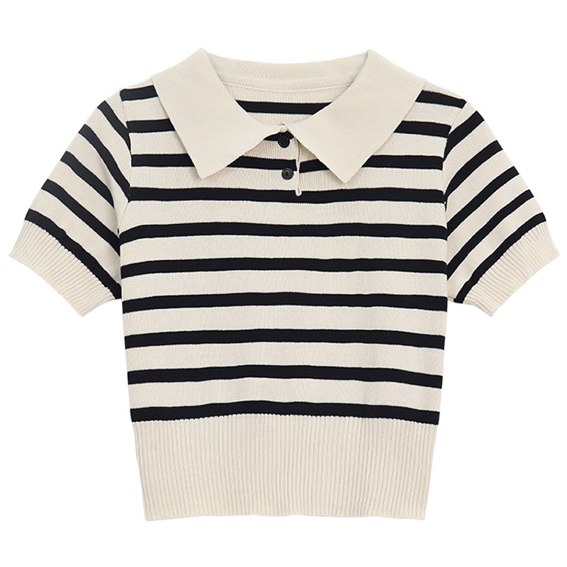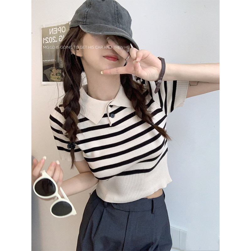 Трикотажный весенний свитер, приталенная короткая футболка, воротник поло, коллекция 2023, в корейском стиле, короткий рукав