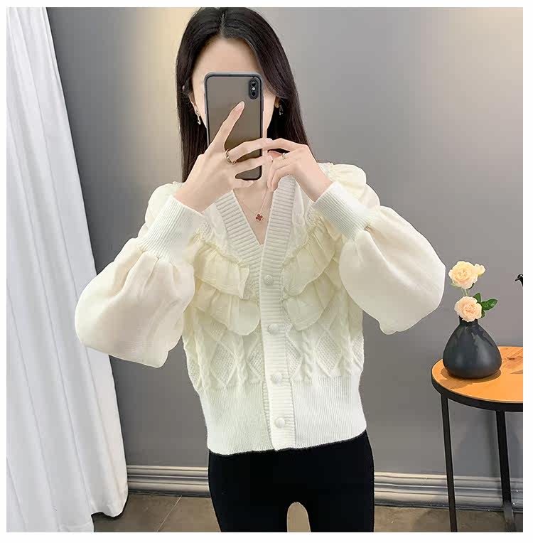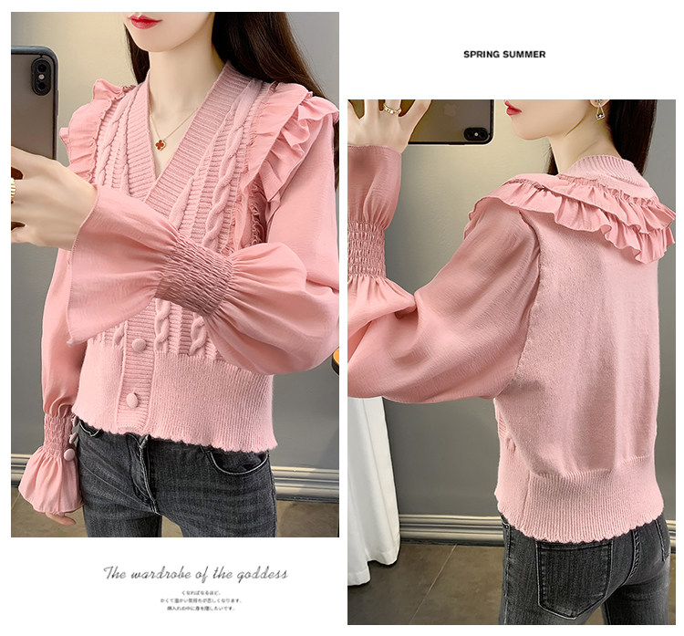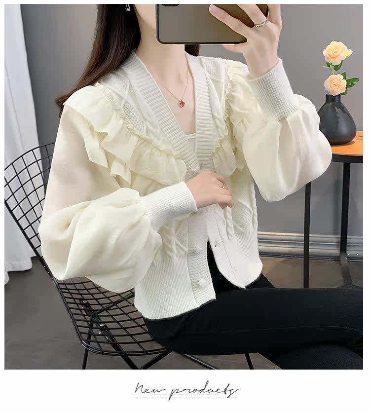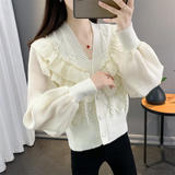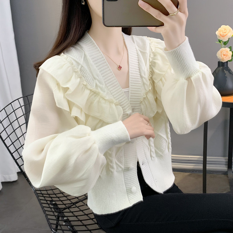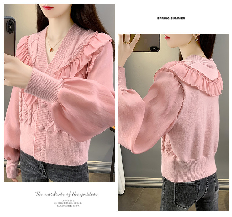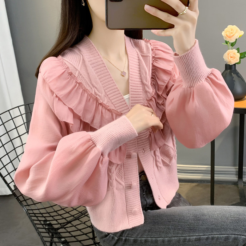 Весенний кружевной шифоновый дизайнерский кардиган, короткий свитер, куртка, оверсайз, свободный крой, V-образный вырез