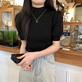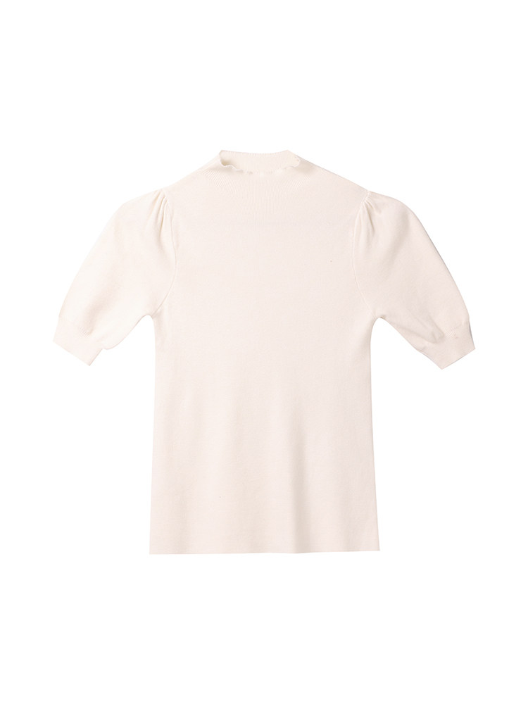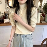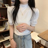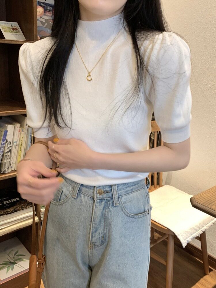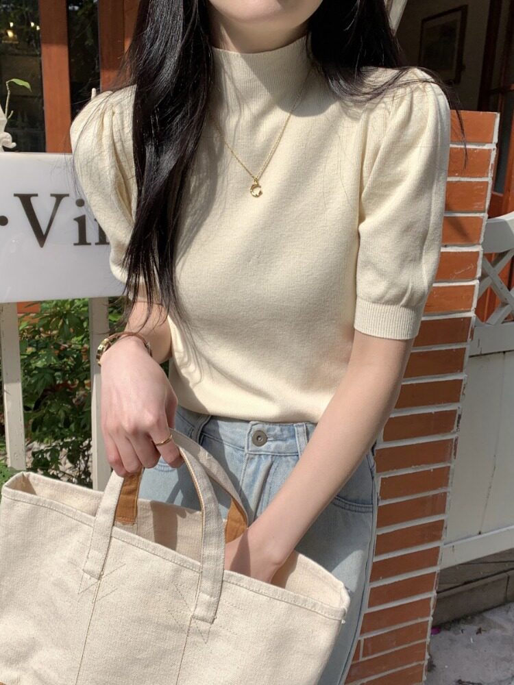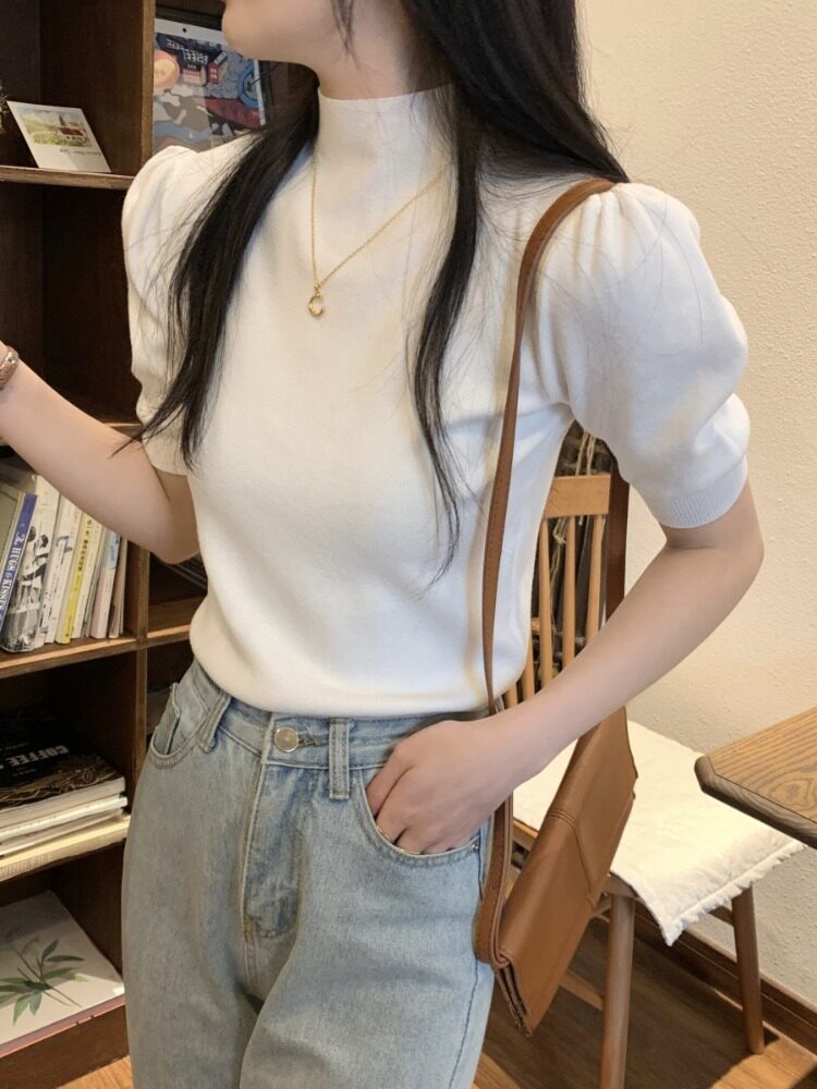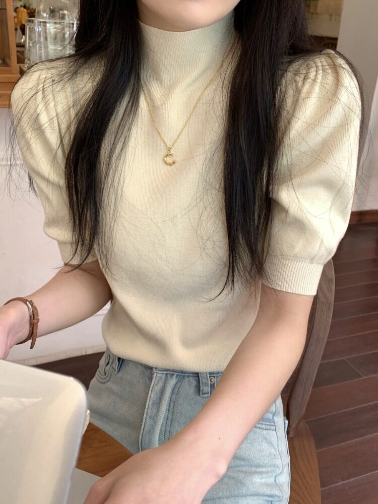 Трикотажный весенний дизайнерский базовый приятный телу свитер, высокий воротник, коллекция 2023, тренд сезона, рукава фонарики