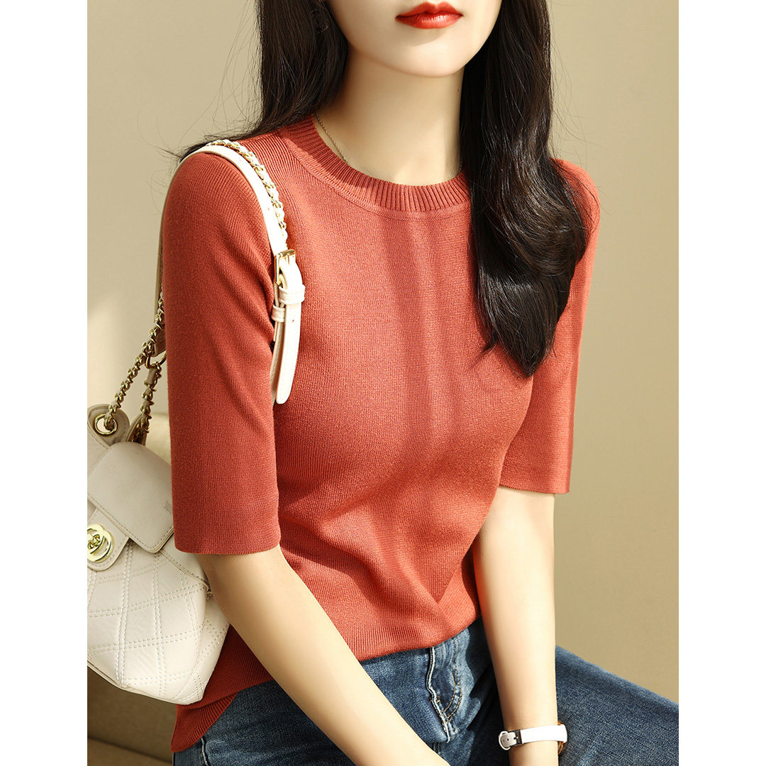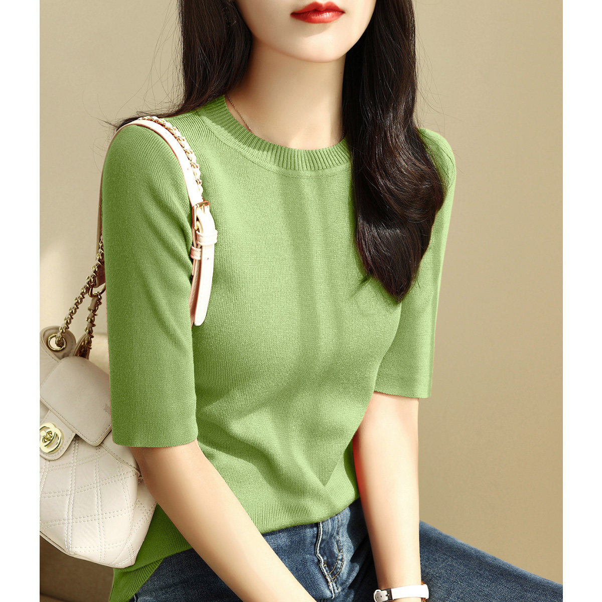 Зеленый цветной трикотажный летний базовый свитер с круглым воротником