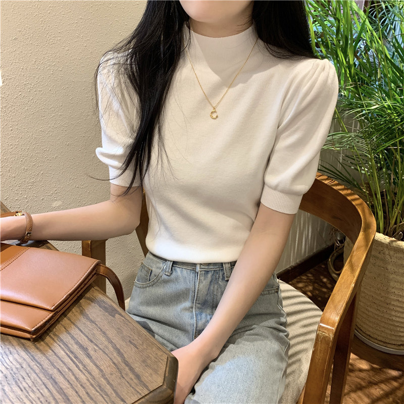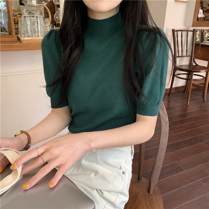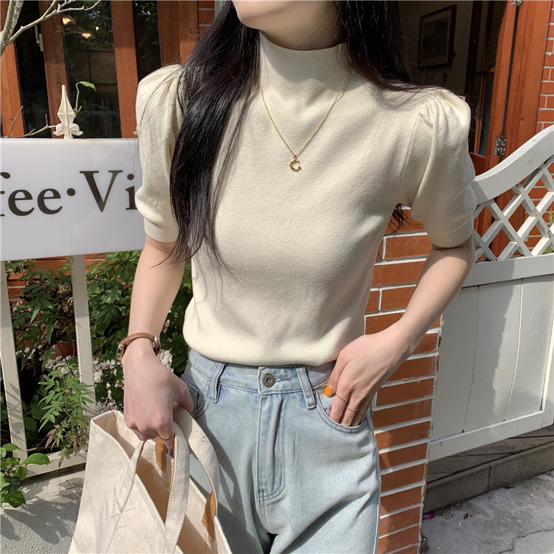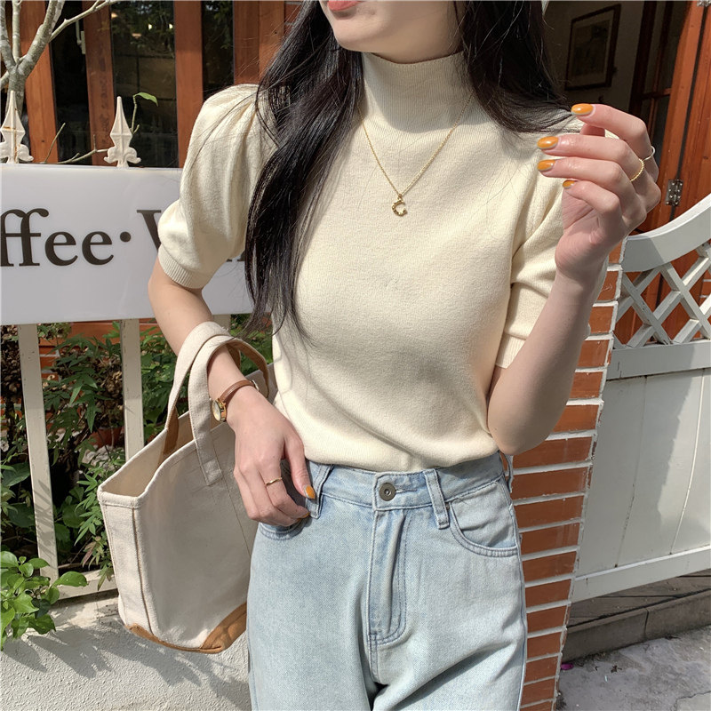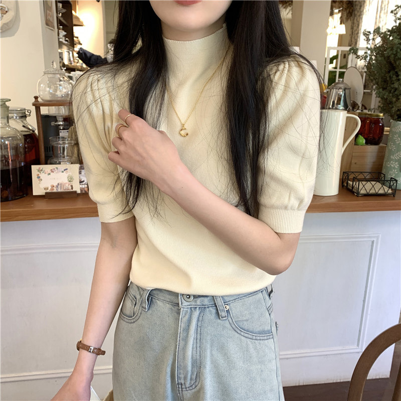 Летний трикотажный свитер, шелковая футболка, облегающий крой, короткий рукав, высокий воротник
