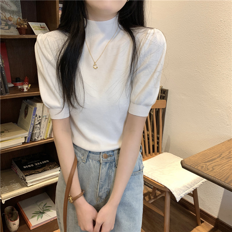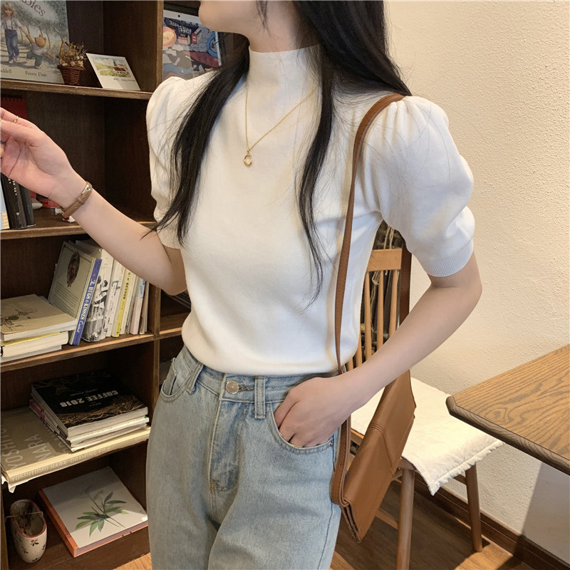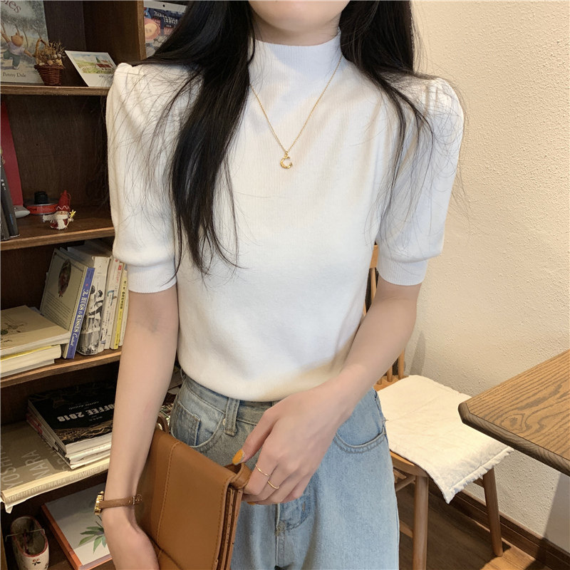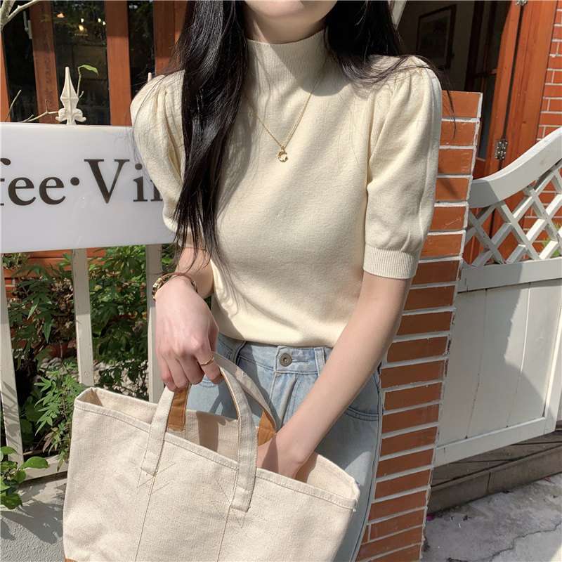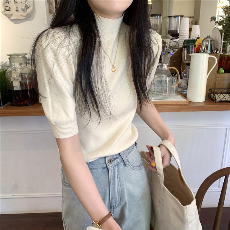 Летний трикотажный свитер, шелковая футболка, облегающий крой, короткий рукав, высокий воротник