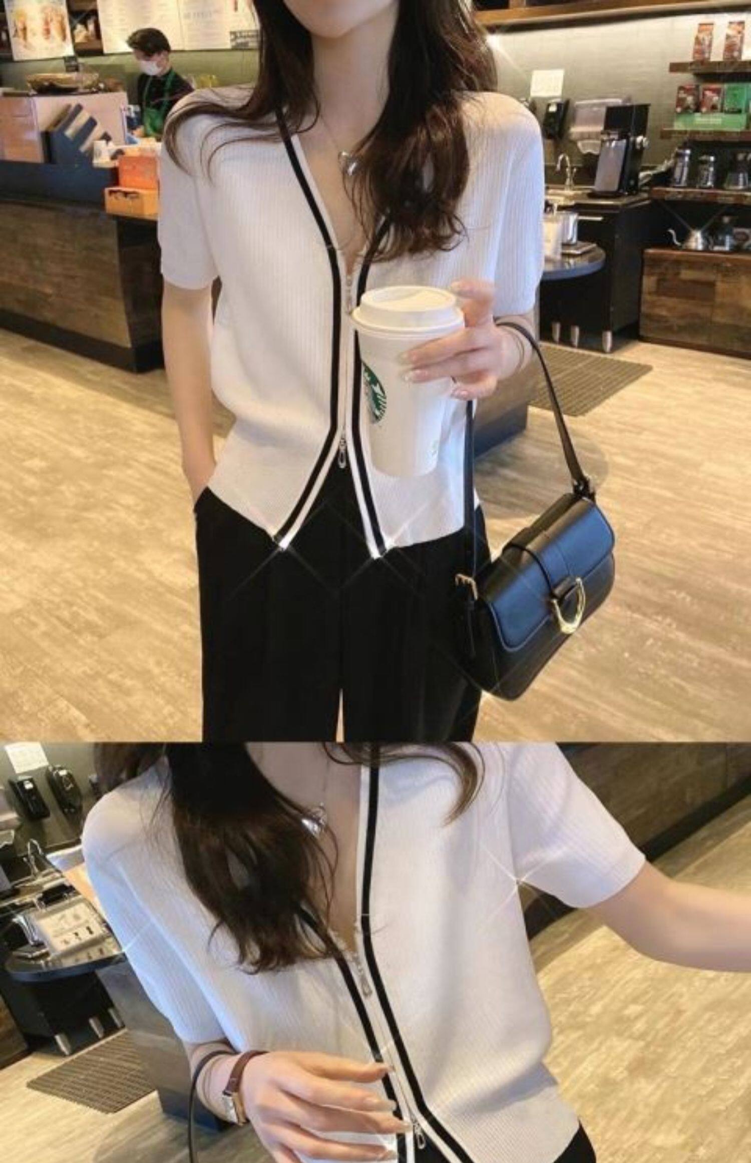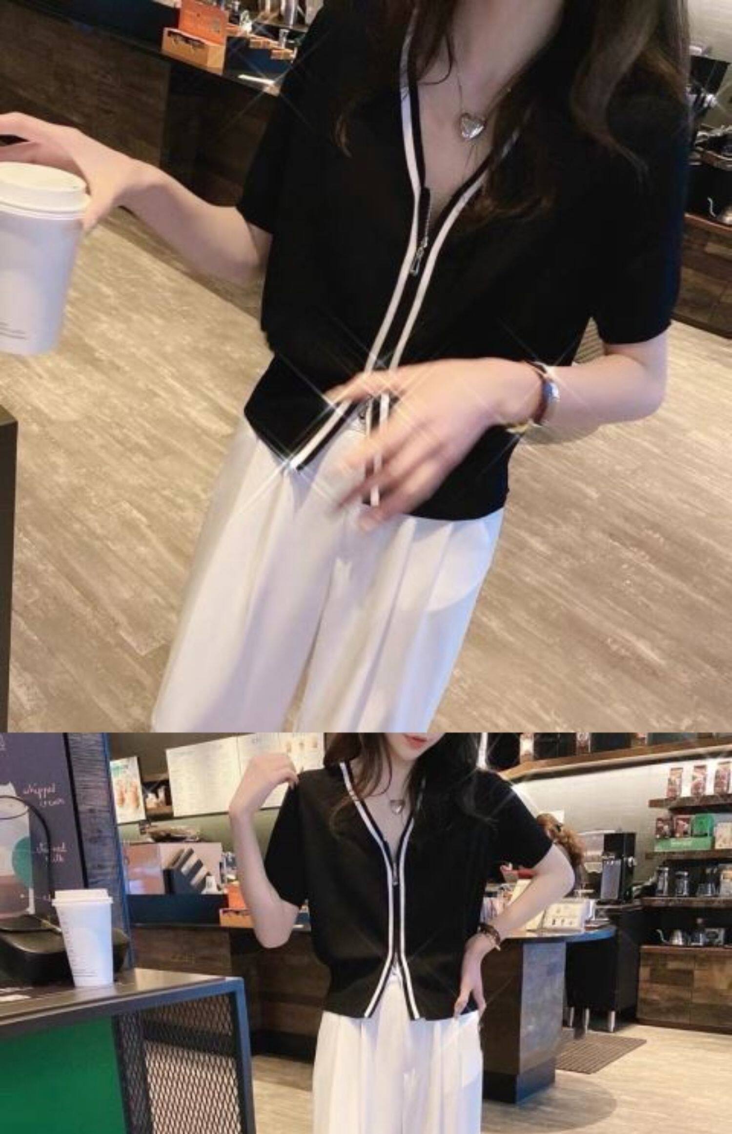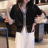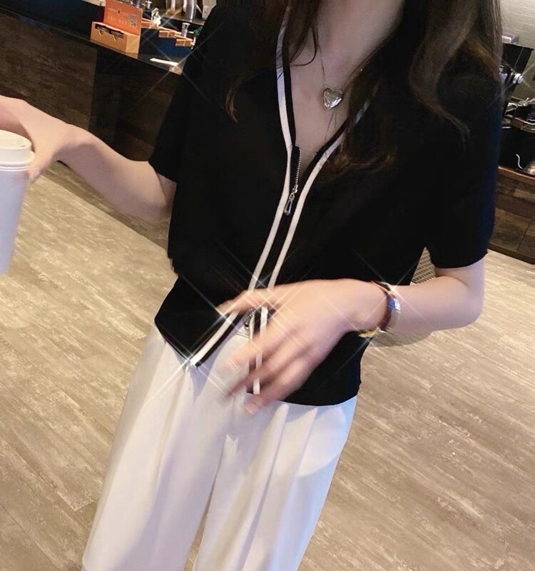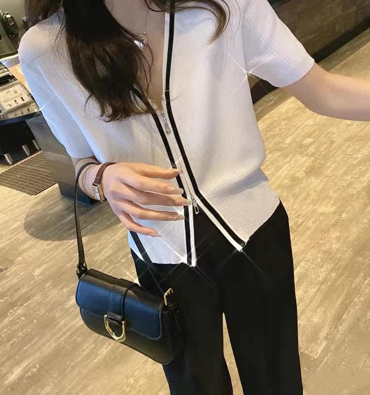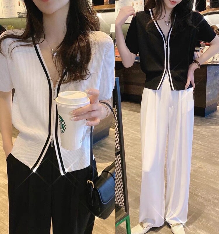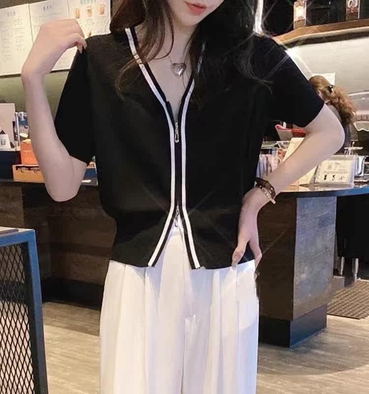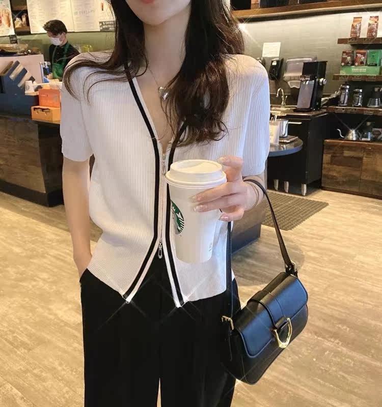 Летний тонкий трикотажный короткий кардиган с молнией, коллекция 2023, в корейском стиле, V-образный вырез, короткий рукав