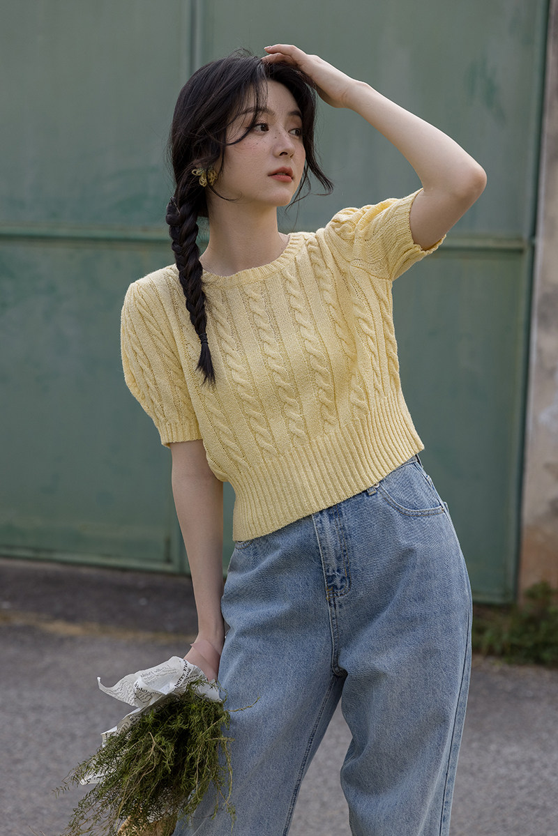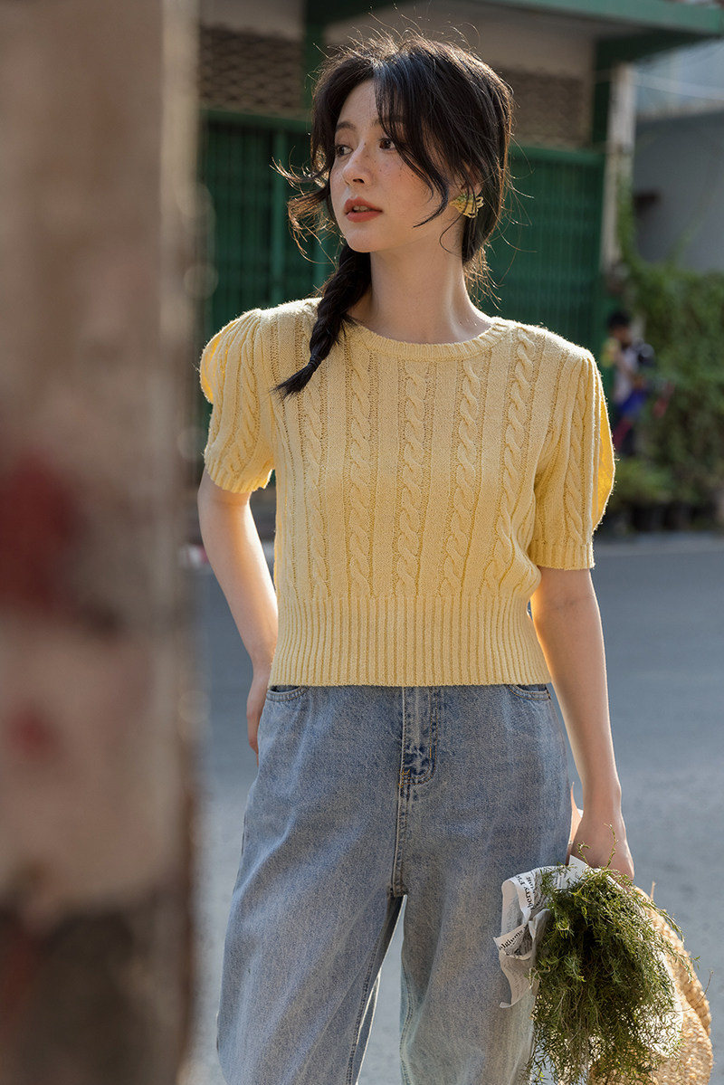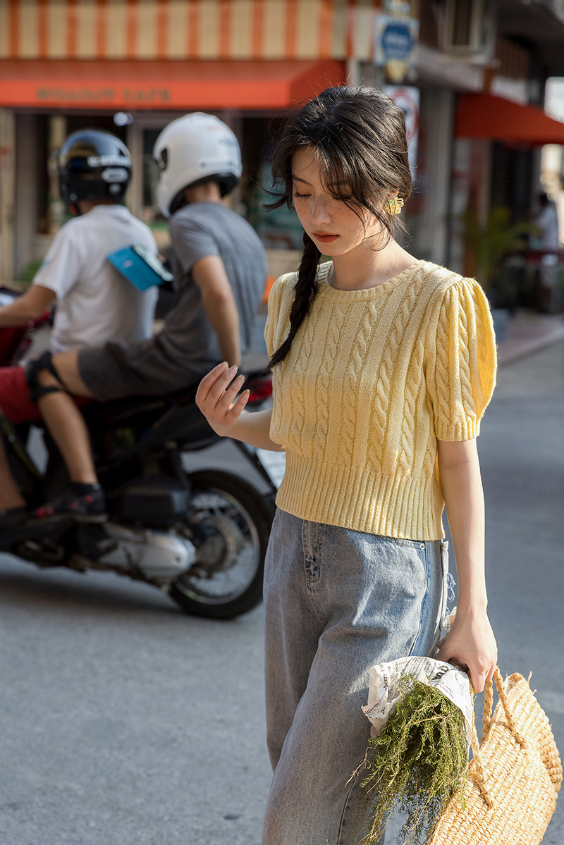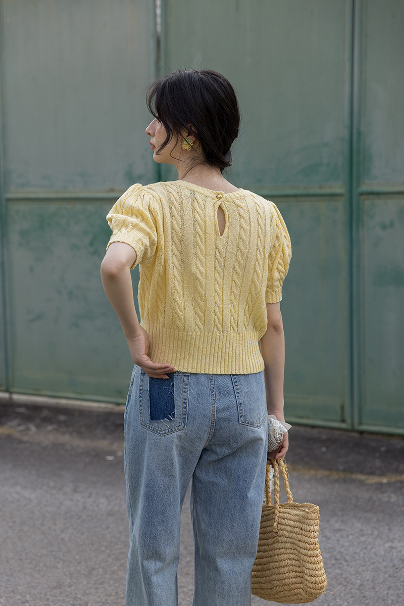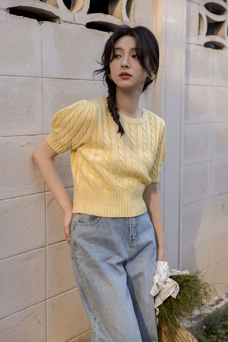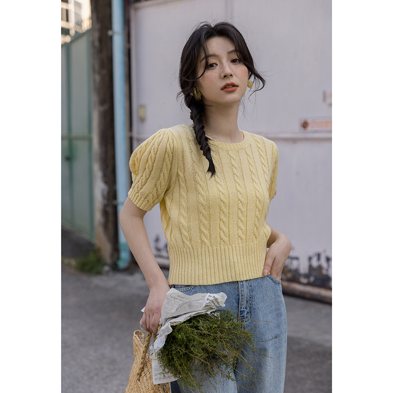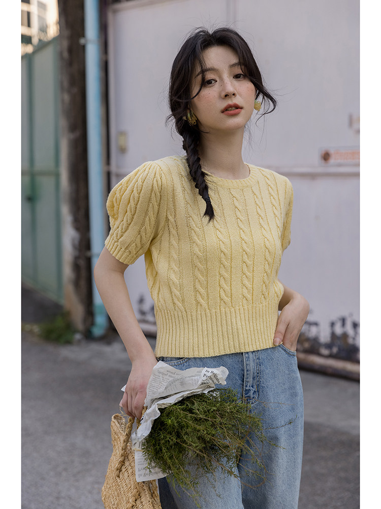 Трикотажный весенний дизайнерский короткий свитер, короткий рукав, 2023, тренд сезона, рукава фонарики, облегающий крой