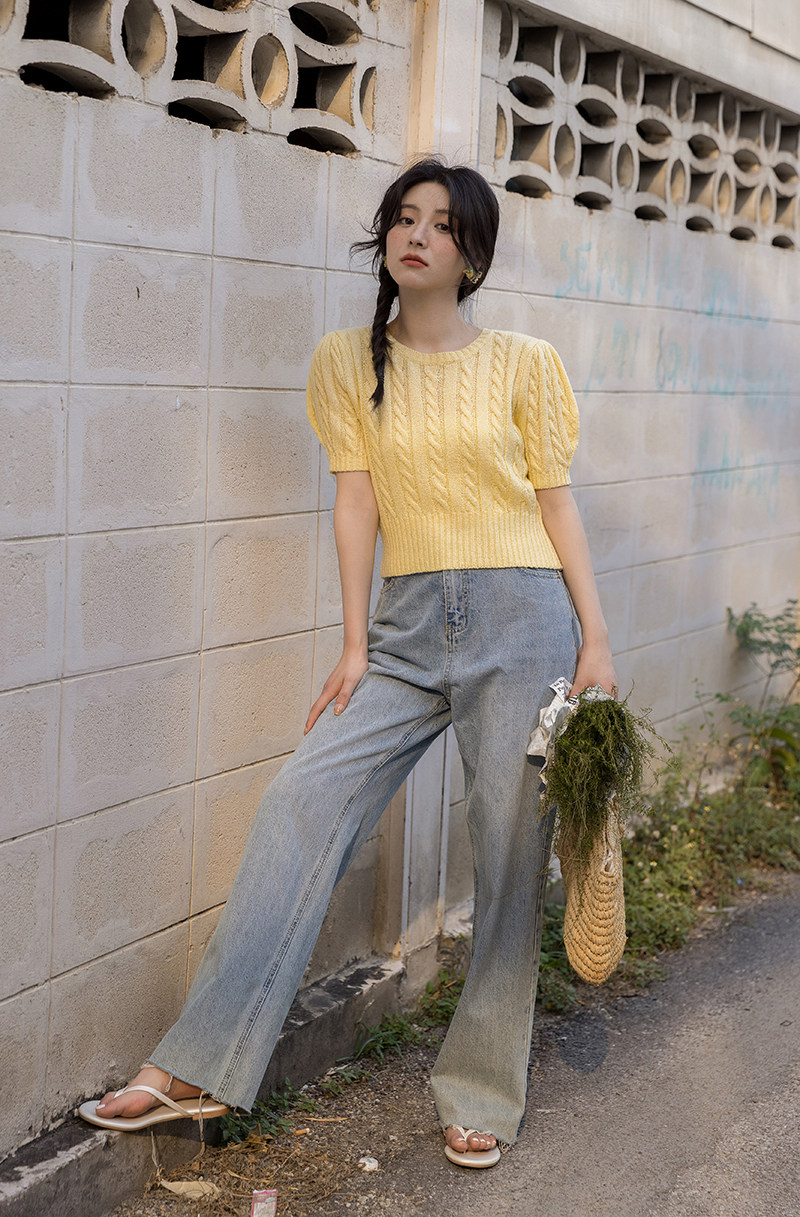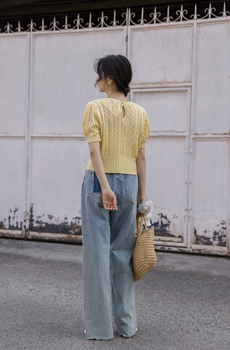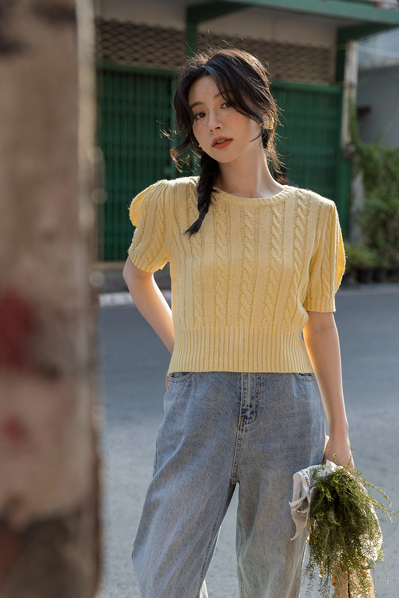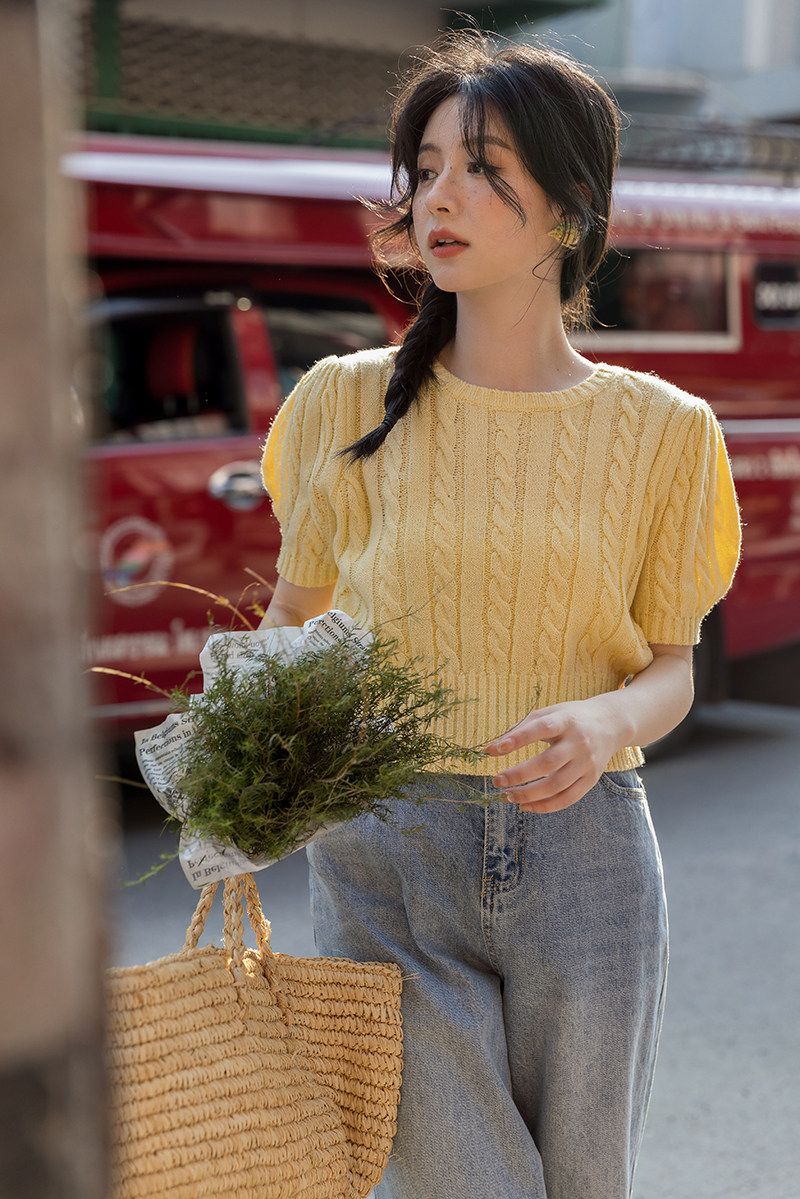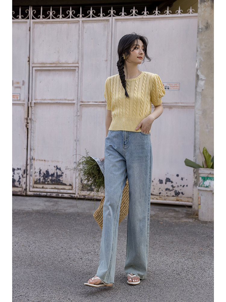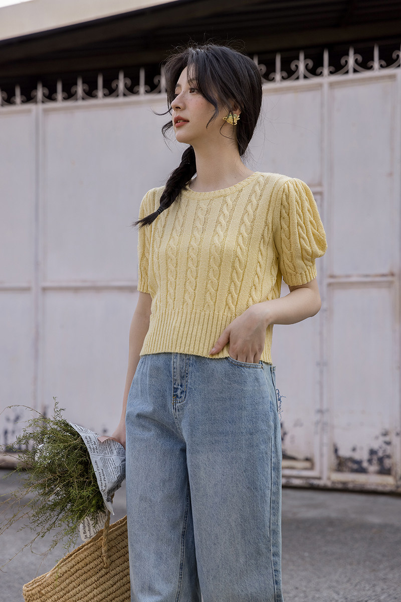 Трикотажный весенний дизайнерский короткий свитер, короткий рукав, 2023, тренд сезона, рукава фонарики, облегающий крой