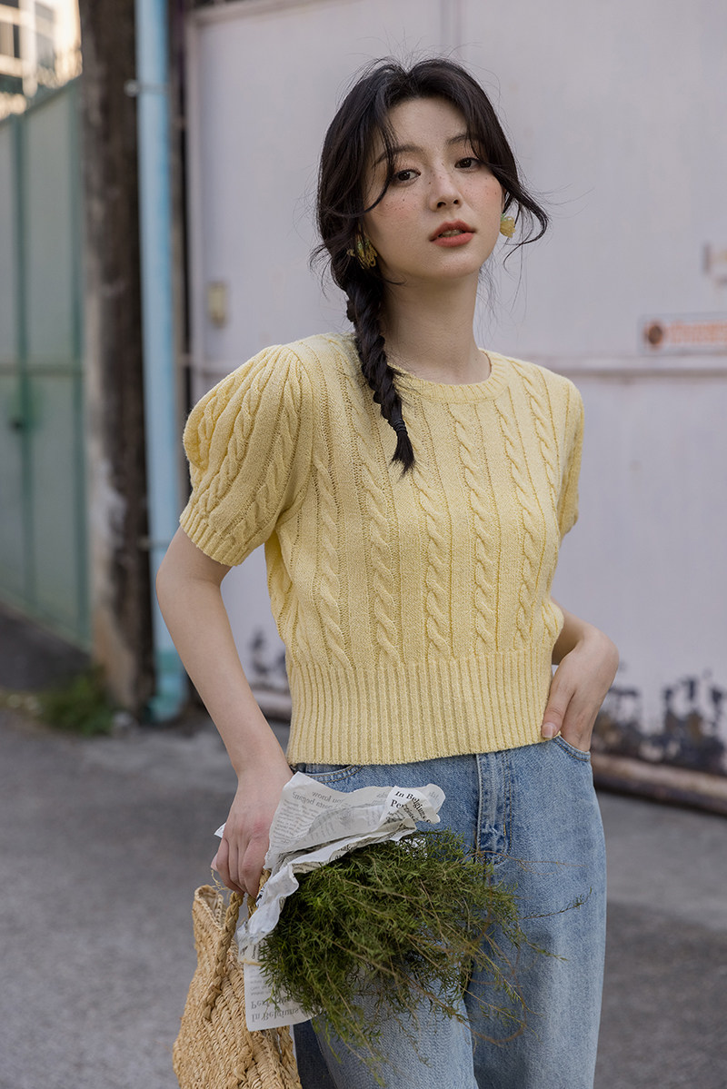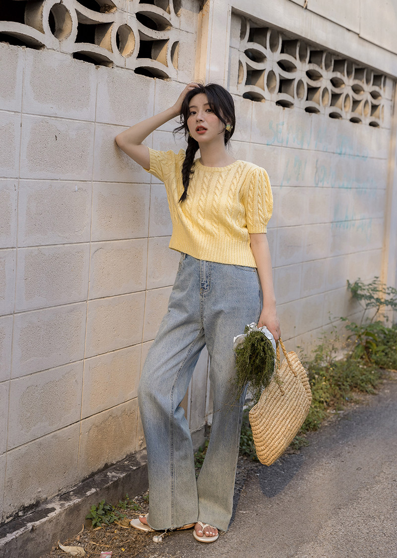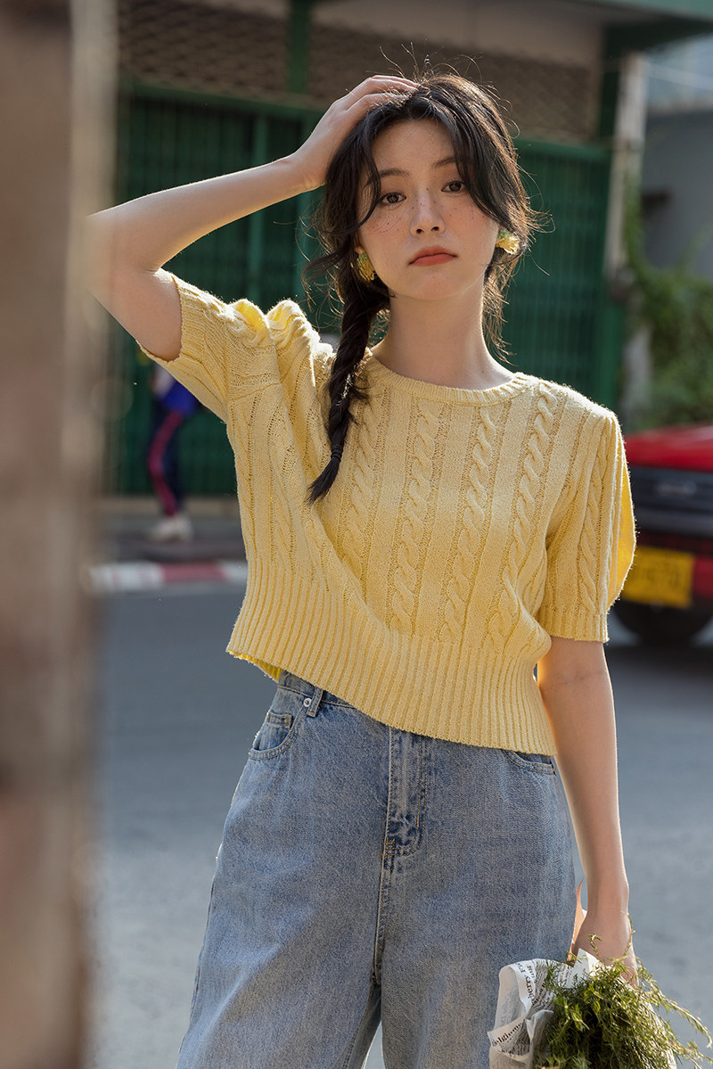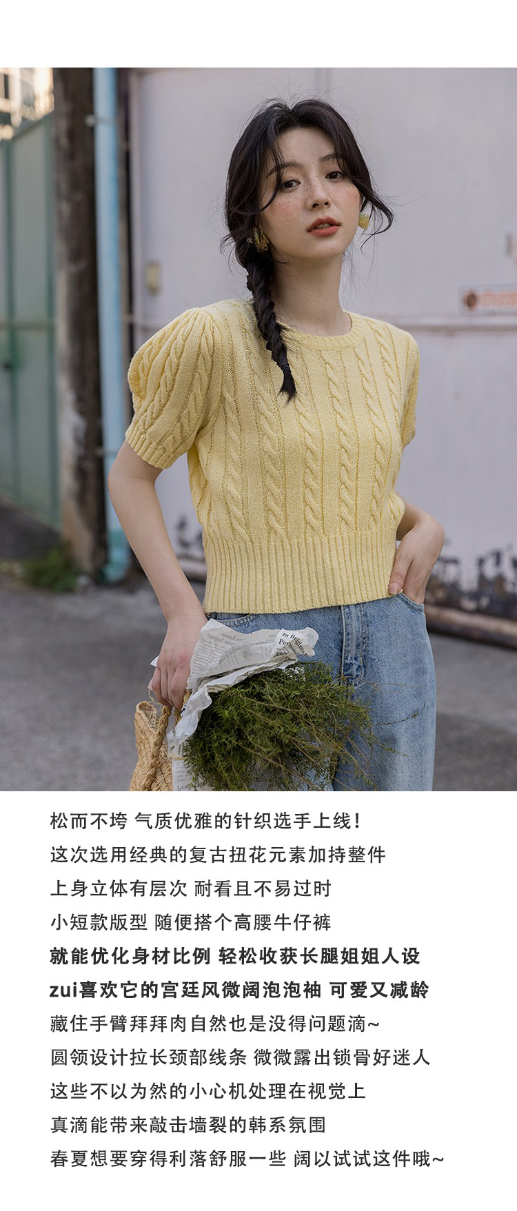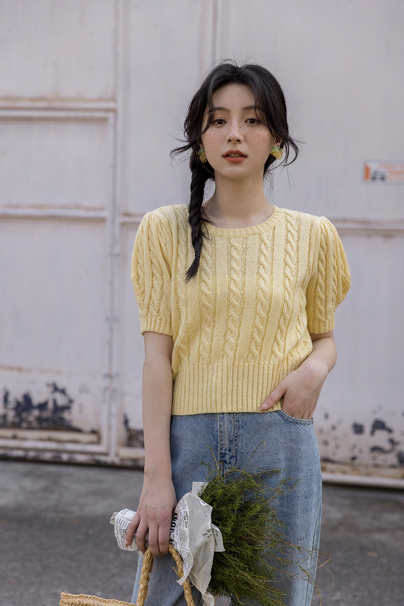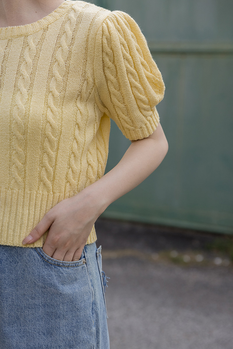 Трикотажный весенний дизайнерский короткий свитер, короткий рукав, 2023, тренд сезона, рукава фонарики, облегающий крой