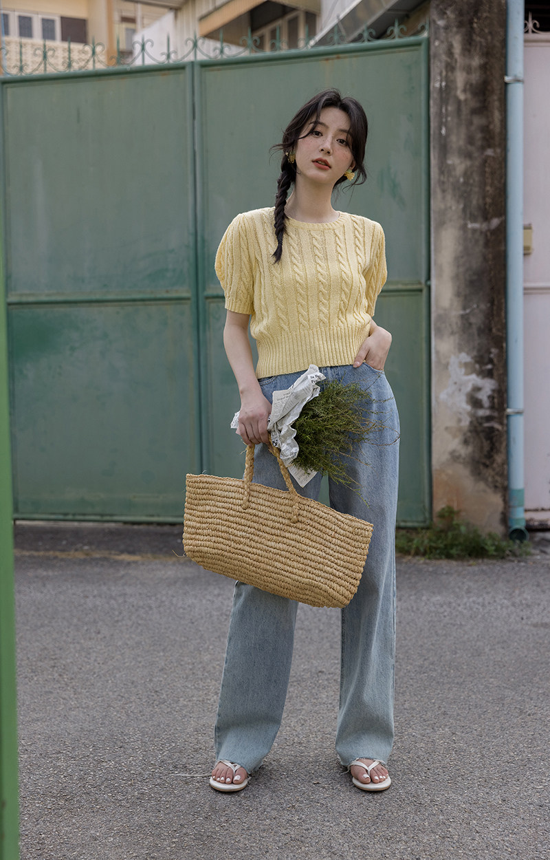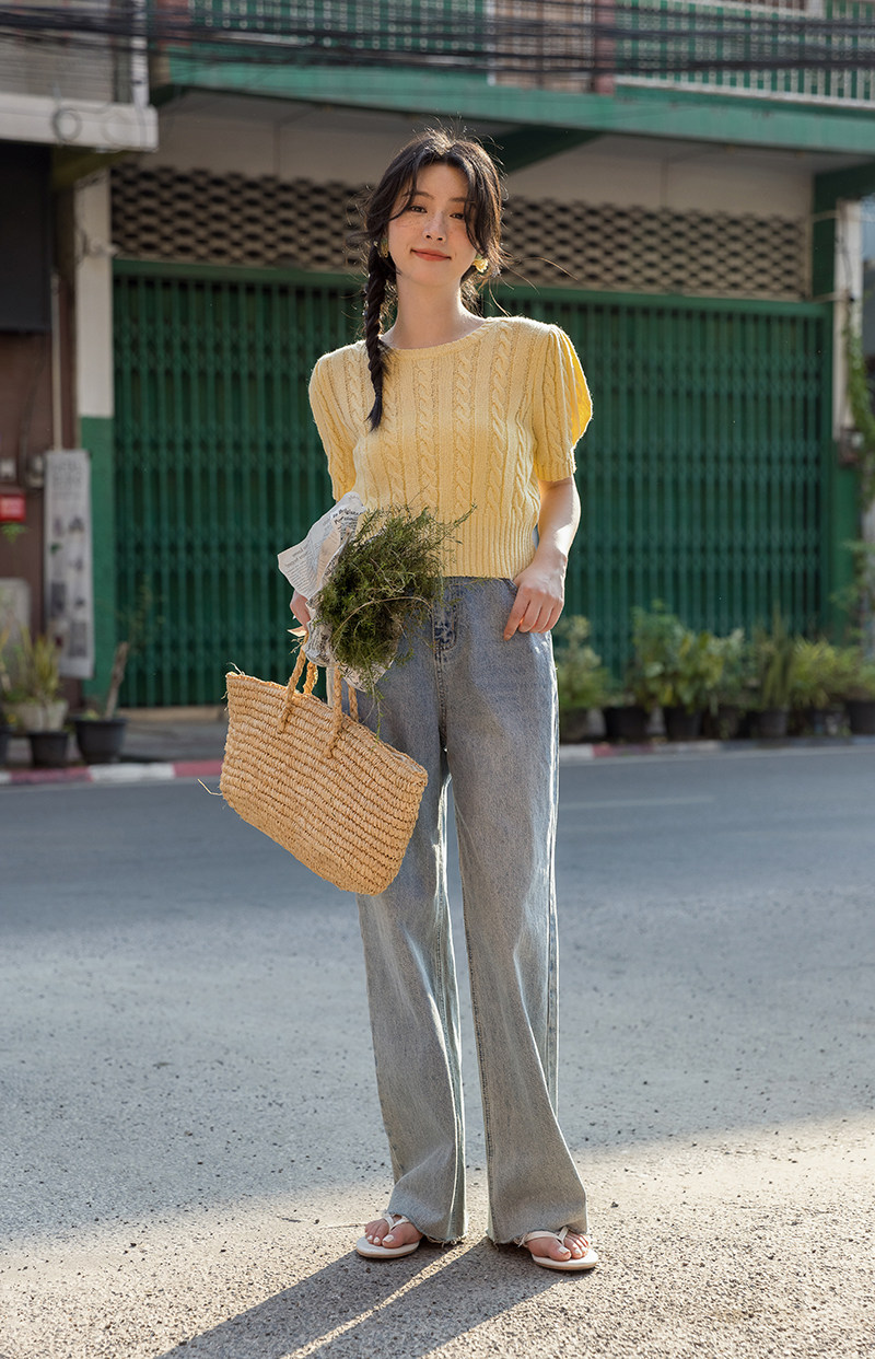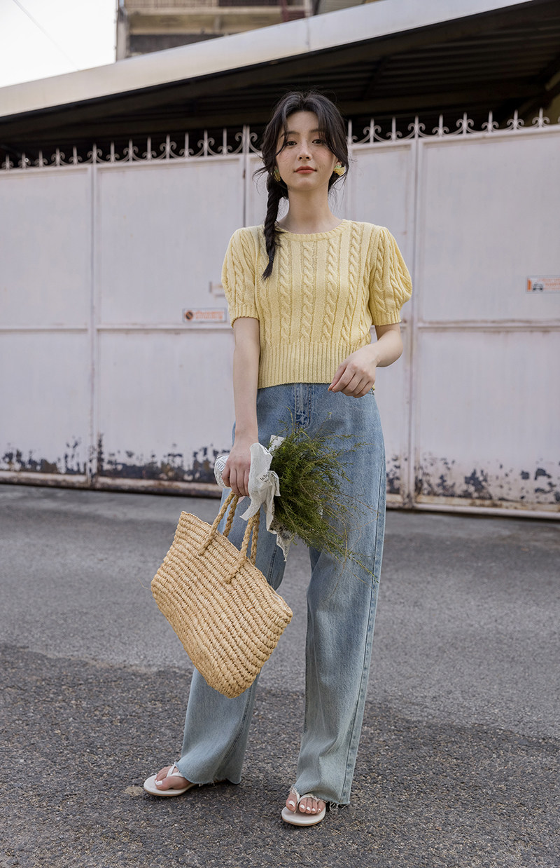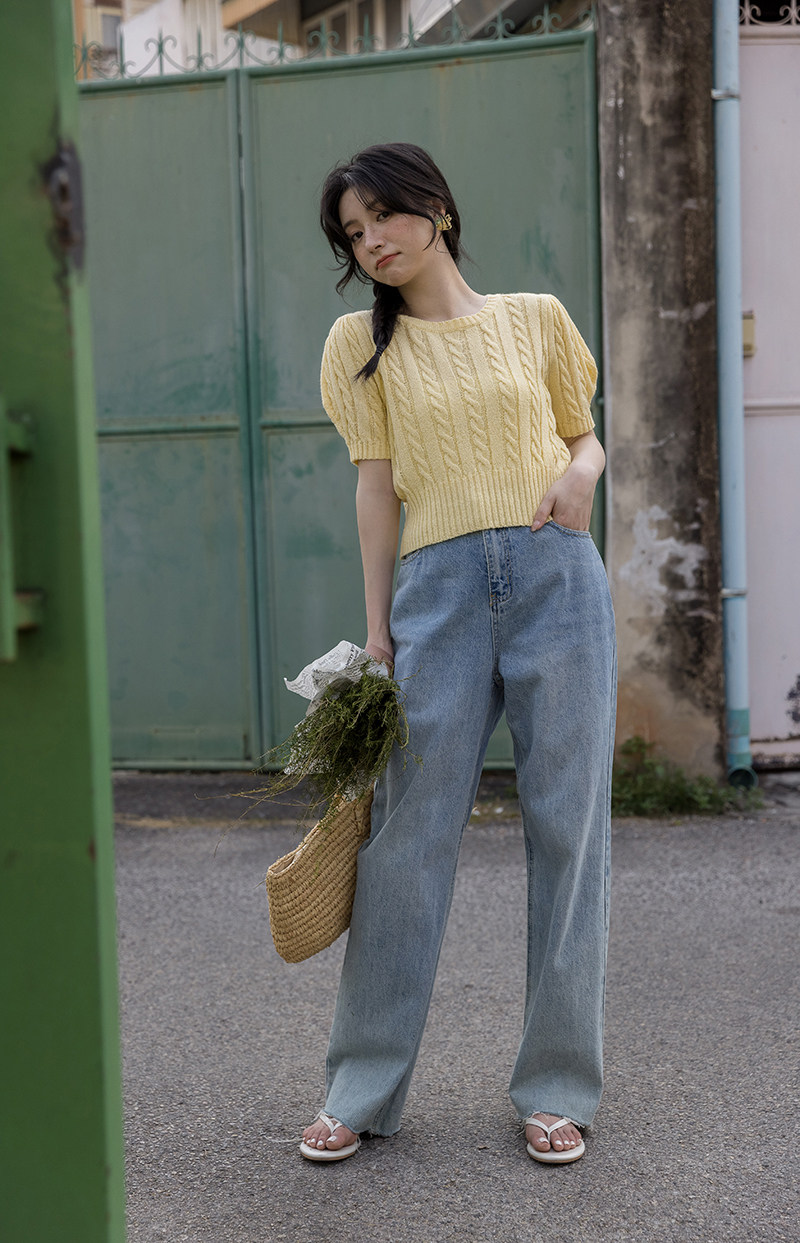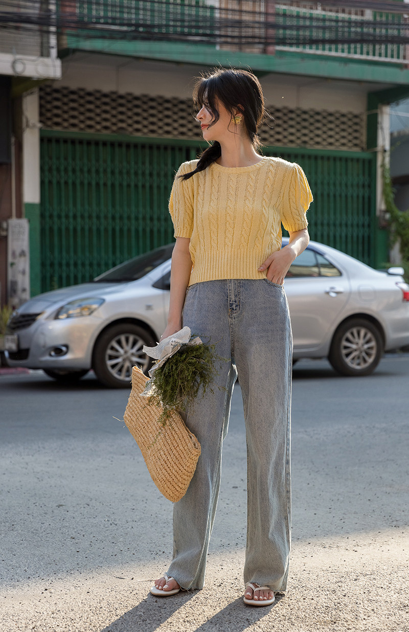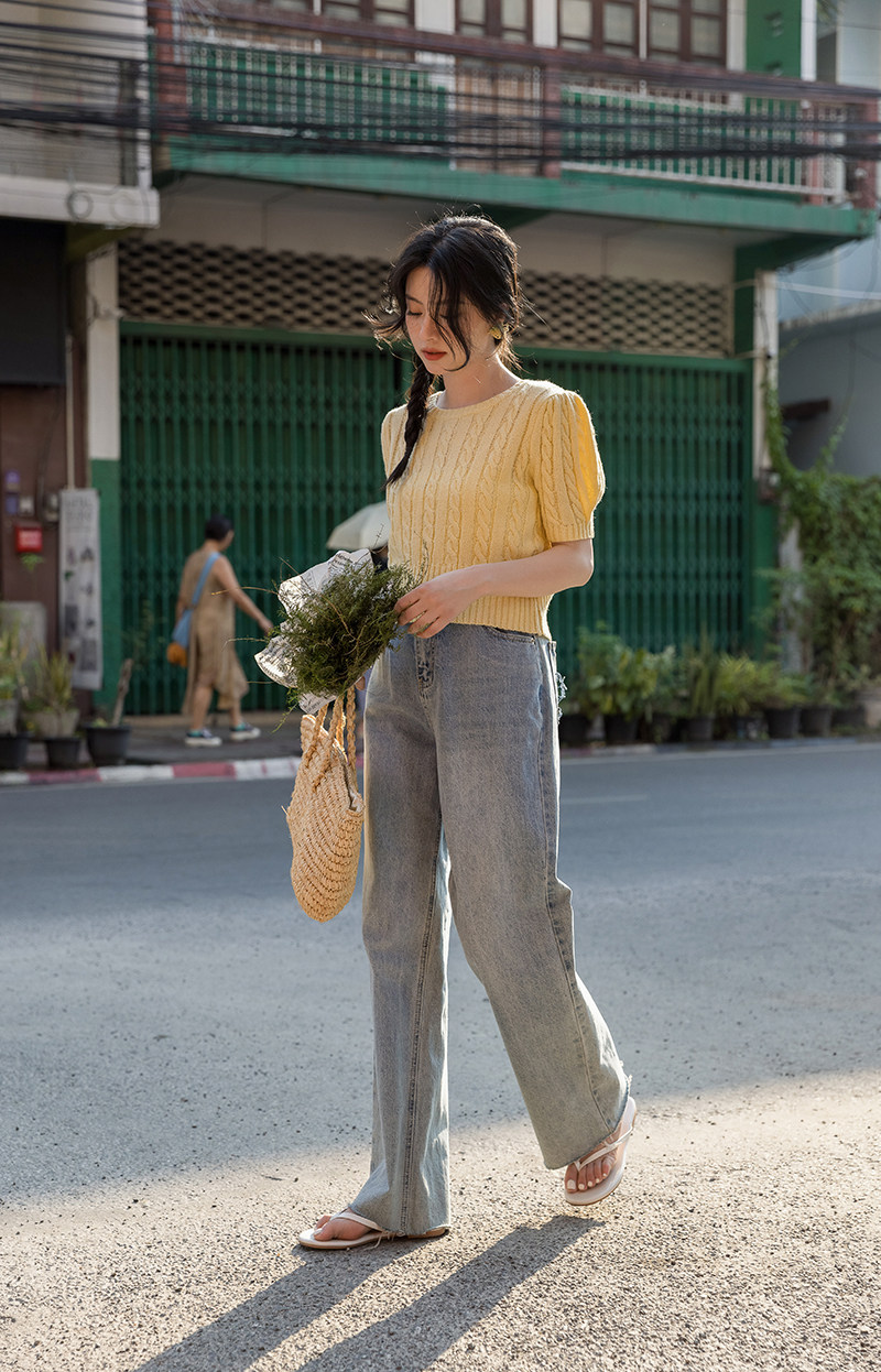 Трикотажный весенний дизайнерский короткий свитер, короткий рукав, 2023, тренд сезона, рукава фонарики, облегающий крой