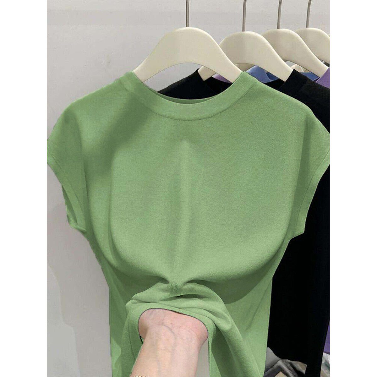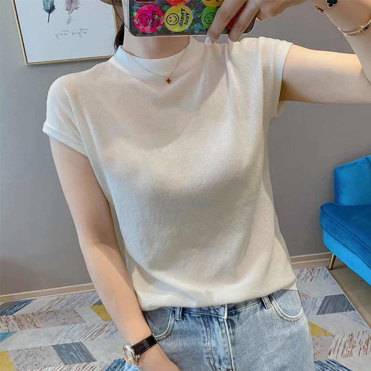 Белый трикотажный свитер без рукавов, летняя базовая тонкая футболка, высокий воротник, свободный крой