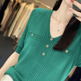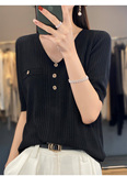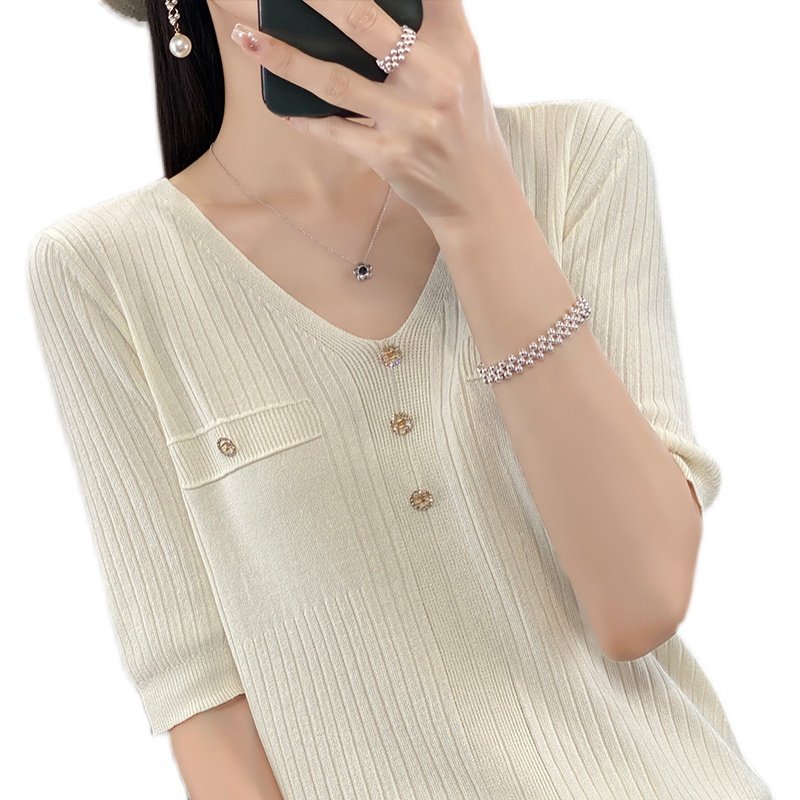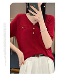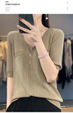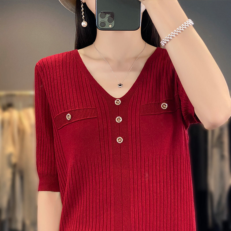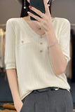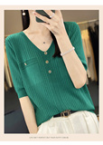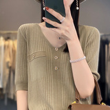 Летний шерстяной свитер, трикотажные базовые приятные телу нарукавники, V-образный вырез, короткий рукав, свободный крой