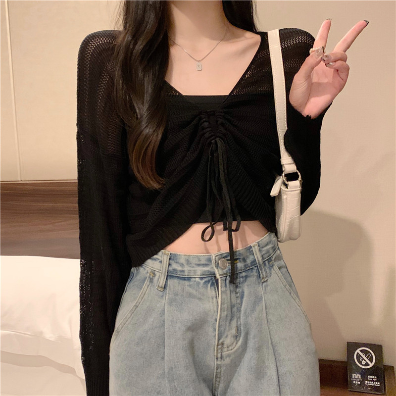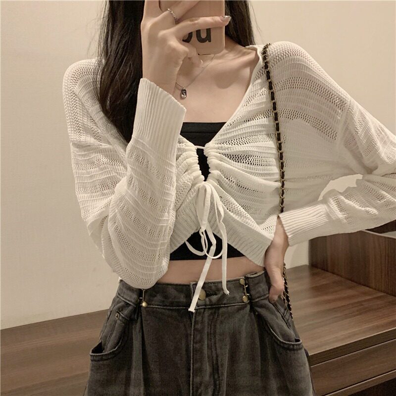 Белый трикотажный тонкий летний кардиган, лонгслив, эффект подтяжки, на шнурках