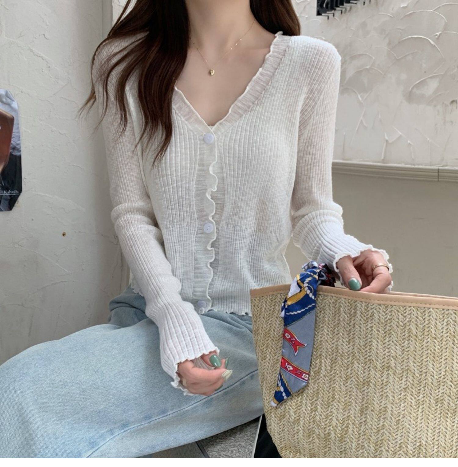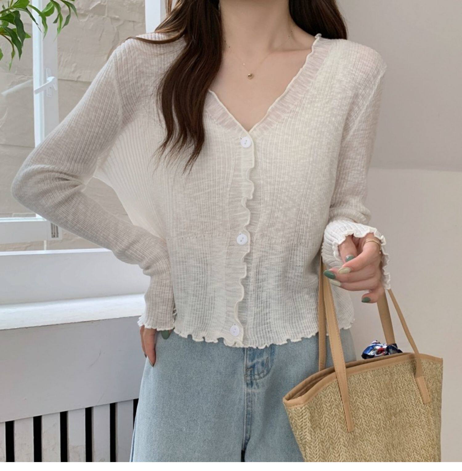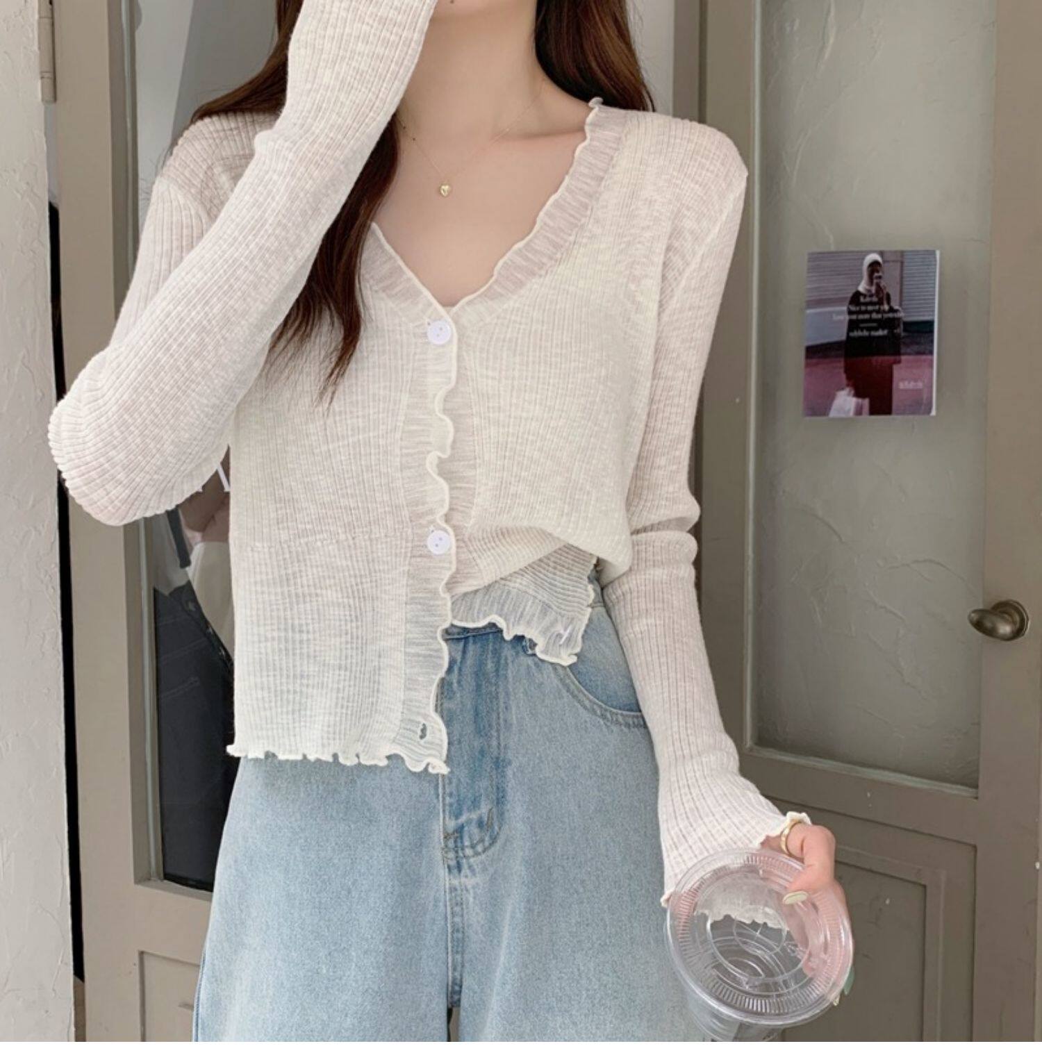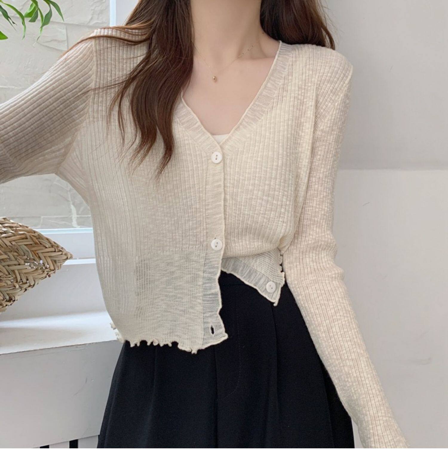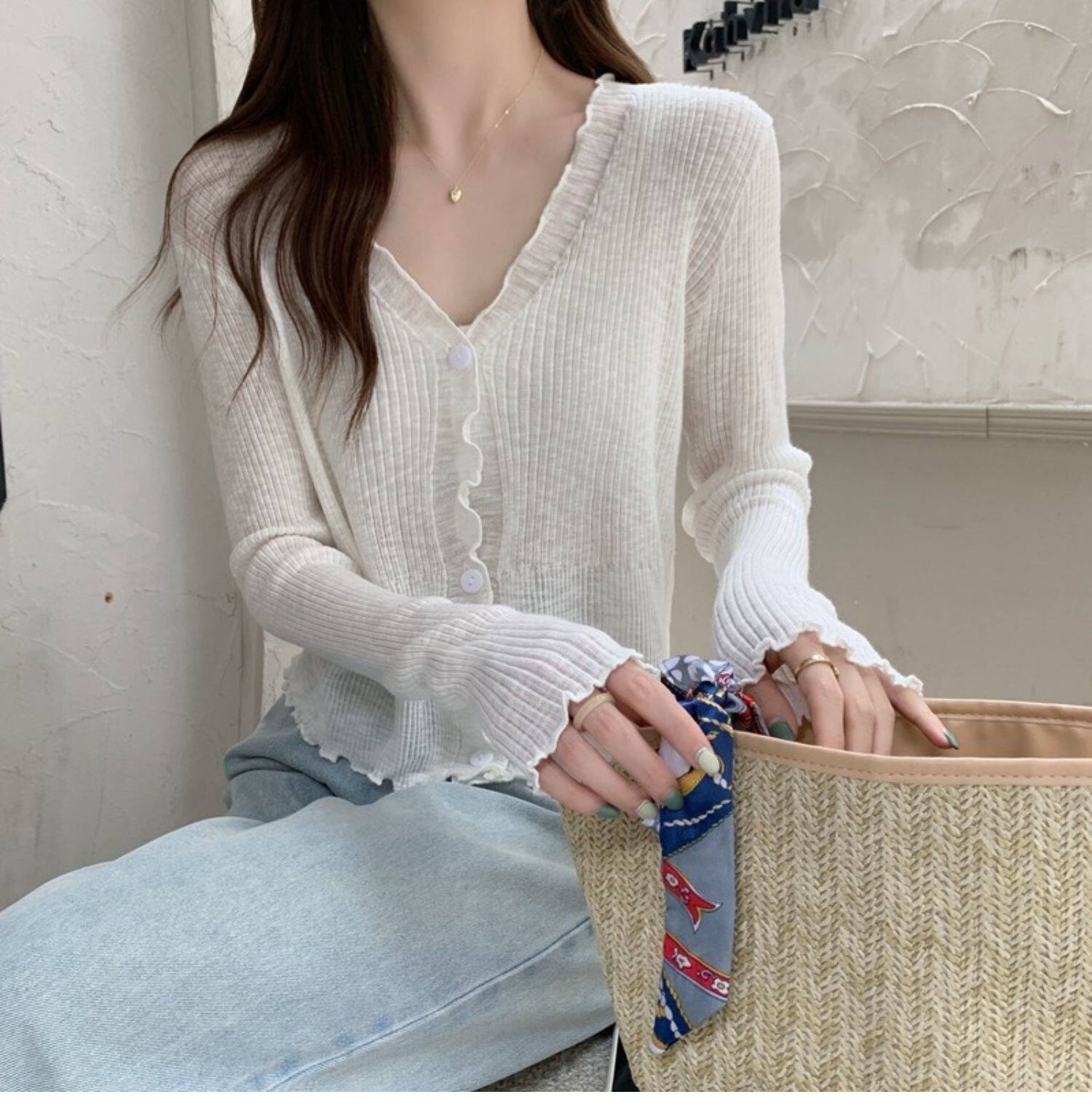 Тонкий трикотажный летний кардиган, накидка, лонгслив, белая куртка, в корейском стиле