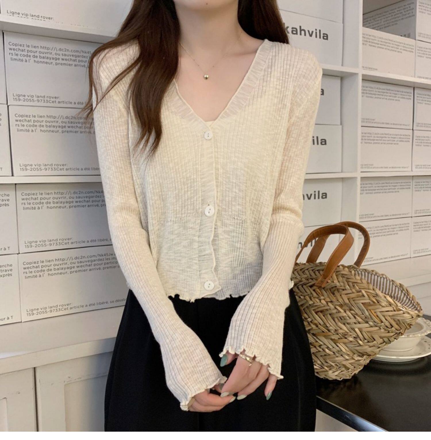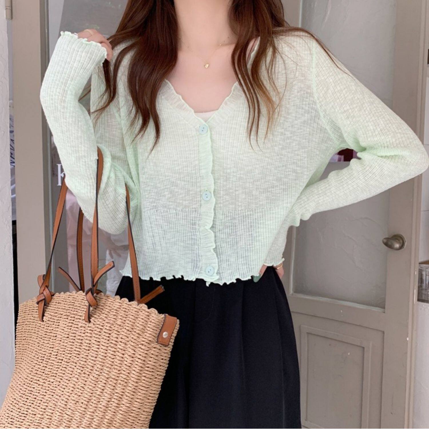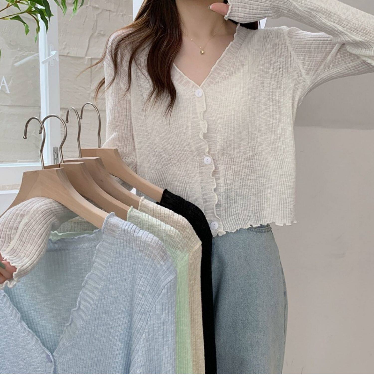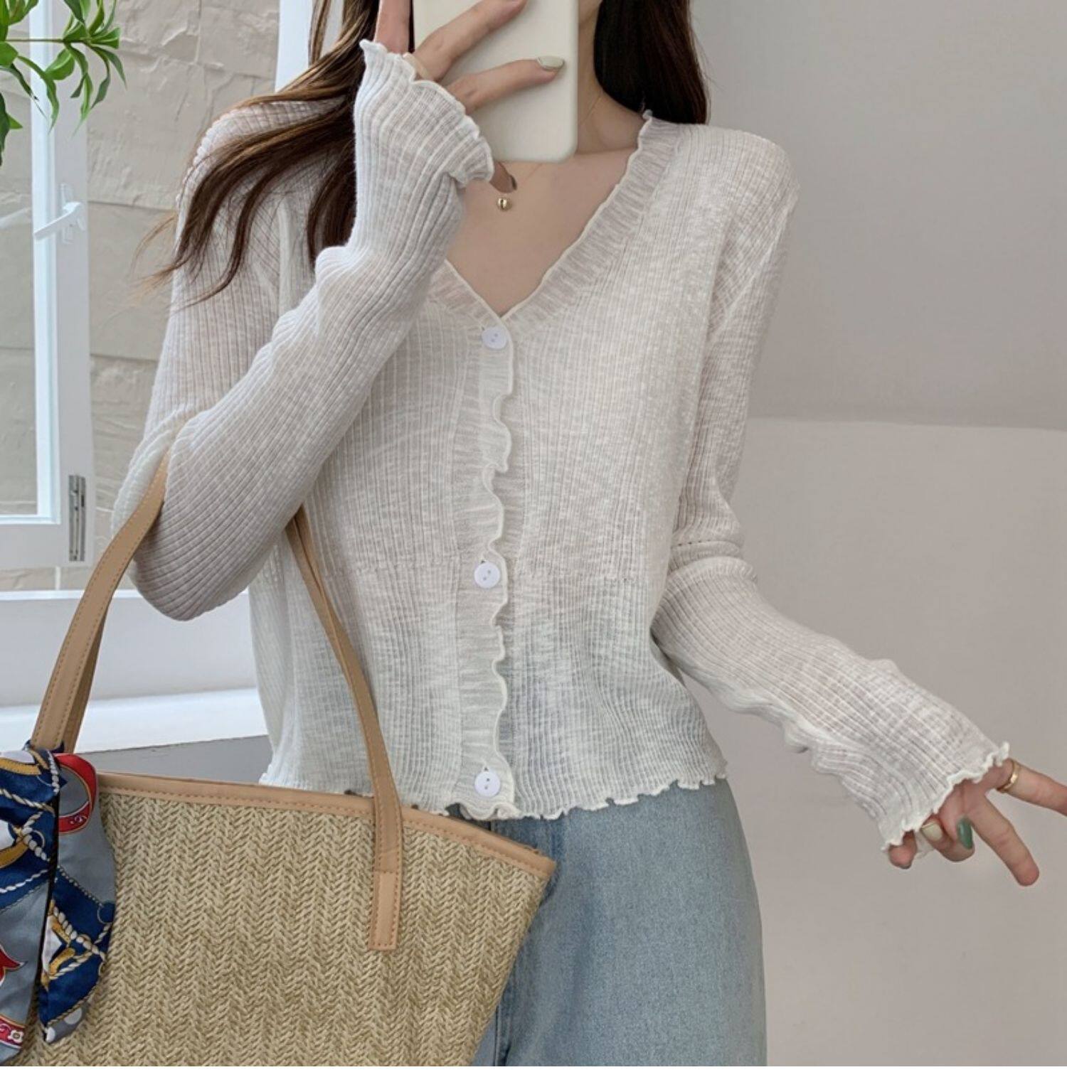 Тонкий трикотажный летний кардиган, накидка, лонгслив, белая куртка, в корейском стиле