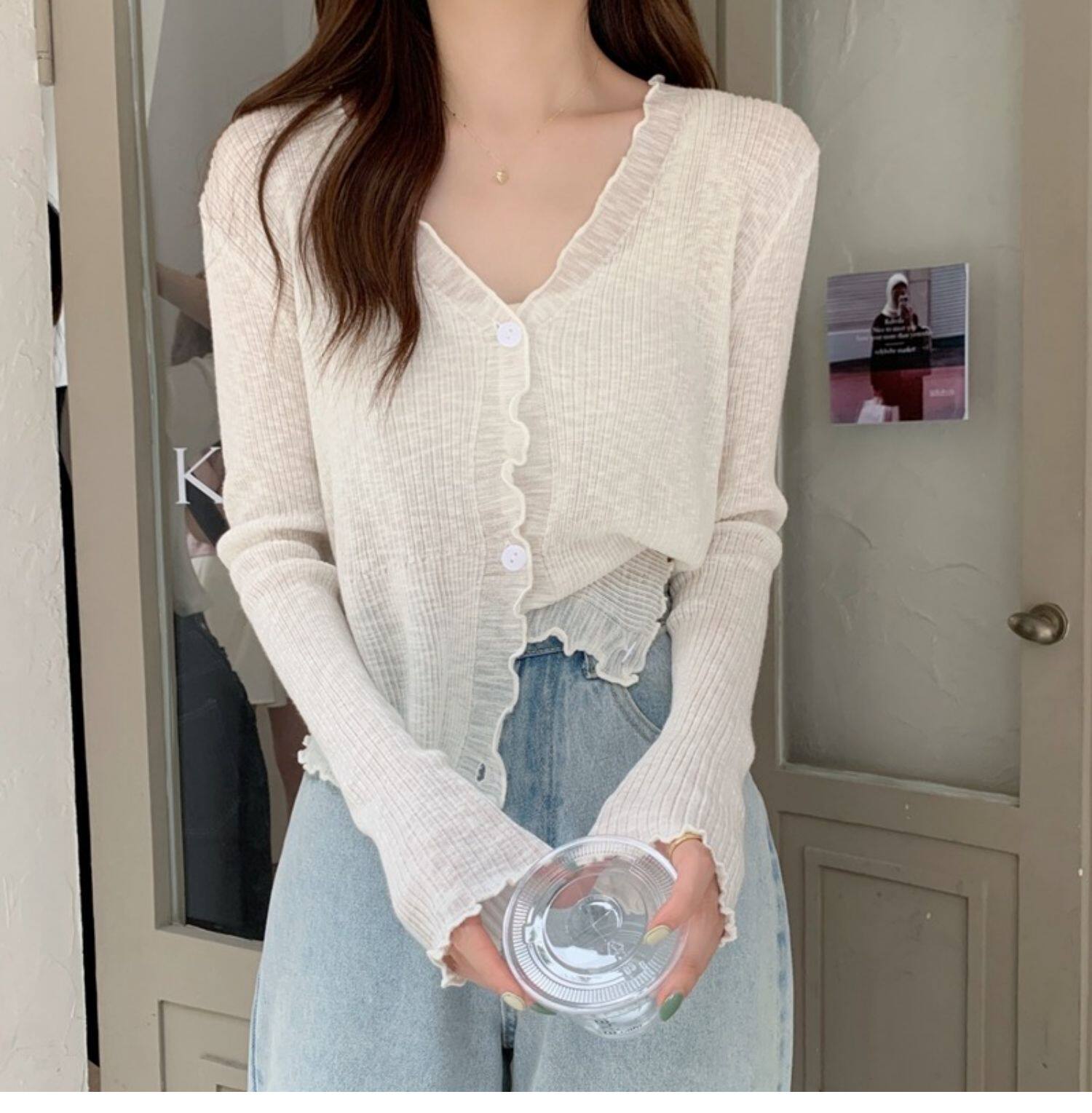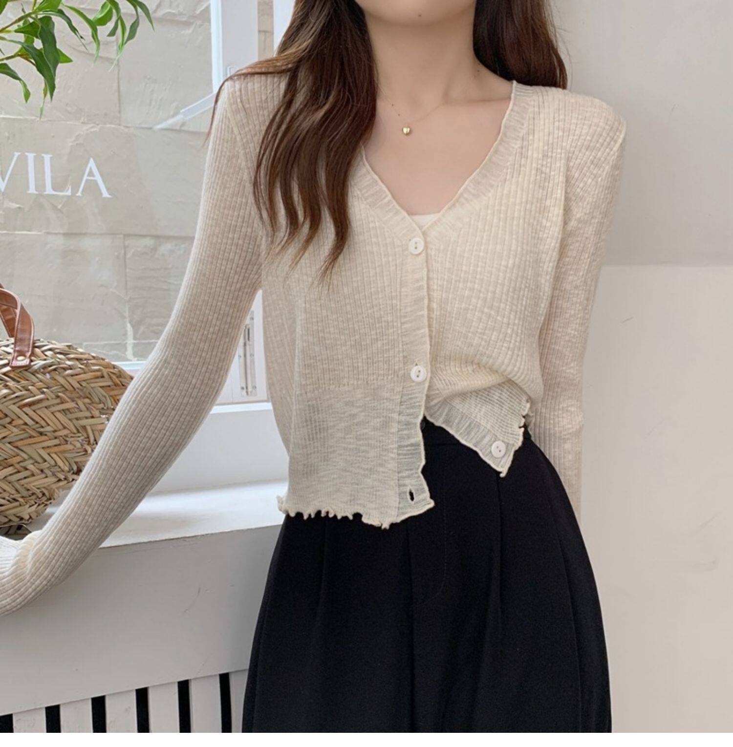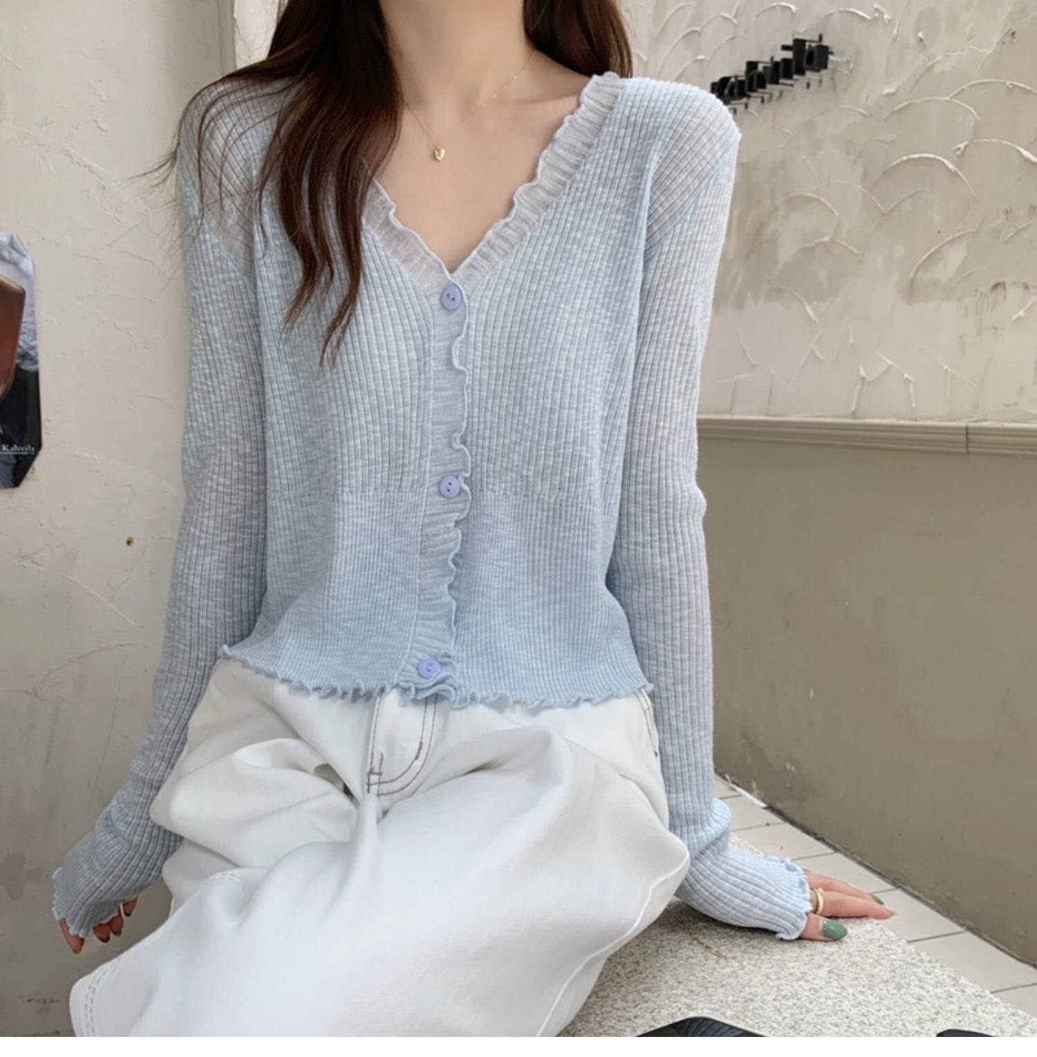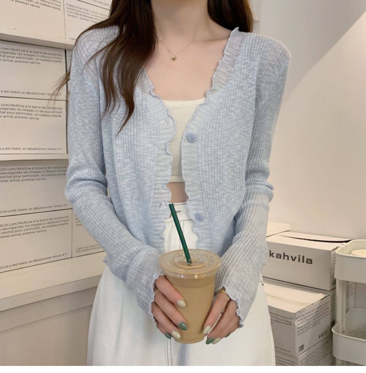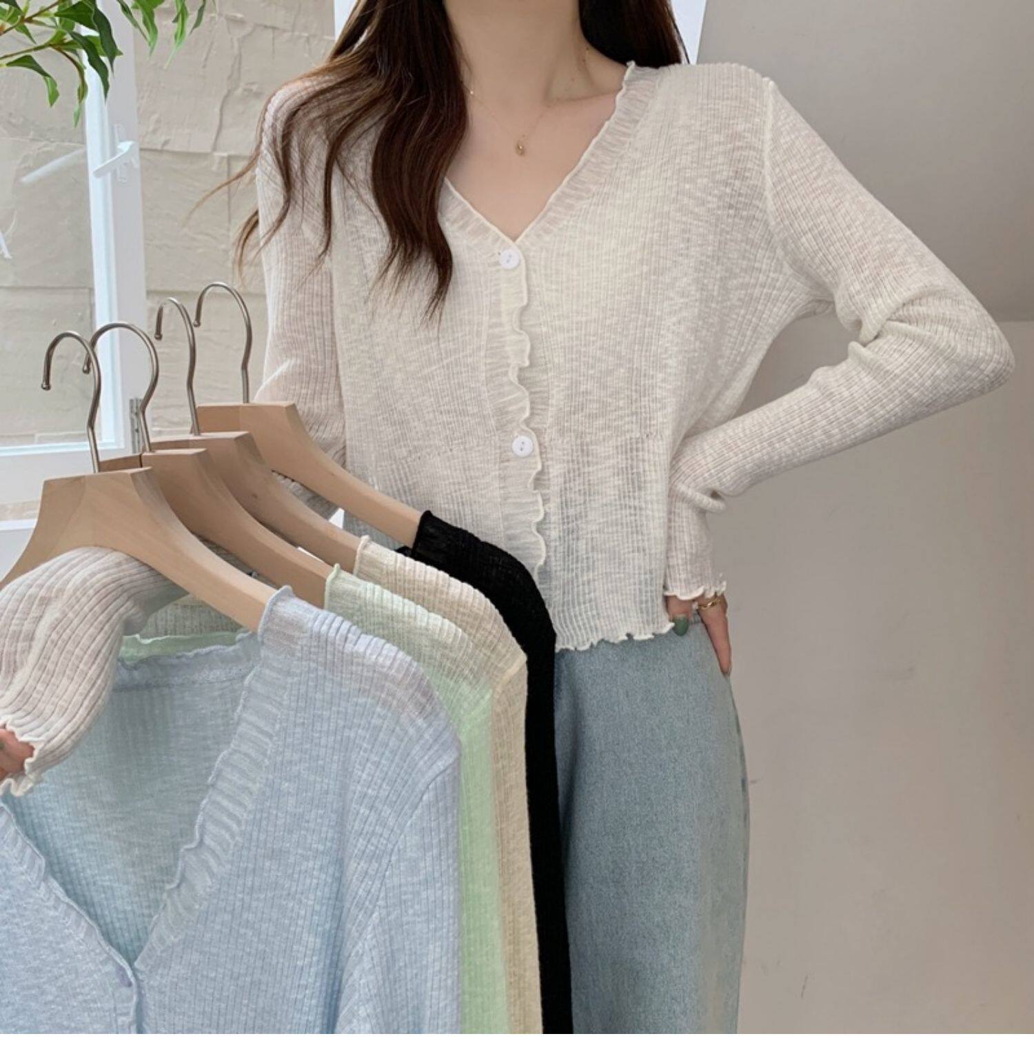 Тонкий трикотажный летний кардиган, накидка, лонгслив, белая куртка, в корейском стиле