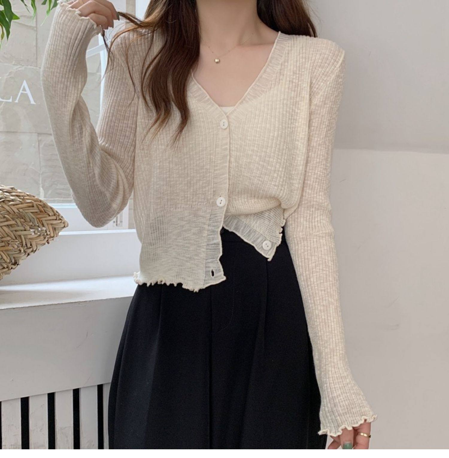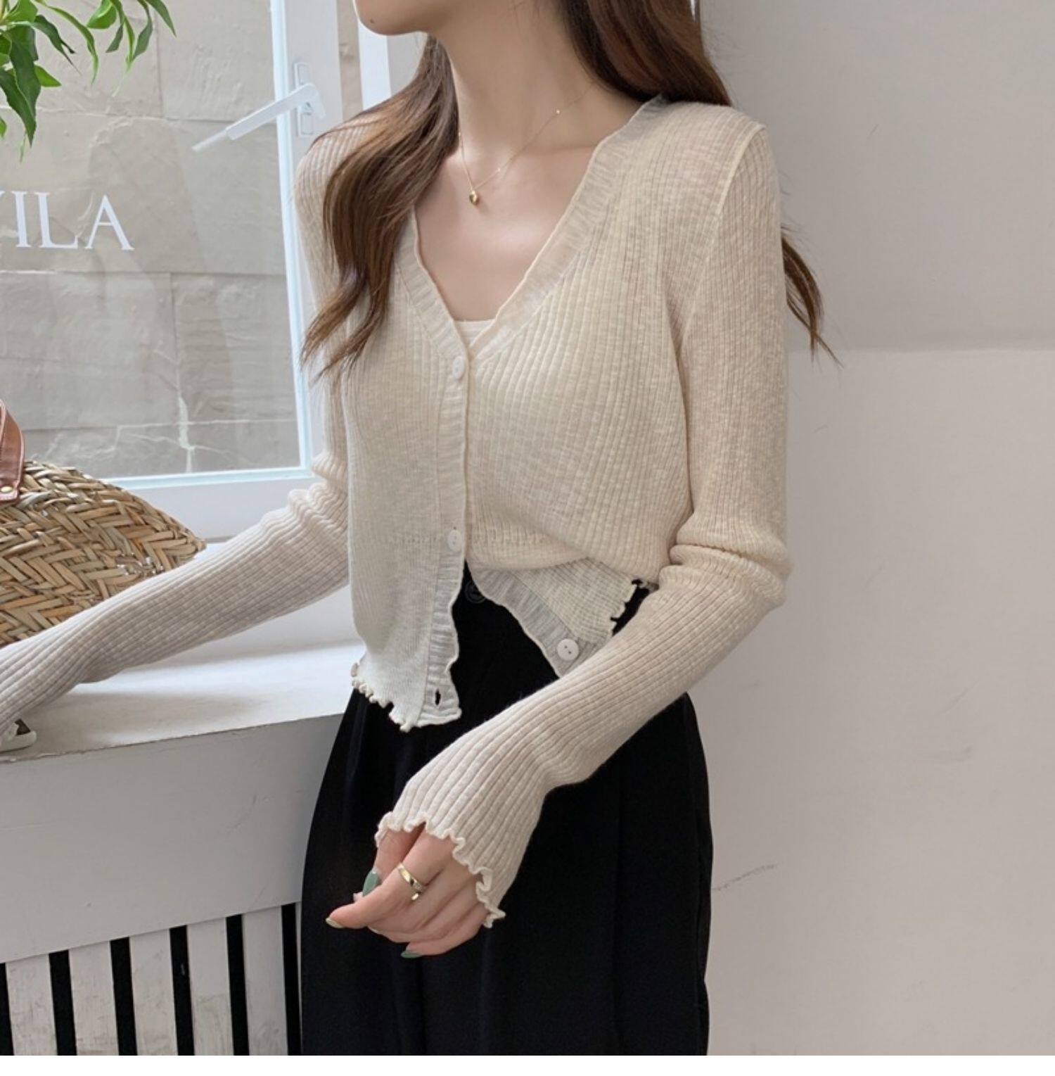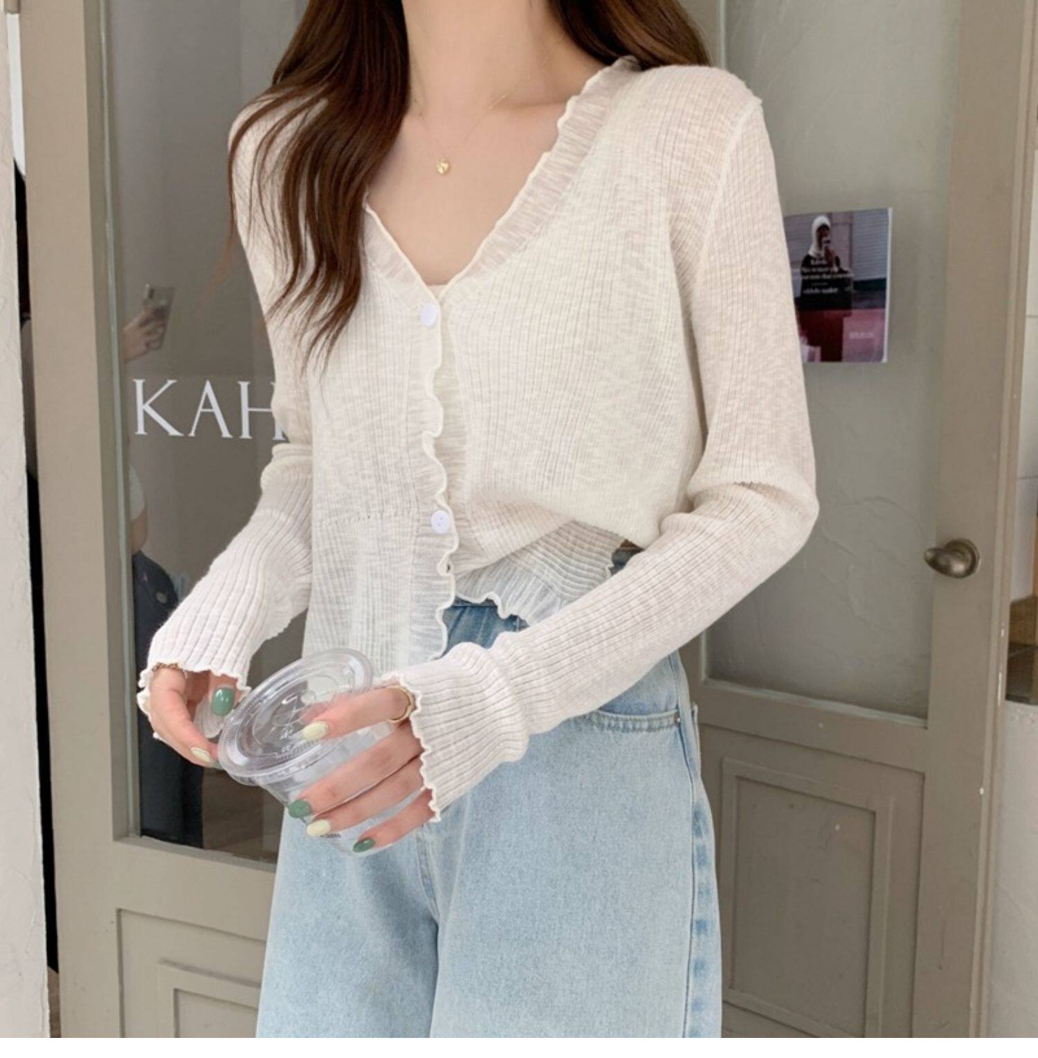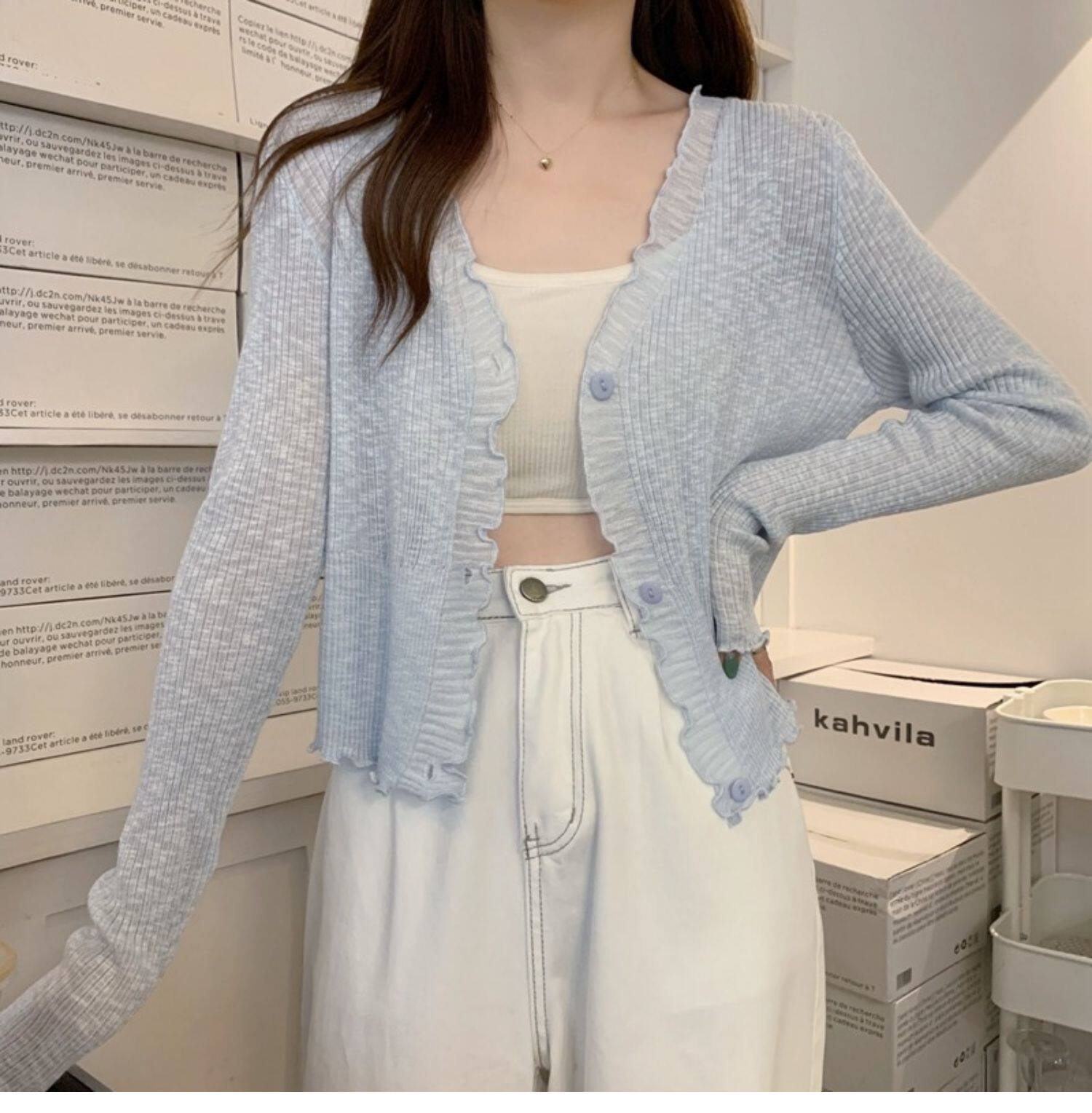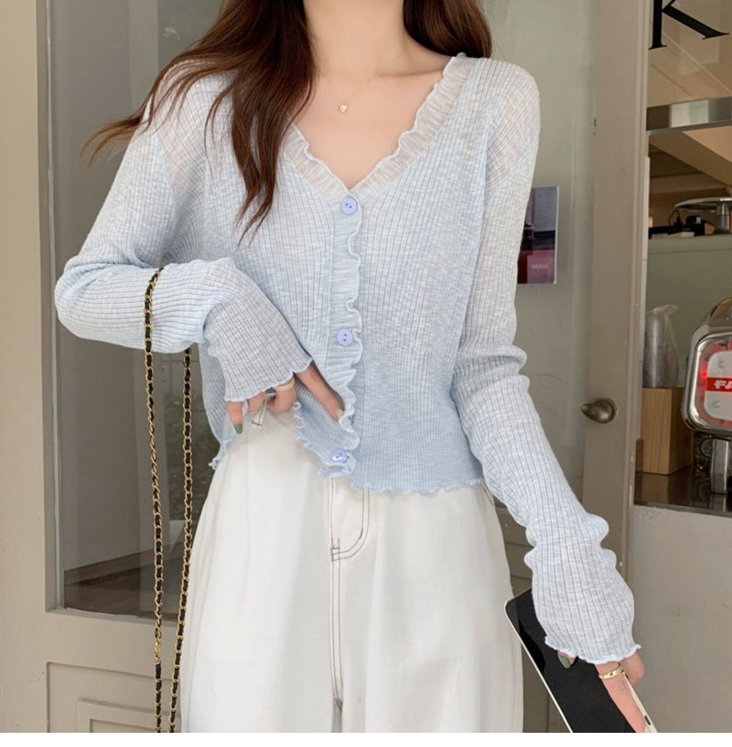 Тонкий трикотажный летний кардиган, накидка, лонгслив, белая куртка, в корейском стиле