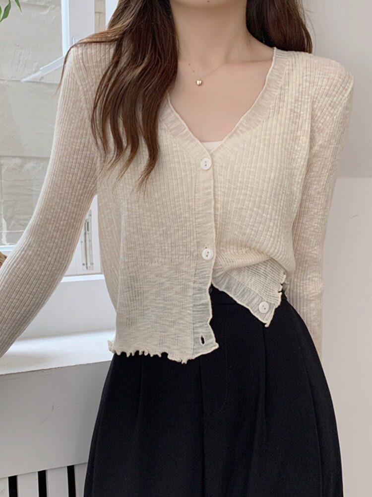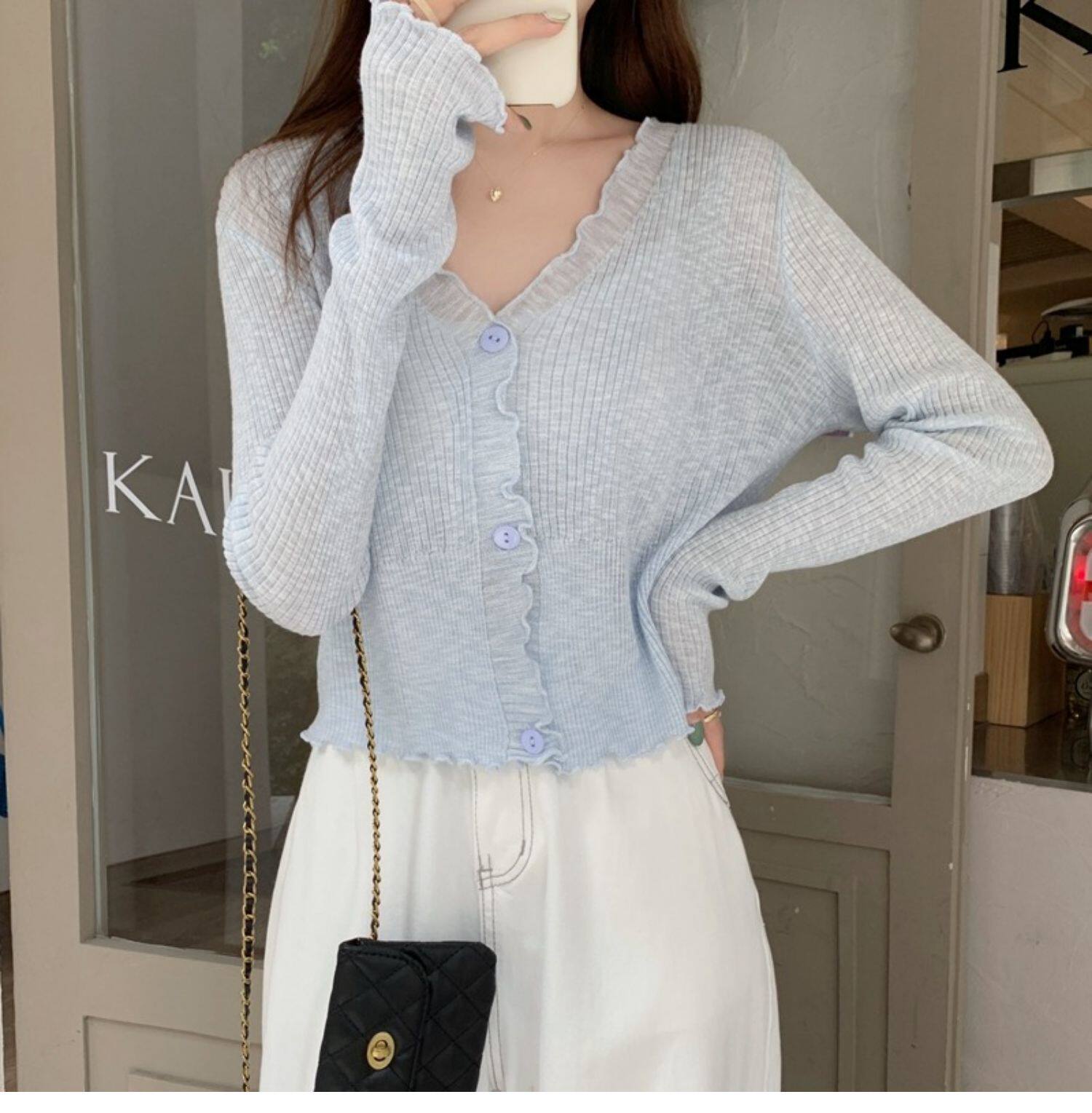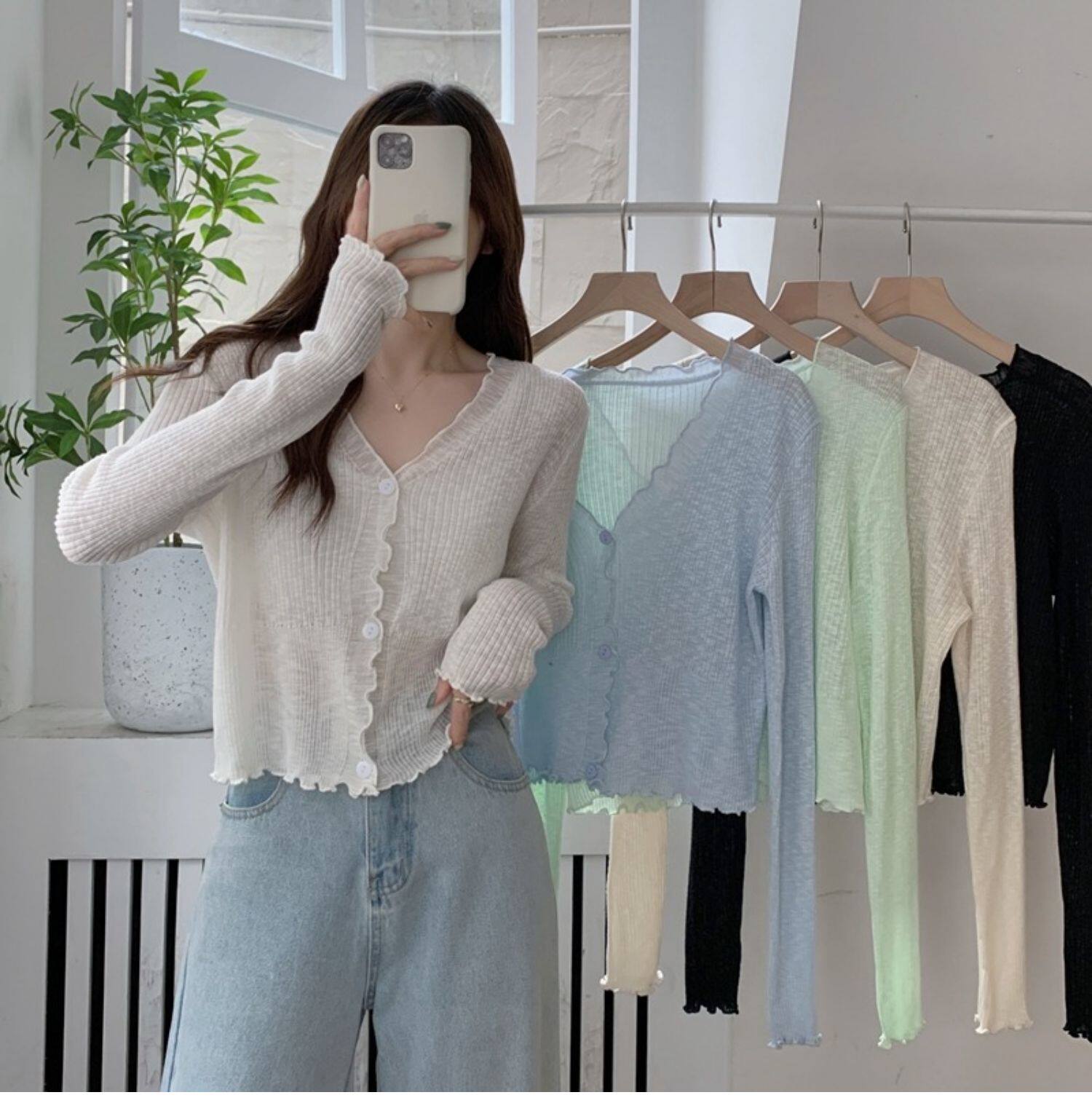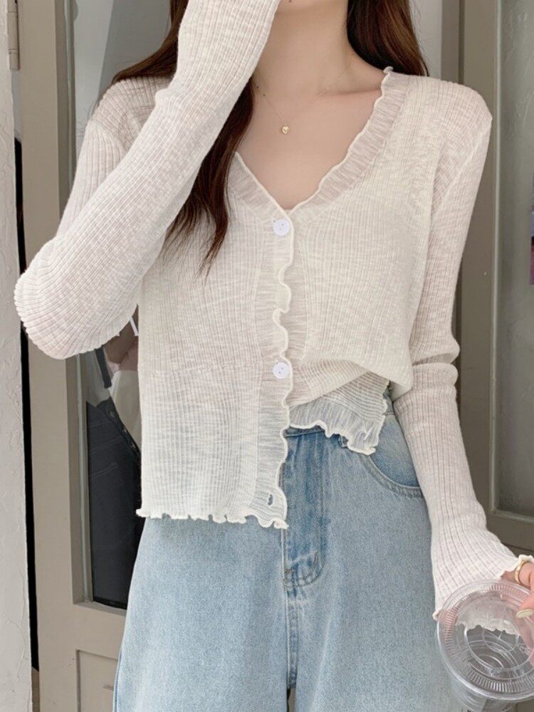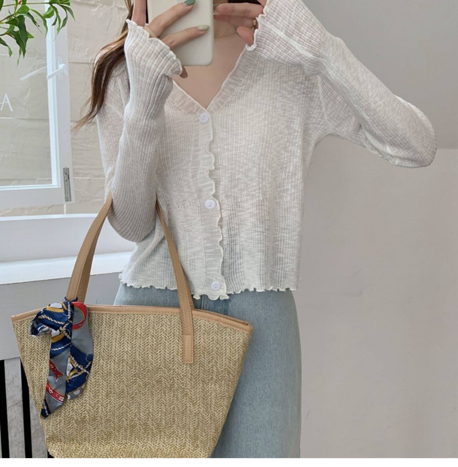 Тонкий трикотажный летний кардиган, накидка, лонгслив, белая куртка, в корейском стиле