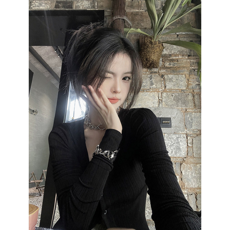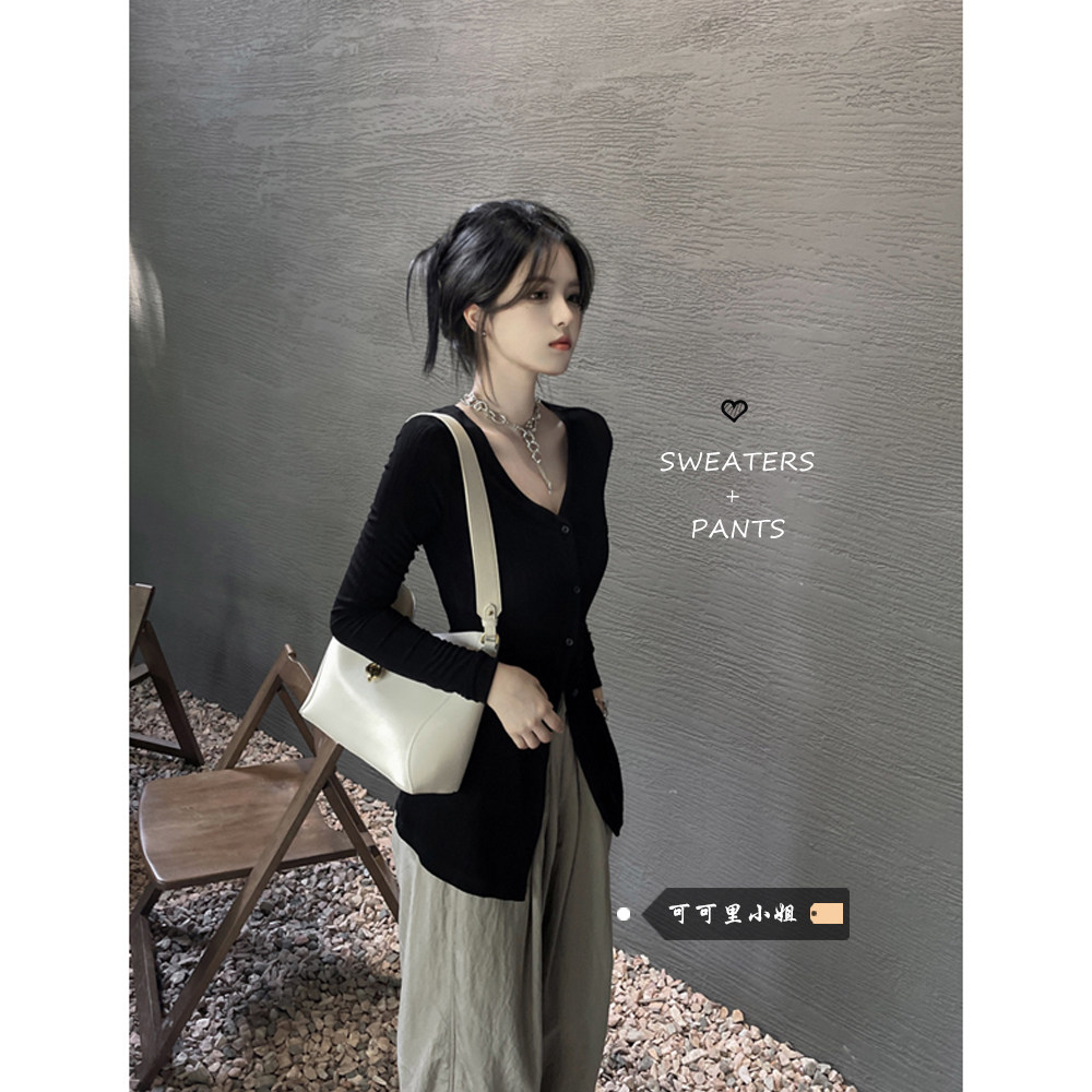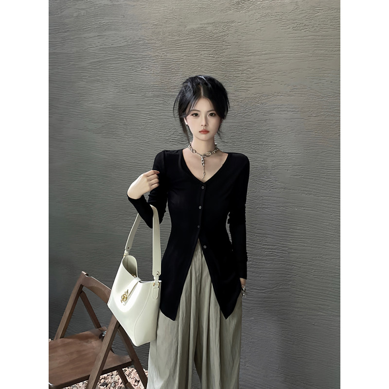 Тонкий трикотажный лонгслив, осенний кардиган, приталенный корсет, V-образный вырез, в корейском стиле