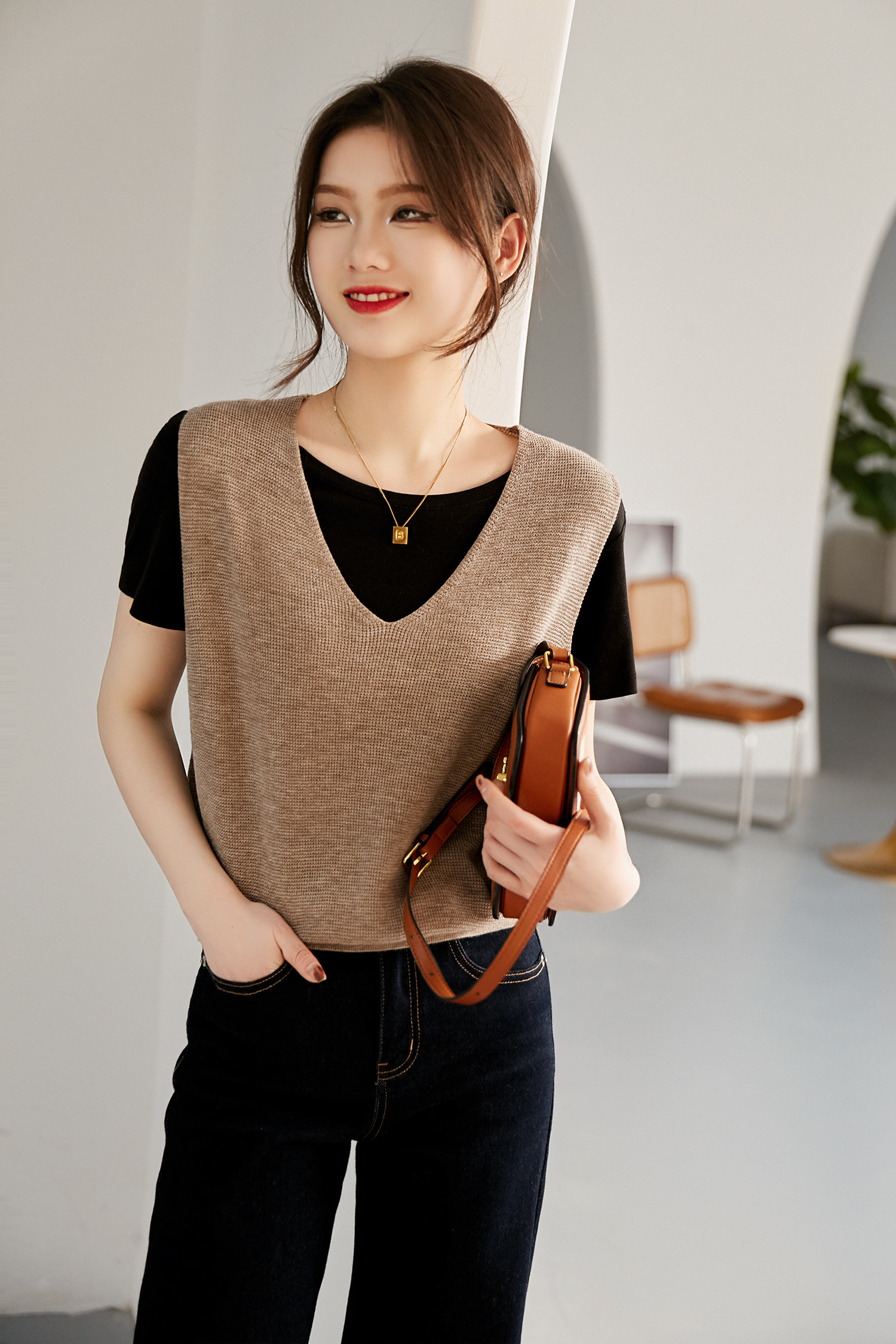 Японский тип коконаV -neck вязаный жилет