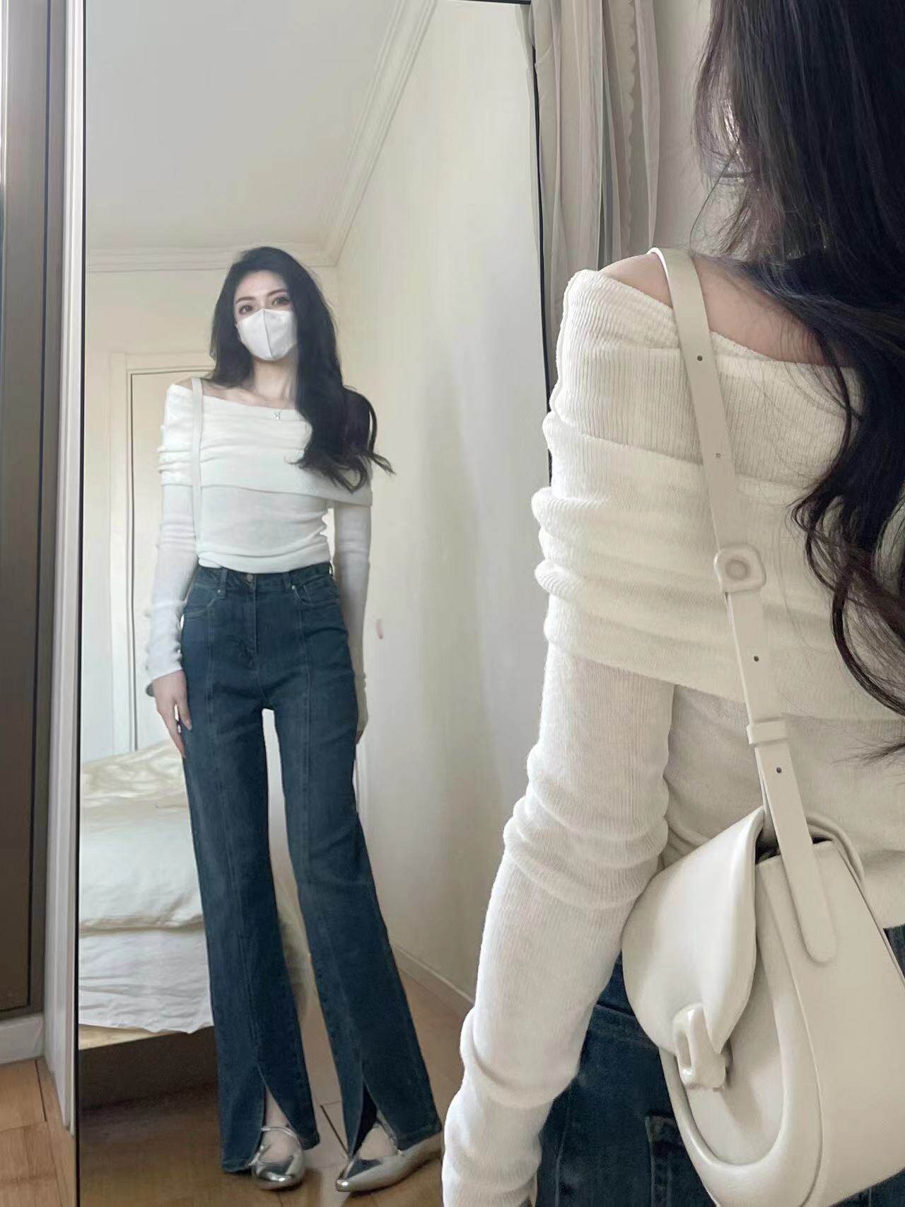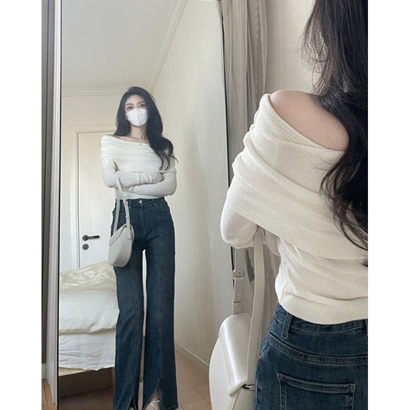 Белый цветной лонгслив, весенний базовый приятный телу свитер, французский стиль, изысканный стиль, открытые плечи
