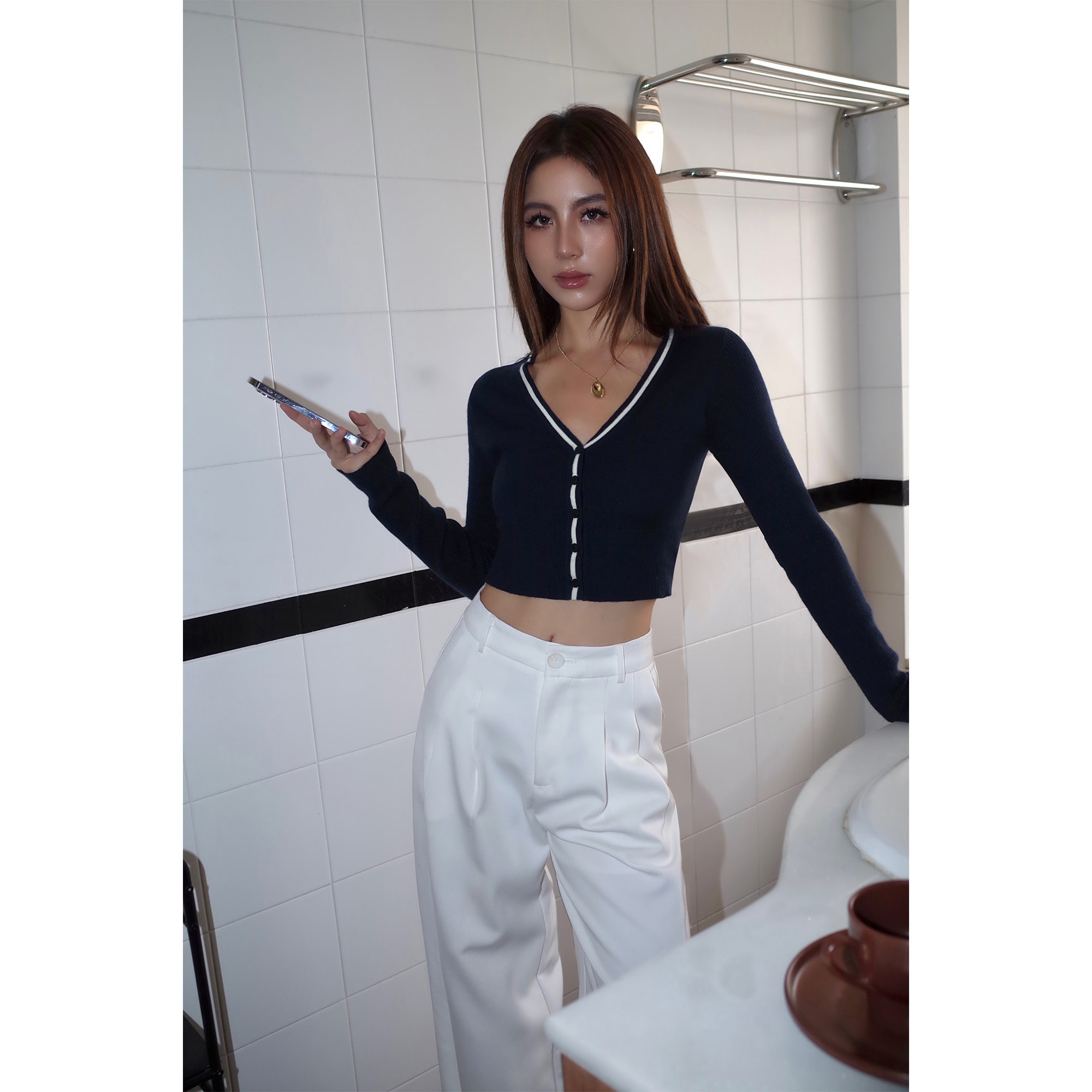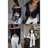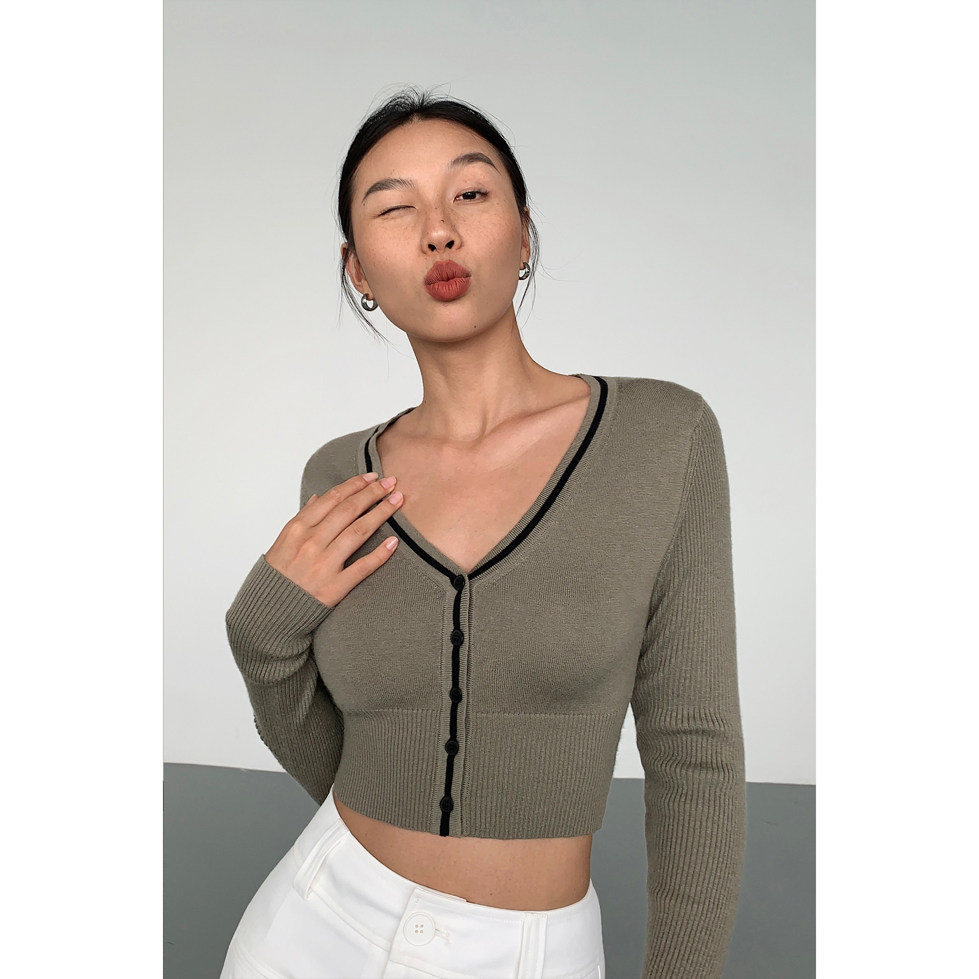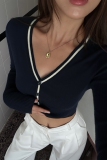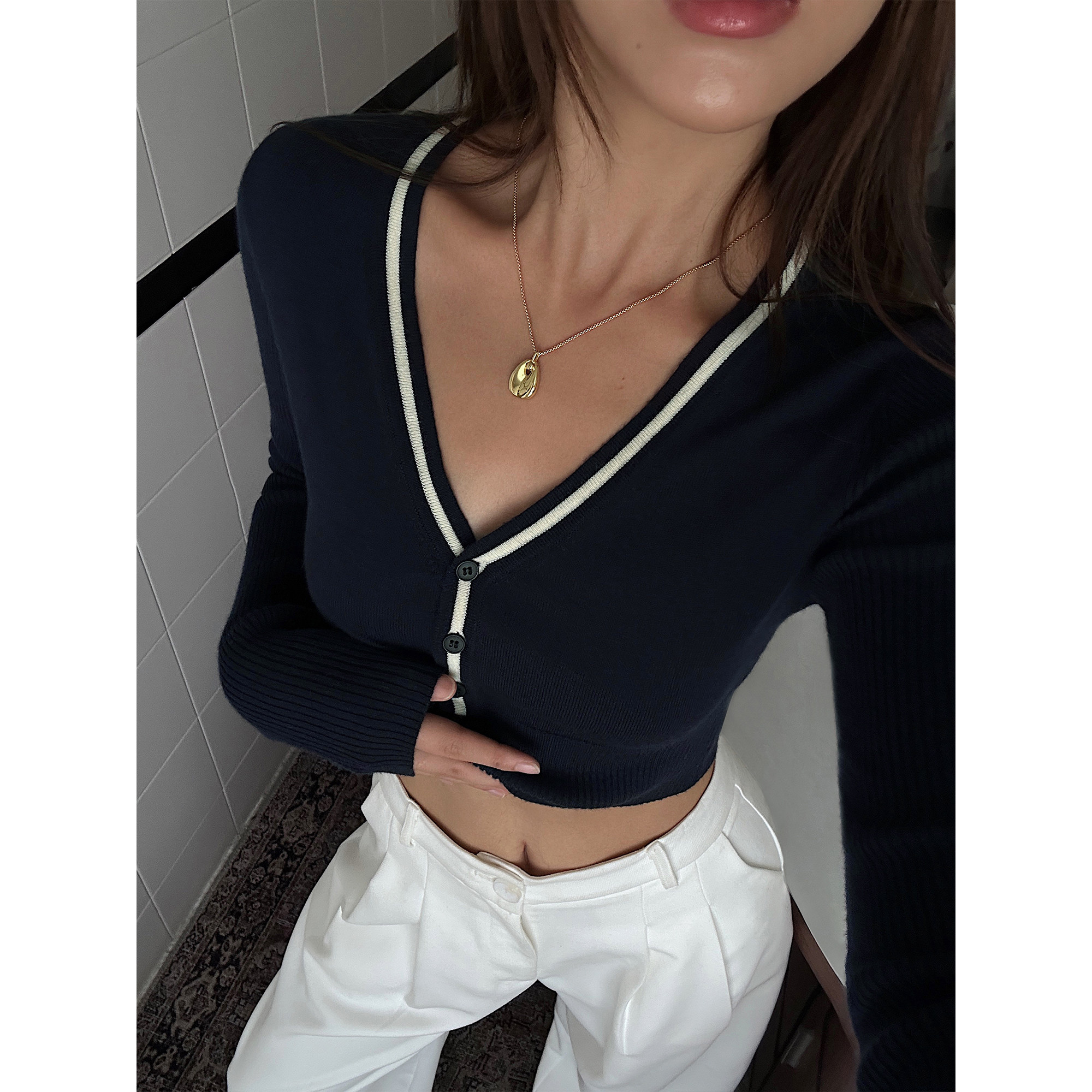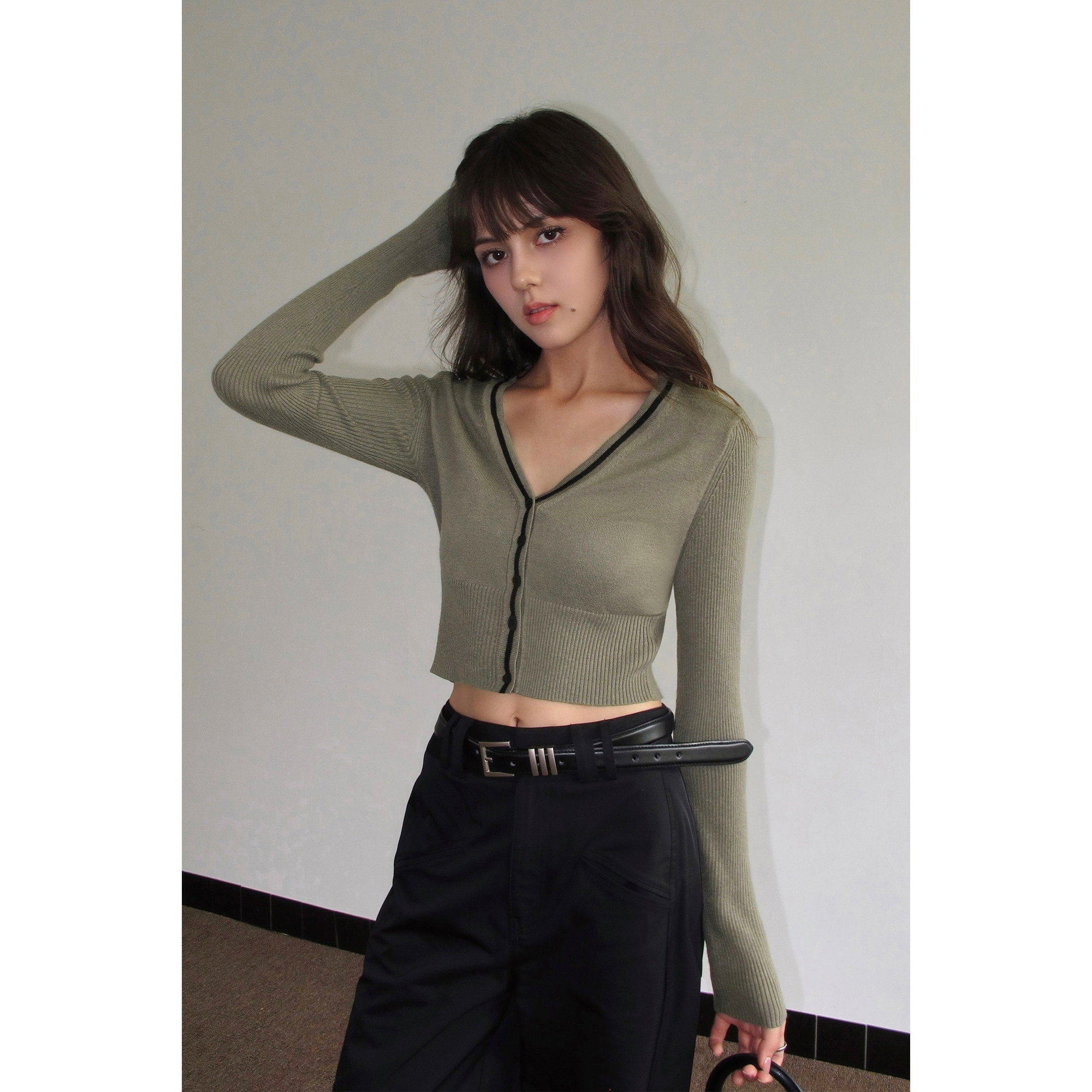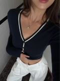 Черный лонгслив, осенний приталенный короткий кардиган, V-образный вырез