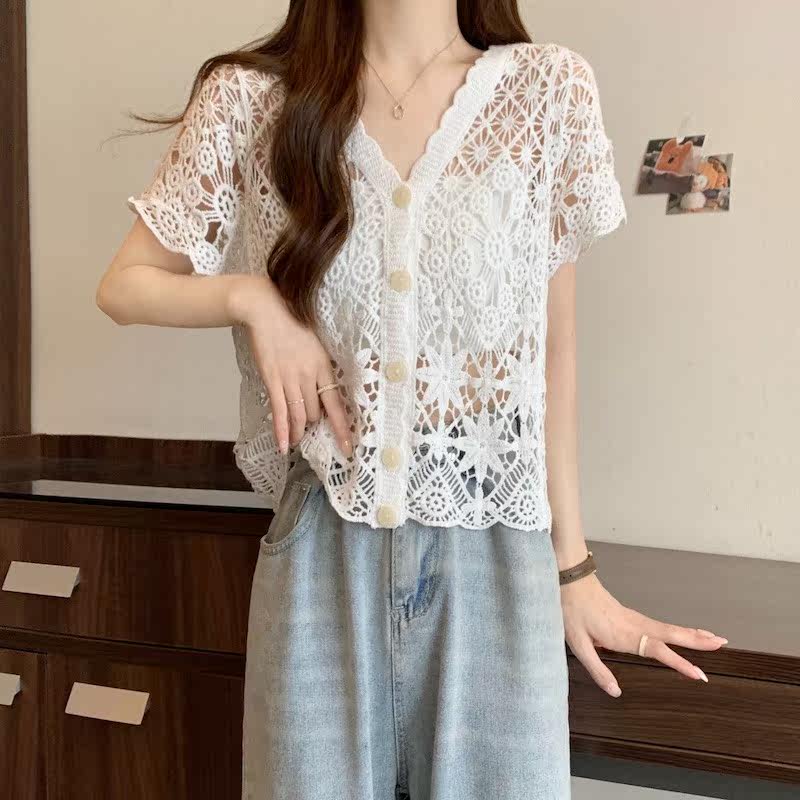 Трикотажный летний тонкий кардиган, большой размер, короткий рукав, свободный крой, V-образный вырез